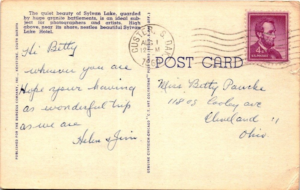 MAKE AN OFFER. THE MORE YOU BUY THE BETTER DEAL I WILL ACCEPT The postcard features a photo of Sylvan Lake in Custer State Park, Black Hills, South Dakota. The lake is surrounded by large granite formations and is described as a picturesque spot for photographers and artists. The Sylvan Lake Hotel is mentioned as being located near the shore.