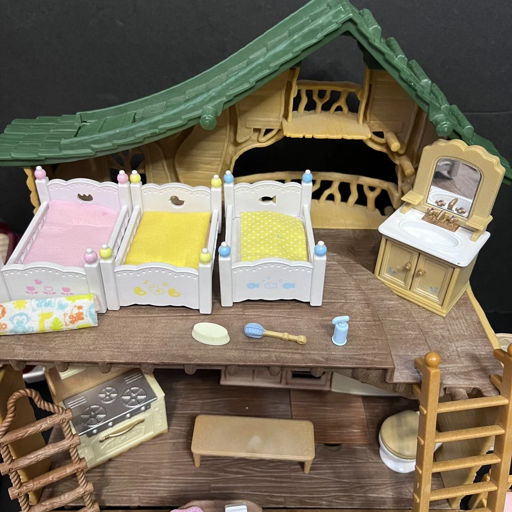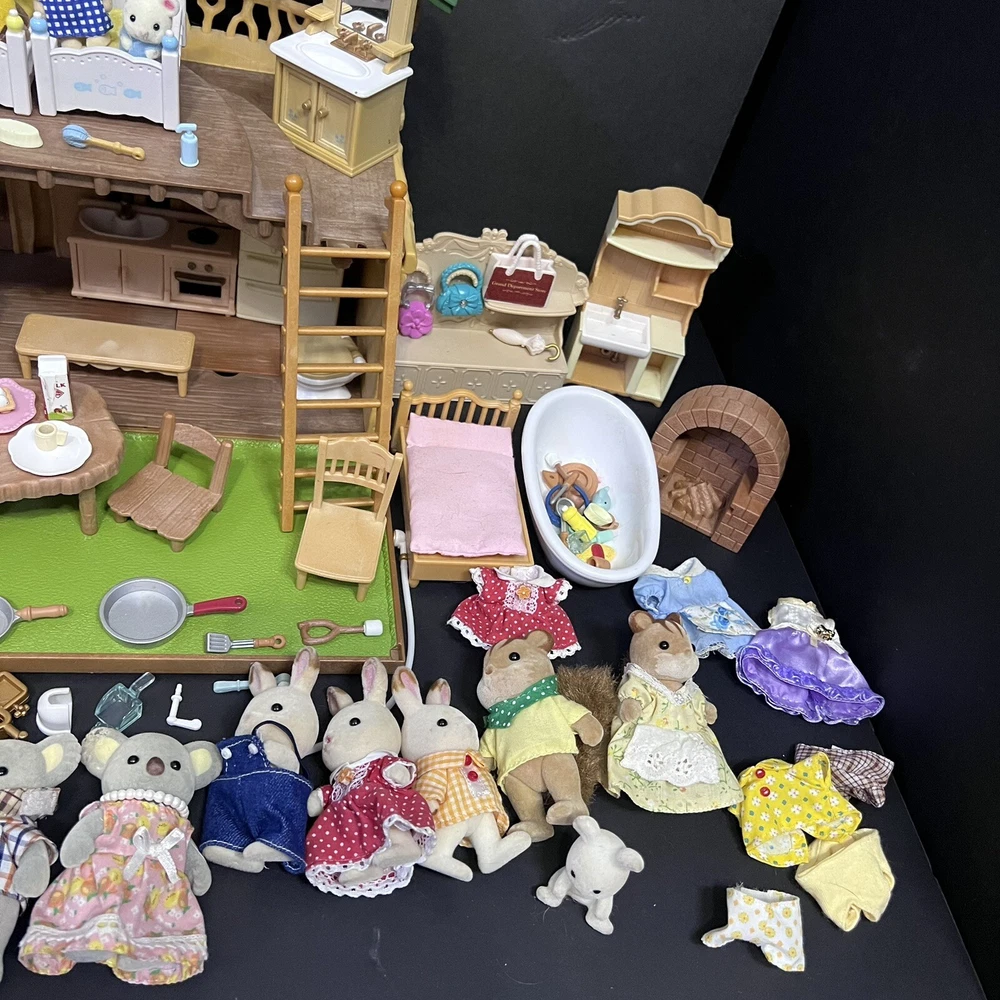 •Sylvanian Families/ Calico Critters Lakeside Lodge Play House. •Epoch Co, Ltd Calico Critters Cherry Cruiser Red Coupe Roadster Holds 5 Critters. Car needs a deeper cleaning. •Baby castle playground. (Some Stickers are peeling off. ) •22 Animal dolls. -9 cats -3 Koalas ( mom has damage on the ear.) -4 Bunnies (one bunny in missing a tail) -2 Chipmunks -2 Baby Hedgehogs -1 baby yellow lab -1 baby white mouse /gerbil?? Mixed assortment of furniture and accessories. Tables, chairs, refrigerators, tub, fireplace, shower and bathing accessories, campfire accessories, purses. Please refer to ALL photos. You will receive every item as photographed. Most Items are in played with condition. Some were only displayed on a shelf, some have some light wear.