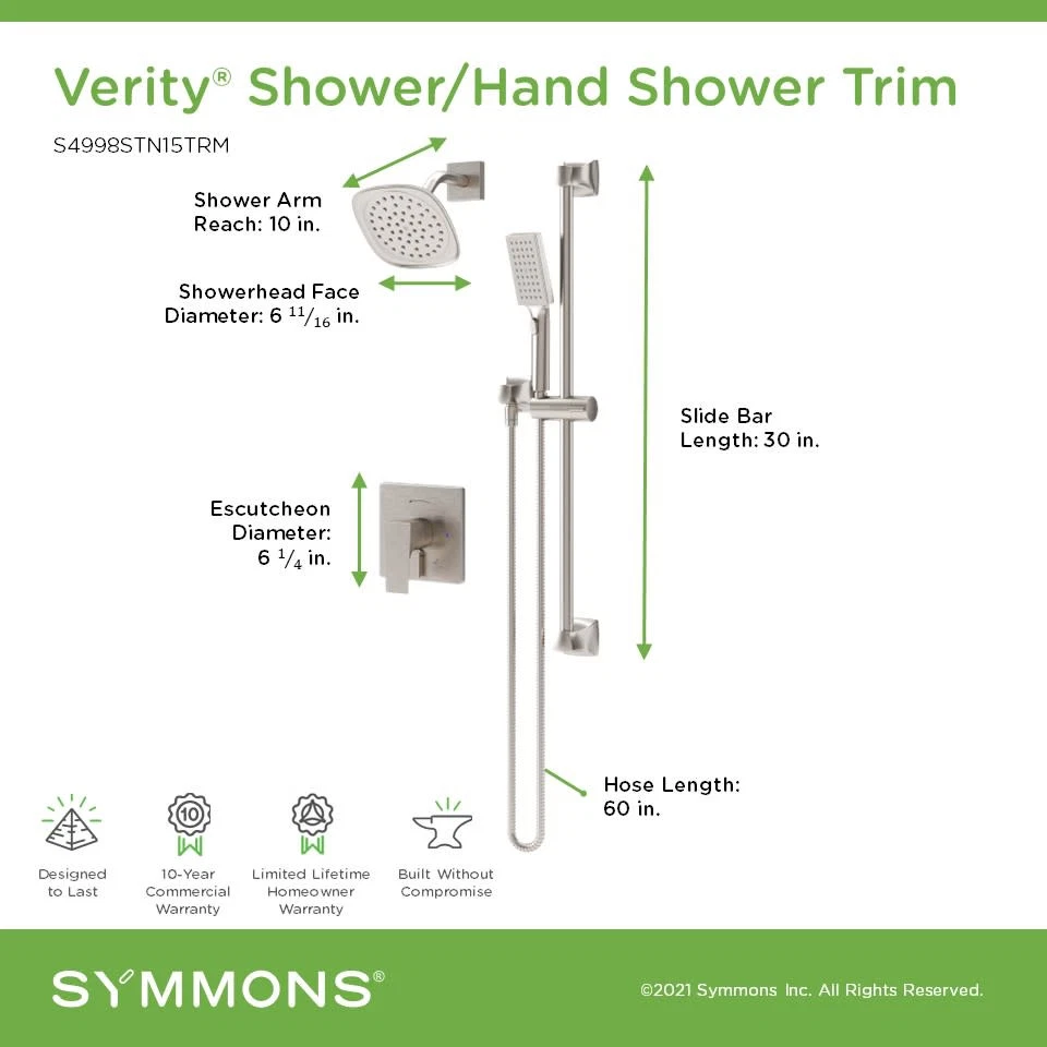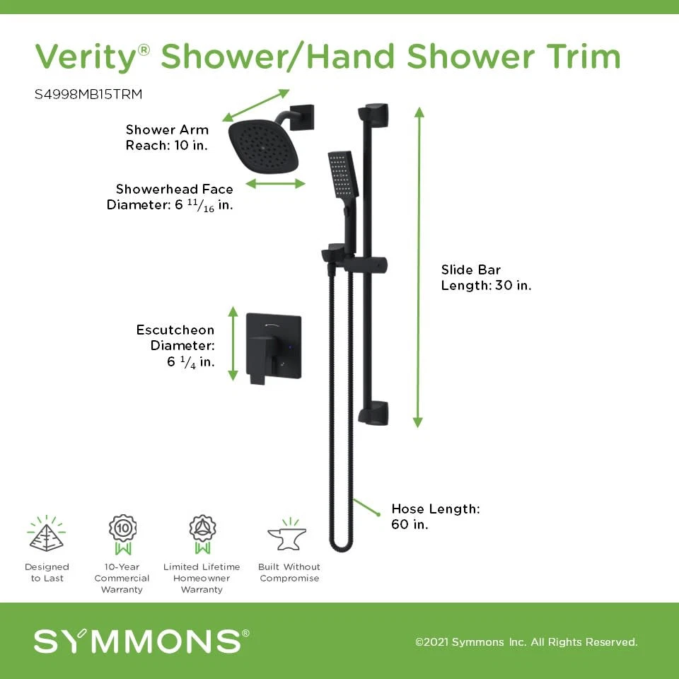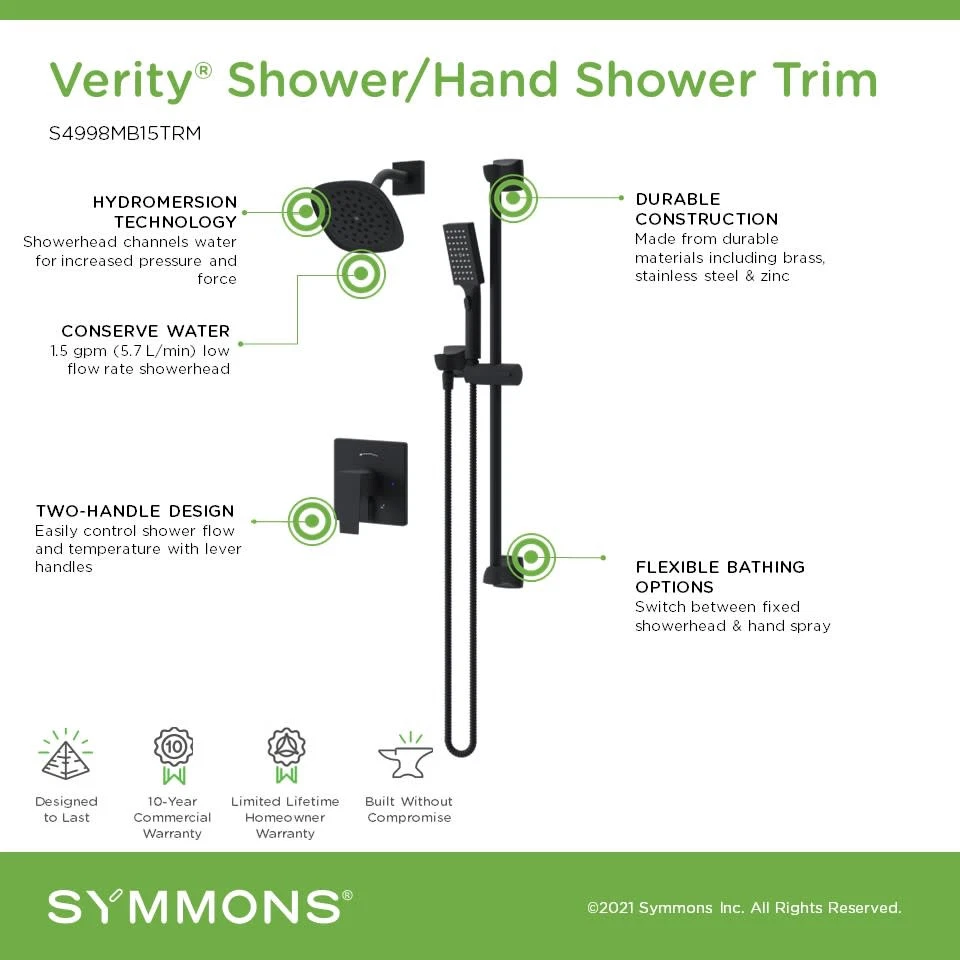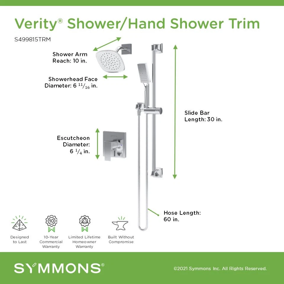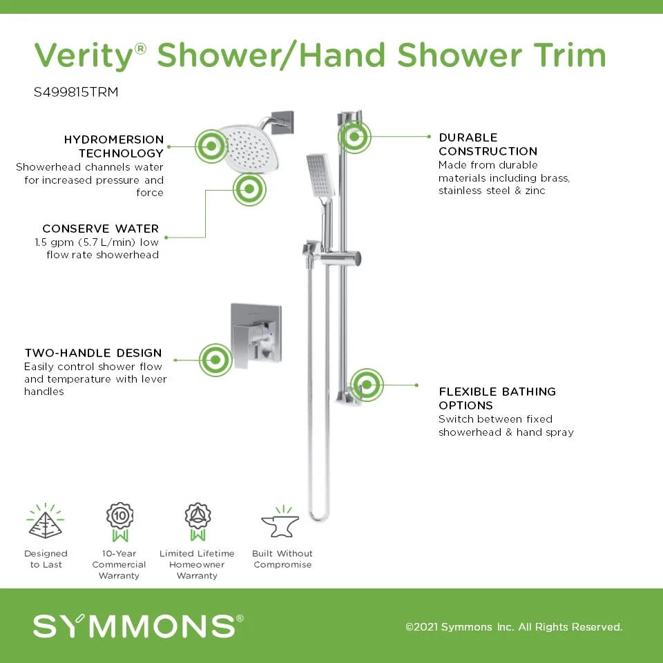 Powered by Frooition All Categories Symmons S499815TRM Verity HydroMersion Pressure Balanced Shower System with Shower Head, Hand Shower, Shower Arm, Hose, and Valve Trim with Integrated Diverter Overview Item Description Symmons S499815TRM Features: Shower Package Includes: diverter, handles, handshower, hose, shower arm, and valve trim Covered under Symmons's 10 year commercial and limited lifetime residential warranties Pressure balanced valve trim - single cartridge controls water temperature only 1 lever style bronze handle Integrated diverter controls Matching hand shower with pause control and 60" hose Complies with ADA standards High quality finish – will resist rust and corrosion through everyday use Square showerhead Product Technologies: HydroMersion Spray: Special outflow patterns channel water for increased pressure and force, while meeting or exceeding flow rate requirements for water conservation and sustainability Symmons S499815TRM Shower Valve Trim Specifications: Features a pressure balanced valve Integrated diverter is located on the valve trim Rough-in sold separately - when adding this package to cart, compatible valves will be offered Valve Trim Height: 6-1/4" (top to bottom) Valve Trim Width: 6-1/4" (left to right) Symmons S499815TRM Shower Head Specifications: Single function showerhead constructed of brass, plastic, stainless steel, zinc Shower Head Flow Rate: 1.5 gallons-per-minute Shower Head Height: 6-11/16" (spray nozzles to connection outlet) Shower Head Width: 6-11/16" (left to right) Shower Arm Length: 10" Symmons S499815TRM Hand Shower Specifications: Hose Length: 60" Hand Shower Flow Rate: 1.5 gallons-per-minute Hand Shower Type: Single Function Why Choose BuildInc? OUR PROMISE TO YOU About Us At Build, we promise to provide the best selection we can, most competitive pricing, and unmatched customer service. Our store has quality home improvement products from trusted manufacturers like Moen, American Standard, Delta, Kraus, Kichler, Progress Lighting, Schlage, Kwikset, Baldwin, Broan, NuTone, Air King, and Rev-A-Shelf. With over 200,000 home improvement products for you to choose from, we have just what you need to get your project done. Fast & Free Shipping We promise to make it our priority to get you your items as fast as we can. We ship from 440 warehouses around the country, ensuring that your product will get to you as soon as possible. We know you're eager to get your hands on your new purchase, we would be too. As a bonus, most items ship for free. Returns We are happy to accept returns of unused or defective items for a refund within 30 days from the date of delivery. For returns outside 30 days, please contact our Customer Service team to go over our options. For full details, please view the Shipping and Payments tab above. To initiate a return simply go to the eBay Returns Portal and submit a return request. We ask that all items be returned with all original components via a traceable method. Once your return is received and processed, we will quickly get your refund or replacement issued. If for any reason you are unsatisfied with your purchase or for product or warranty questions, please contact Customer Service team for assistance. More Items! View more great items! About Us | Shipping | Returns | Contact Us | FAQ | Collections | Special Offers! Powered by Frooition Frooition Frooition | No-js Template | eBay design, eBay store design, eBay shop design, eBay template design, eBay listing design (ver:froo_no_js) This listing is currently undergoing maintenance, we apologize for any inconvenience caused.
