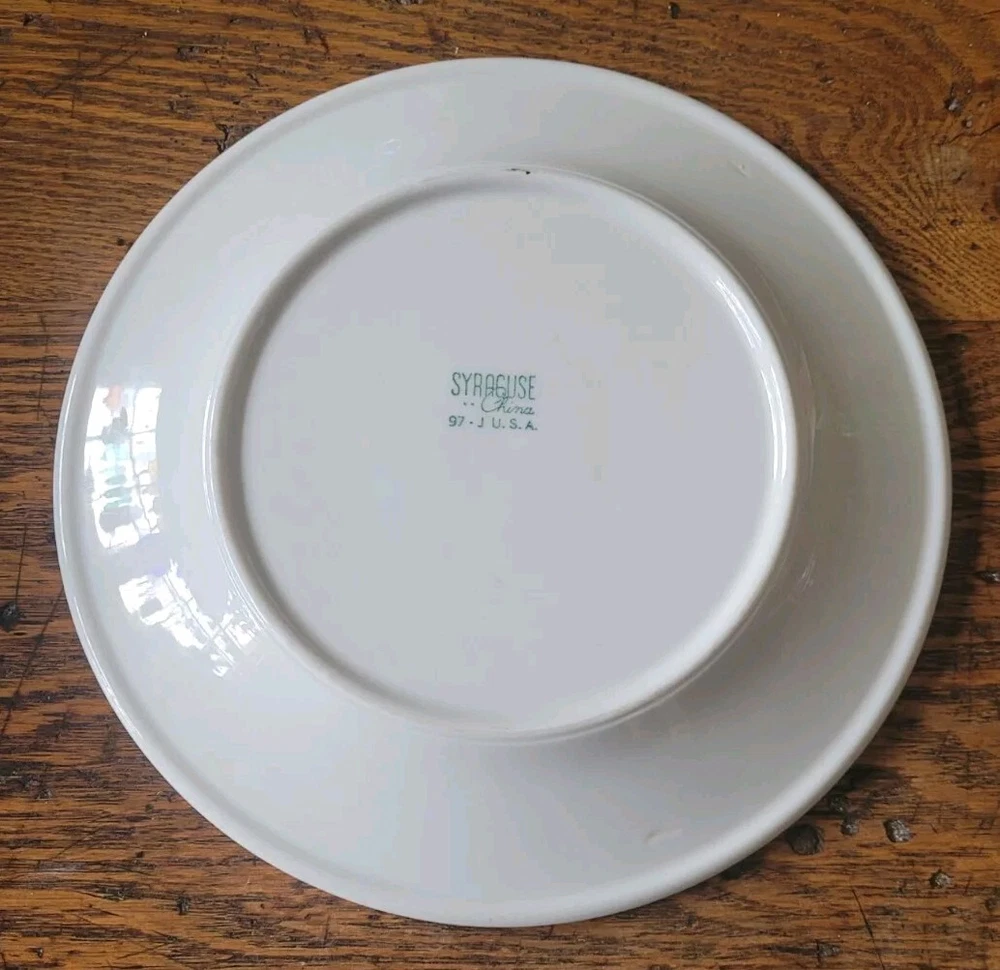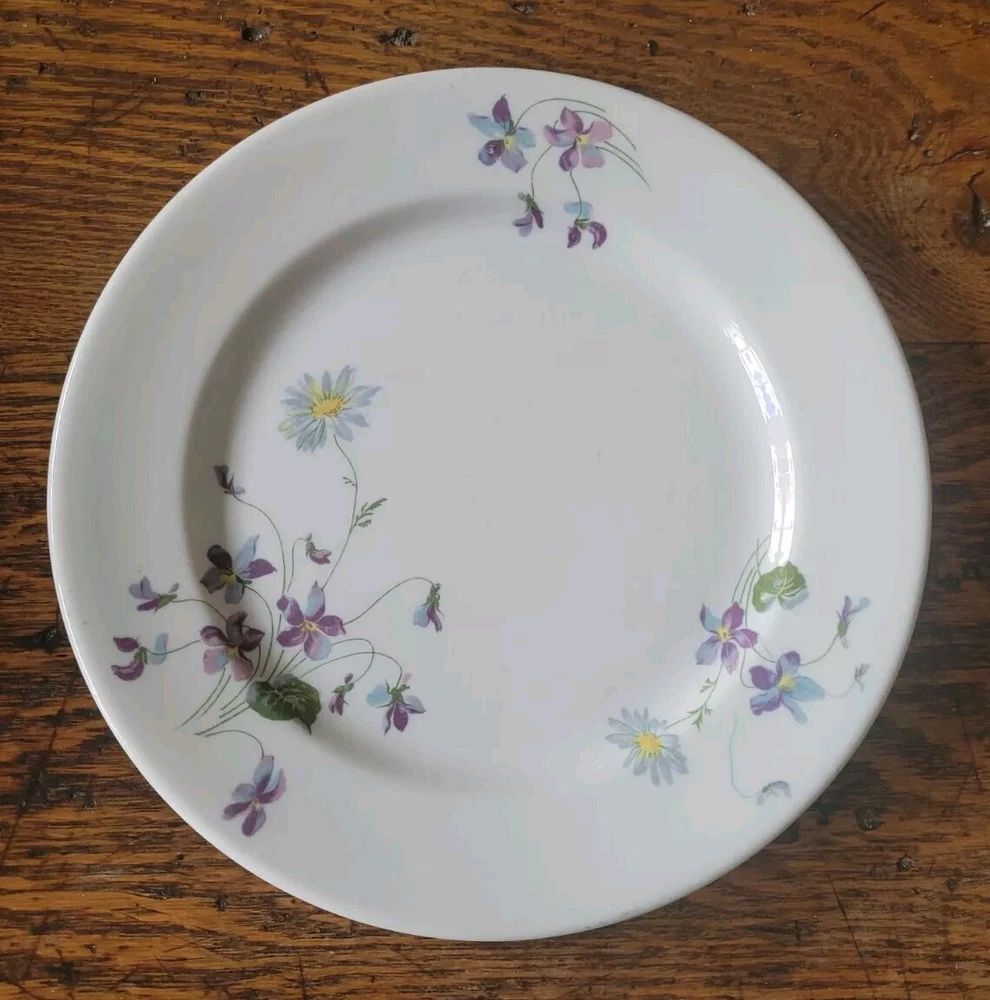 The product is a 9" luncheon plate made by Syracuse China, featuring a charming Violets Daisy design. This plate is likely part of a restaurant or railroad pattern, adding a touch of vintage charm to any dining experience. The combination of the floral design and the brand's reputation for quality craftsmanship make this luncheon plate a delightful addition to any table setting. Very good condition, no chips or cracks, just normal light utensil wear. Check out the photos, as they are part pf the item description.