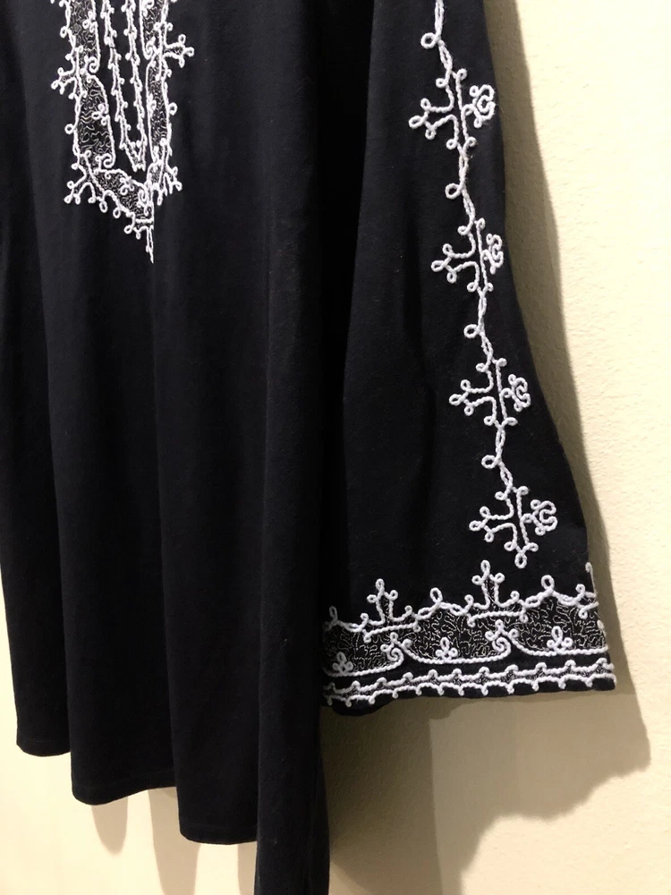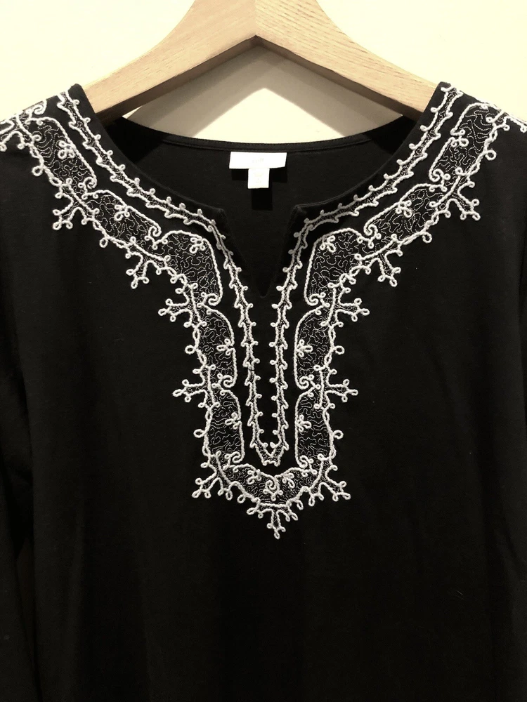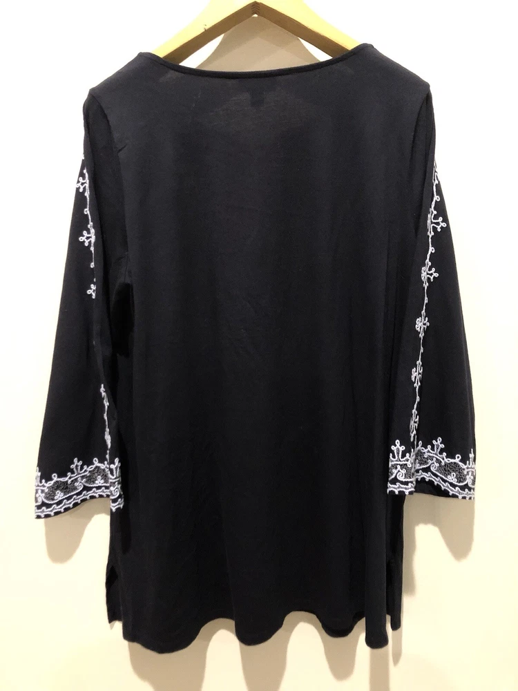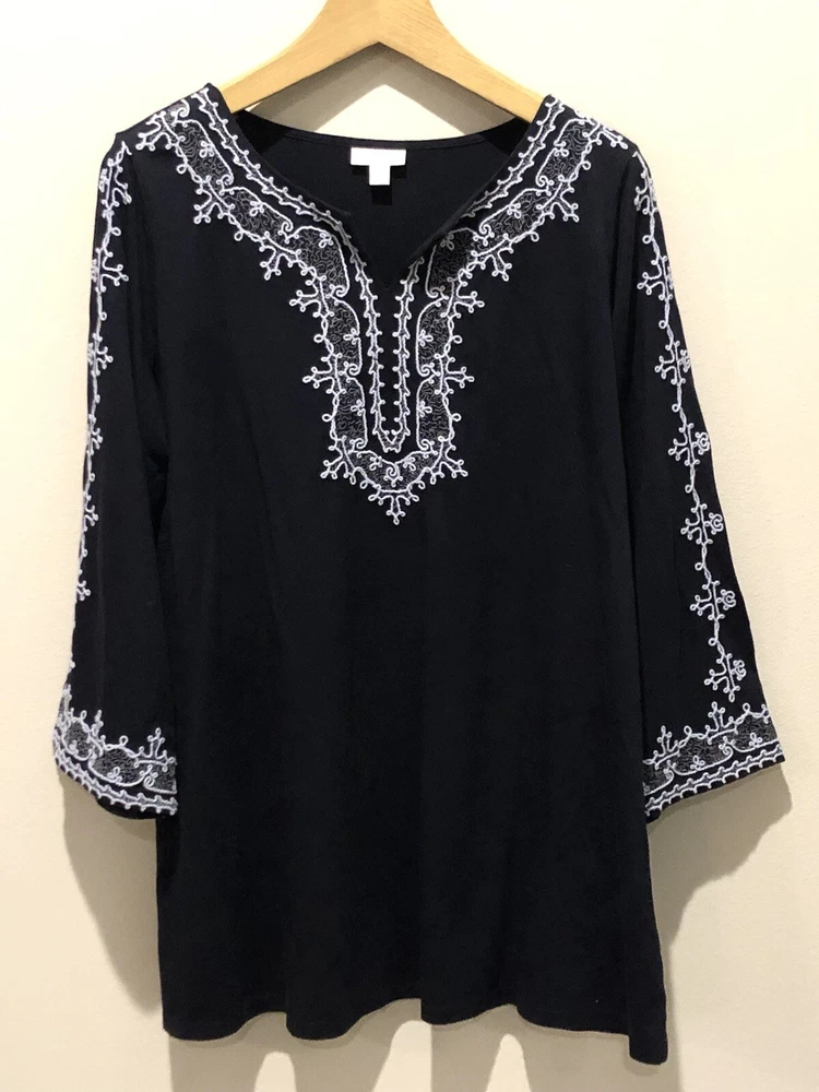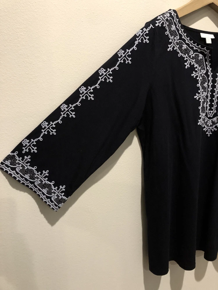 This J. Jill tunic is perfect for any occasion, from casual to business, and features a beautiful blue floral pattern with embroidered accents. The V-neckline and 3/4 sleeves provide a comfortable fit, while the pullover closure makes it easy to wear. Made from a blend of cotton, modal, and cotton blend, this tunic is lightweight and breathable, making it suitable for all seasons. The tunic comes in size Large/Tall and is machine washable for easy care. The bohemian style and nature-themed design make it perfect for beachy vacations, cruises, or as a colorful addition to your wardrobe. Whether you're in California or Florida, this tunic is sure to add a playful and patriotic touch to your outfit. In excellent pre-owned condition without holes, stains or wash wear. 970 Bust 44” Length 31” Sleeve Length 22”