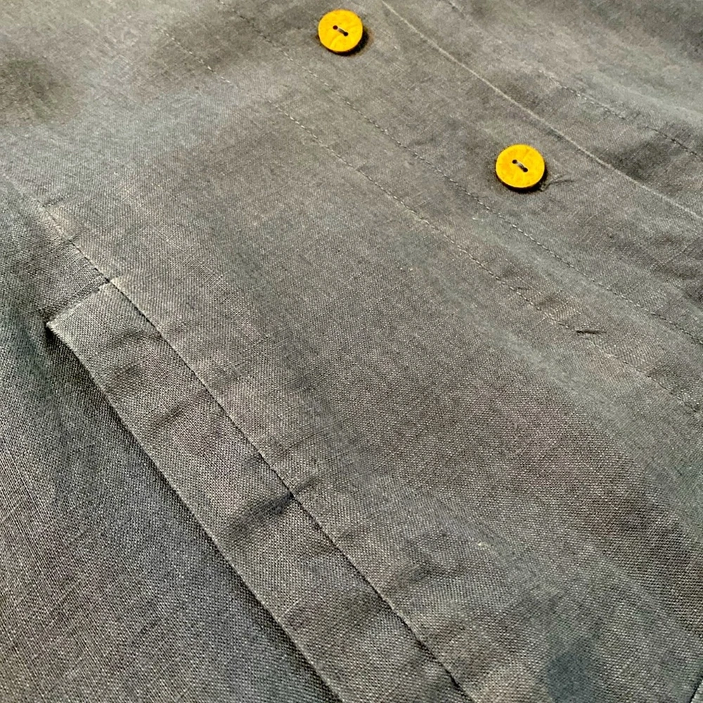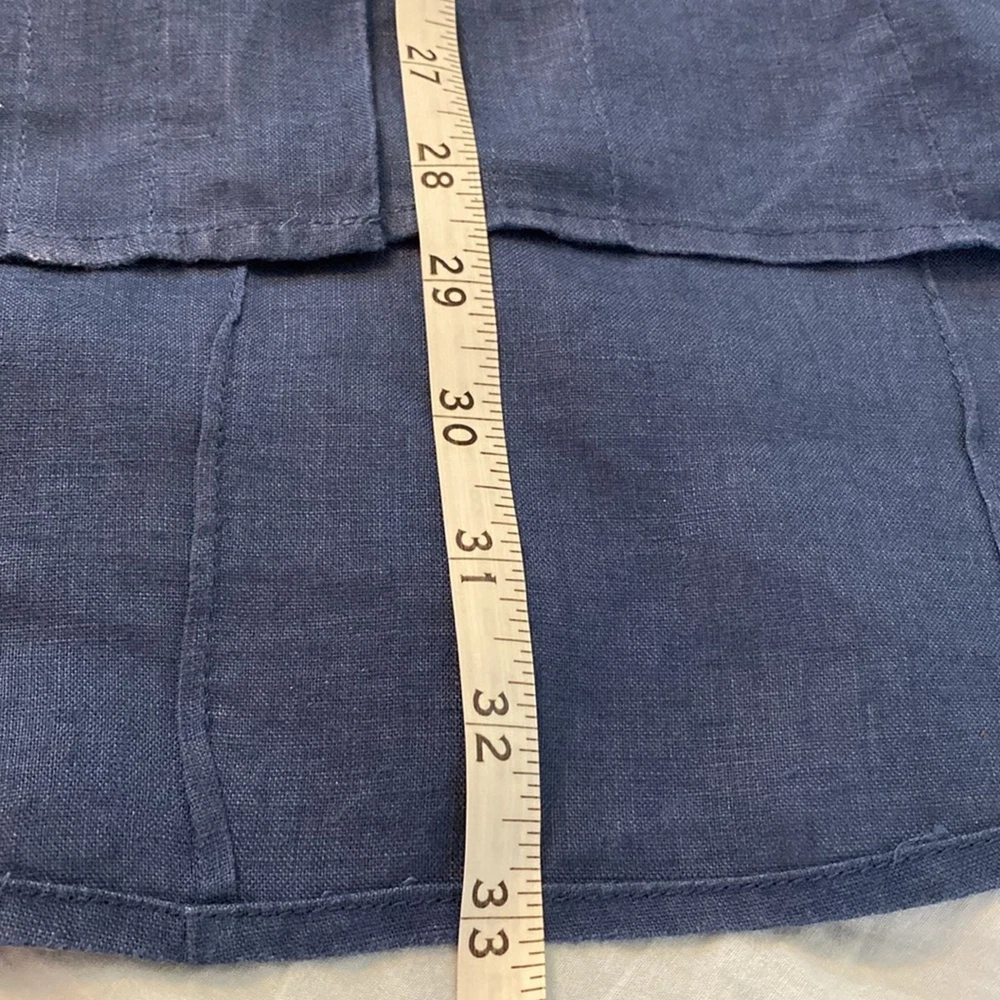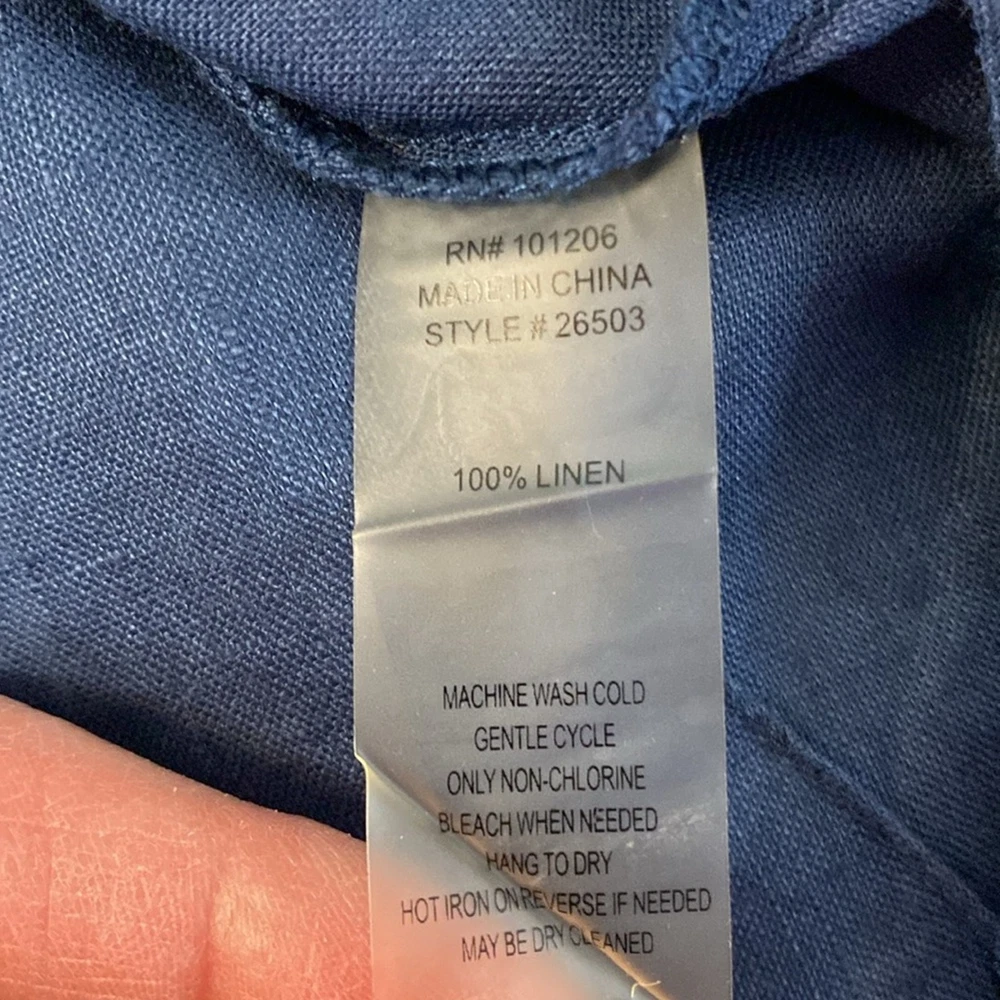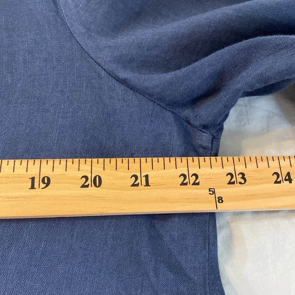 Soft Surroundings 100% linen tunic size large Navy blue with a hint of teal Full button front Back pleat Front slash pockets Long sleeves, roll tab convertible See photos for approximate measurements Good condition