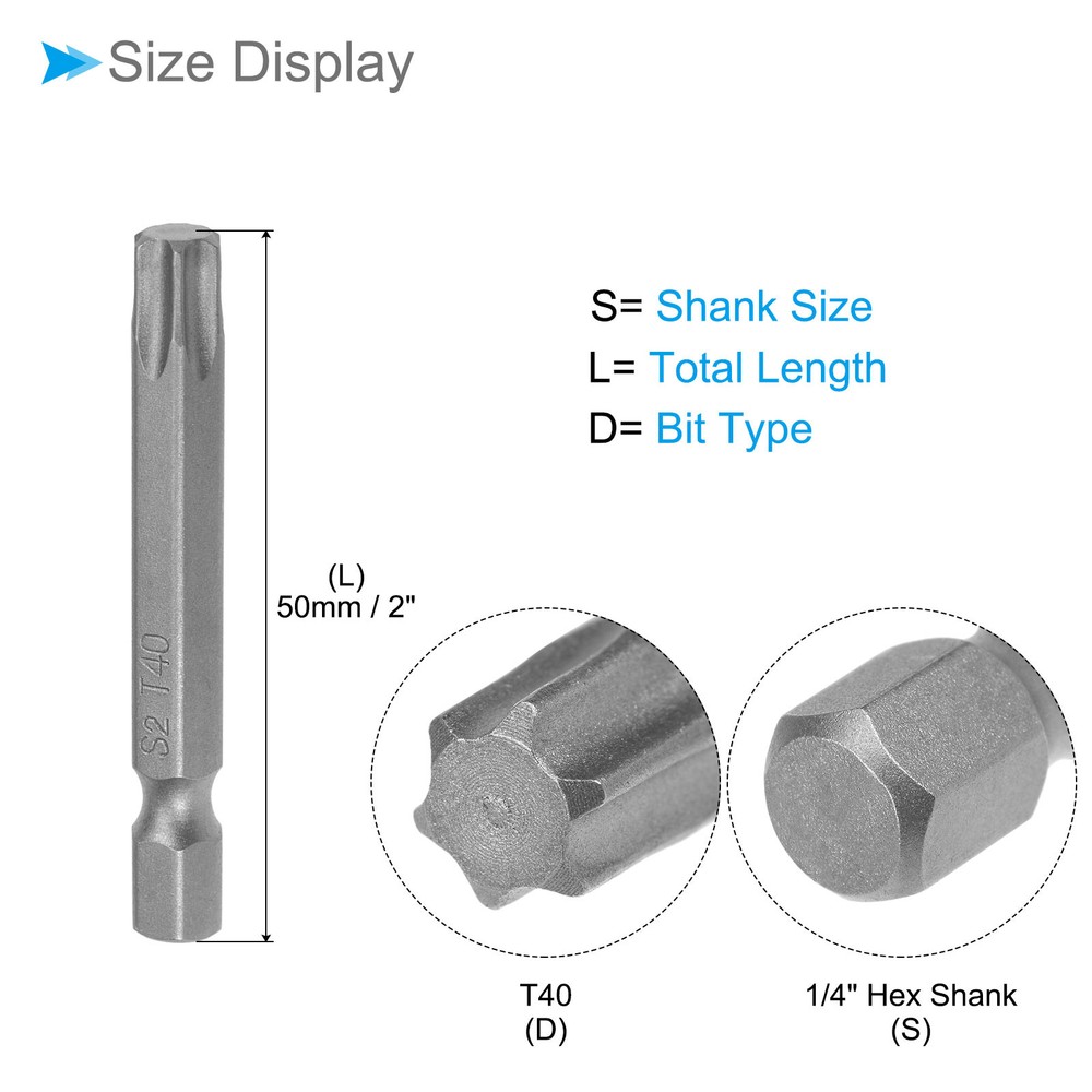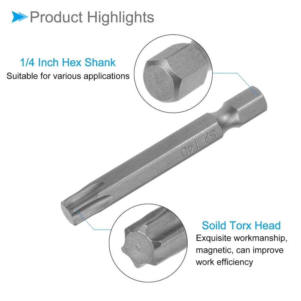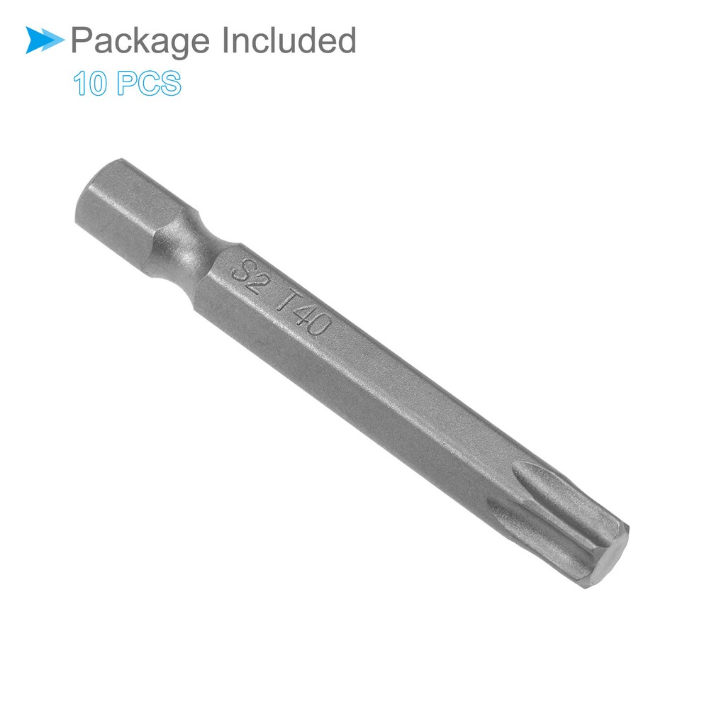 Document Attributes: *Screwdriver Bit Type: T40*Total Length: 50mm / 2 inch*Surface Treatment: Sandblasted*Material: S2What Is Included:* 10 Pieces x Torx Head Screwdriver BitsApplications & Features: -The screwdriver bit is made of S2 steel, which is wear-resistant and impact-resistant, with a hardness of up to 58HRC, and has been sandblasted and surface treated for durability.-These torx screwdriver bits feature a magnetic design that allows them to easily attract and hold screws. This feature ensures convenient installation by securely holding the screw in place before and after fastening, preventing accidental drops or misalignment.Useful Tips:-When using the torx head screwdriver bit, ensure a proper fit with the screw head to prevent stripping or damage. Apply appropriate pressure and torque to avoid over-tightening or under-tightening. Inspect the bit regularly for any signs of wear or deformation and replace if necessary. T40 Torx Head Screwdriver Bit 2" L 1/4 " Hex Shank Steel Screw Driver 10Pcs Attributes: *Screwdriver Bit Type: T40 *Total Length: 50mm / 2 inch *Surface Treatment: Sandblasted *Material: S2 What Is Included: * 10 Pieces x Torx Head Screwdriver Bits Applications & Features: -The screwdriver bit is made of S2 steel, which is wear-resistant and impact-resistant, with a hardness of up to 58HRC, and has been sandblasted and surface treated for durability. -These torx screwdriver bits feature a magnetic design that allows them to easily attract and hold screws. This feature ensures convenient installation by securely holding the screw in place before and after fastening, preventing accidental drops or misalignment. Useful Tips: -When using the torx head screwdriver bit, ensure a proper fit with the screw head to prevent stripping or damage. Apply appropriate pressure and torque to avoid over-tightening or under-tightening. Inspect the bit regularly for any signs of wear or deformation and replace if necessary. Hot Item Payment 1.We accept eBay payment . 2.Payment must be received within 7 business days of auction closing. Shipping 1.We ship to your eBay or Paypal address. Please make sure your eBay and Paypal address is correct before you pay. 2.Items will be shipped within 1-3 business day when we received payment. 3.Delivery time depends on destination and other factors. Description Policy T40 Torx Head Screwdriver Bit 2" L 1/4 " Hex Shank Steel Screw Driver 10Pcs Attributes: *Screwdriver Bit Type: T40 *Total Length: 50mm / 2 inch *Surface Treatment: Sandblasted *Material: S2 What Is Included: * 10 Pieces x Torx Head Screwdriver Bits Applications & Features: -The screwdriver bit is made of S2 steel, which is wear-resistant and impact-resistant, with a hardness of up to 58HRC, and has been sandblasted and surface treated for durability. -These torx screwdriver bits feature a magnetic design that allows them to easily attract and hold screws. This feature ensures convenient installation by securely holding the screw in place before and after fastening, preventing accidental drops or misalignment. Useful Tips: -When using the torx head screwdriver bit, ensure a proper fit with the screw head to prevent stripping or damage. Apply appropriate pressure and torque to avoid over-tightening or under-tightening. Inspect the bit regularly for any signs of wear or deformation and replace if necessary. Hot Item Payment 1.We accept eBay payment . 2.Payment must be received within 7 business days of auction closing. Shipping 1.We ship to your eBay or Paypal address. Please make sure your eBay and Paypal address is correct before you pay. 2.Items will be shipped within 1-3 business day when we received payment. 3.Delivery time depends on destination and other factors.