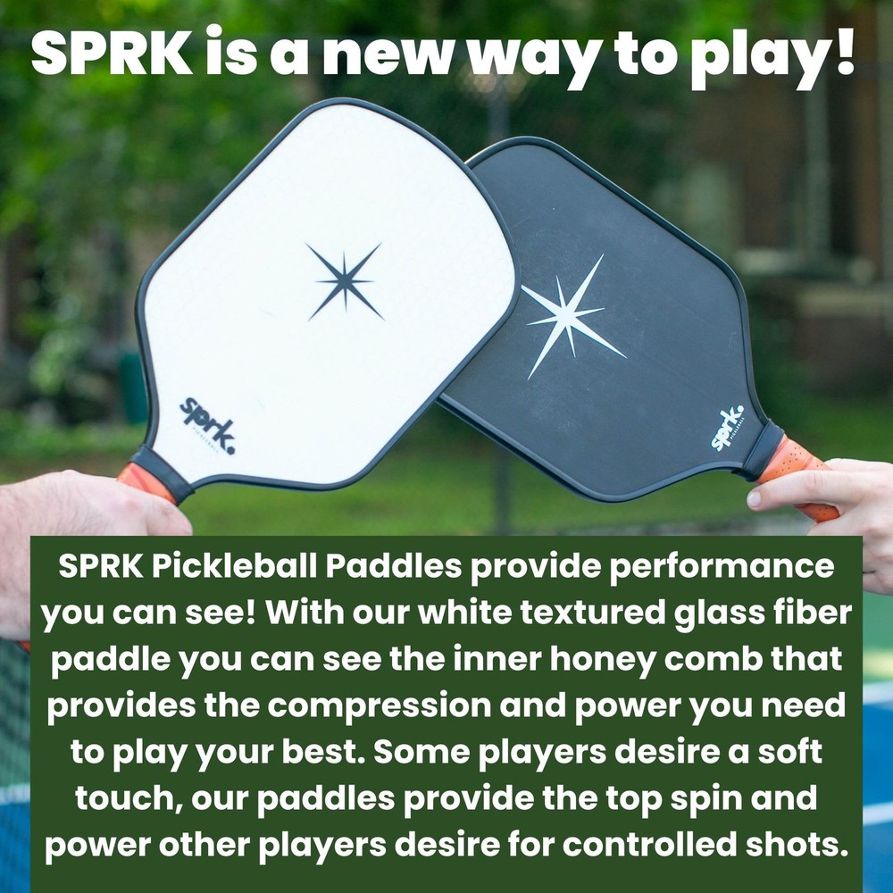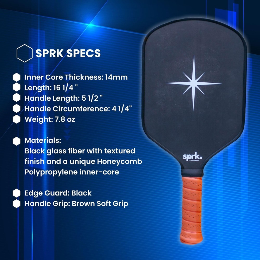 Elevate your pickleball game with this premium paddle from Spark. Crafted with a high-quality fiber glass face, it delivers exceptional ball control and shot precision. The smooth surface provides a consistent feel, allowing you to execute accurate and powerful shots every time. At the core lies a lightweight yet sturdy polymer honeycomb structure that absorbs impact effectively, reducing vibrations and ensuring a comfortable grip during intense play. With its optimal weight and balance, this paddle offers a seamless and enjoyable experience on the court. Designed for both recreational and competitive players, it's the perfect companion to take your skills to new heights. High-Performance Surface: Featuring a T700 carbon fiber face, this paddle delivers exceptional ball control and shot precision. Polymer Honeycomb Core: Lightweight yet sturdy polymer honeycomb core absorbs impact, reducing vibrations for a comfortable grip. Optimal Weight and Balance: Expertly engineered for the ideal weight distribution, ensuring smooth and effortless swings. Durable Construction: Built to withstand intense gameplay, this paddle offers long-lasting durability on the court. Ergonomic Grip: The contoured grip provides a secure and comfortable hold, maximizing your control and power.