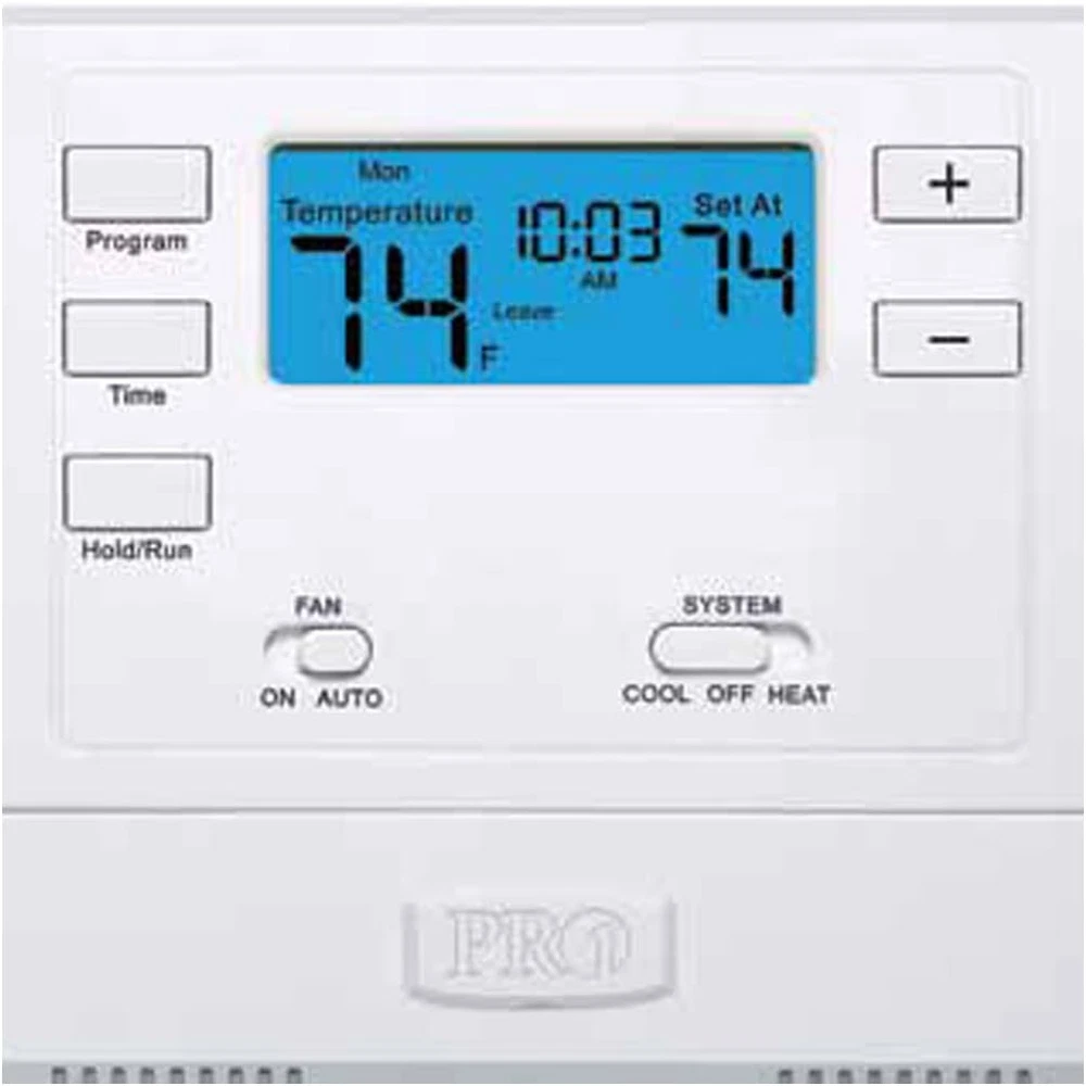 Multi stage 2 heat 2 cool 5/1/1 programmable Battery powered or hardwired 4 sq. inch display with blue backlighting PRO1 specializes in the design and manufacturing of professional grade products that improve the comfort of a home and simplify the installation. All of our products are designed to accommodate the performance and reliability demands of professional heating and cooling technicians. Heating and cooling accounts for almost half of our annual home energy consumption. You can personally reduce nearly 2,000 pounds of carbon emissions annually with a few simple adjustments. The American Council for an Energy Efficient Economy has more tips for saving energy on heating and cooling. Separate heating and cooling swing (cycle rate) adjustments including 2nd stage adjustments. 5 minute compressor delay protection (selectable on or off). Filter change indicator (selectable on or off). 5 minute compressor delay protection (selectable on or off).