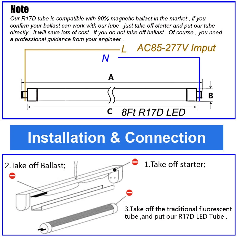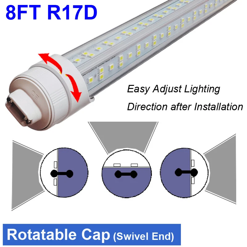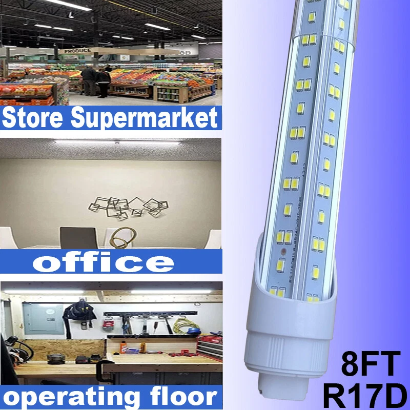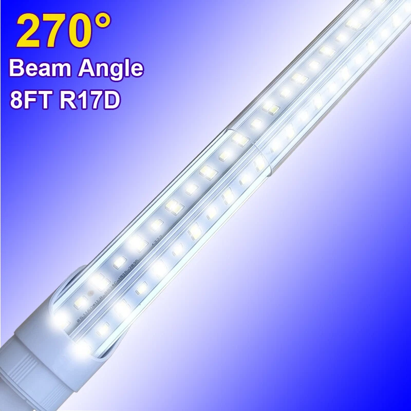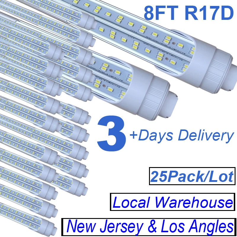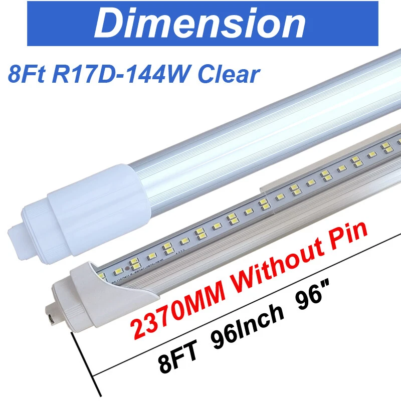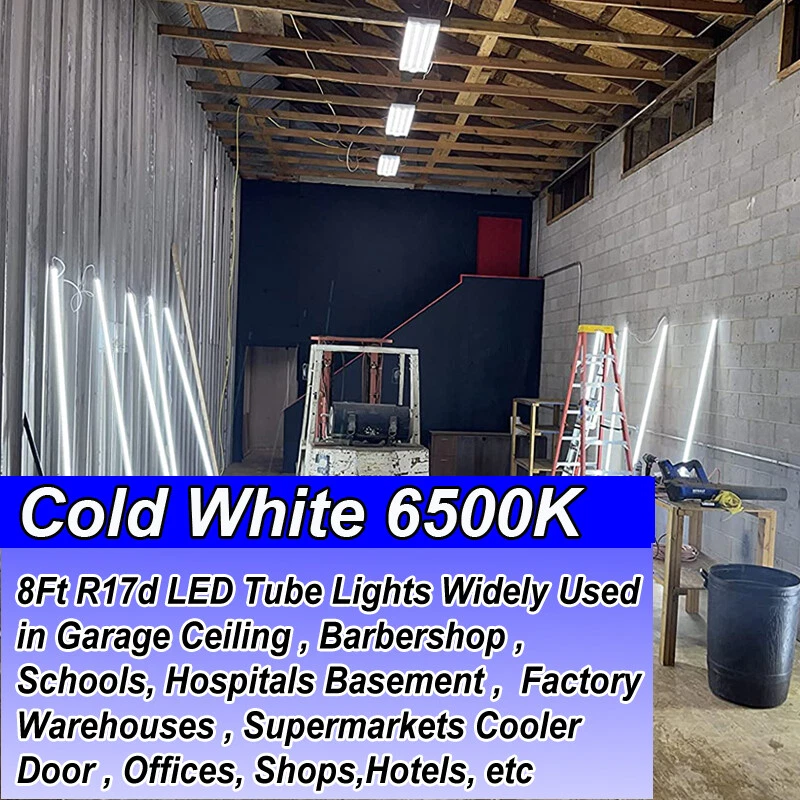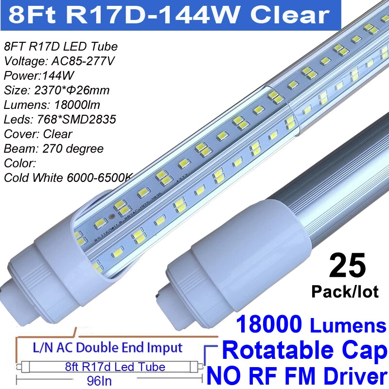 FAST DELIVERY - Ship from New Jersey or Los Angeles Warehouse via FedEx , 3-7 Days Delivered Your Door . SCIENTIFIC DESIGN - 8Ft LED Shop Lights Fixture is Made of 6500K Cold White SMD2835 LED Chip ,Plastic Clear Cover , Aluminum Bracket Housing ,and AC85-277V Constant Current Driver . It can work in -68F to 120F Temperature Conditions EASY INSTALLATION - The Integrated Tube Fixture Can be Install on Wall or Ceiling ,Easily Replace Traditional Fluorescent Tube Bulb . Plug and Play , Free Accessories (Power Cords, Connector , Extension Cords , Clip and Screw ) Come with Tube Lights Together WIDE APPLICATION - Linkable 8Ft Bulbs Widely Used in Garage Ceiling , Barbershop , Schools, Hospitals Basement , Factory Warehouses , Supermarkets Cooler Door , Offices, Shops,Hotels, etc T8 8Ft R17D HO Led Tube Light 8' Led Bulbs 144W 8Foot Led Shop Light 6500K 25Pcs 【Rotate Cap & Swivel End】 Easy Adjust rotated Lighting Direction within 180 degree after Installation 【No RF & FM Interference】LED Driver have passed Electromagnetic Magnetic Compatibility EMC tests,No cause EMI ,No longer subject to any RF & FM jamming. Never interfering with the signal of your garage roller shutter door,No make noise when you listen radio 【Easy to Install】Just simply bypass the ballast and connection AC85-277V AC power . Not compatible with single-ended powered sockets 【Wide Application】 - 8Ft 144W V Shaped R17D HO LED Bulb fitted to replace traditional F96T12 T8 T10 T12 fluorescent bulbs. Widely used in Garage,supermarkets, offices , convenience stores .