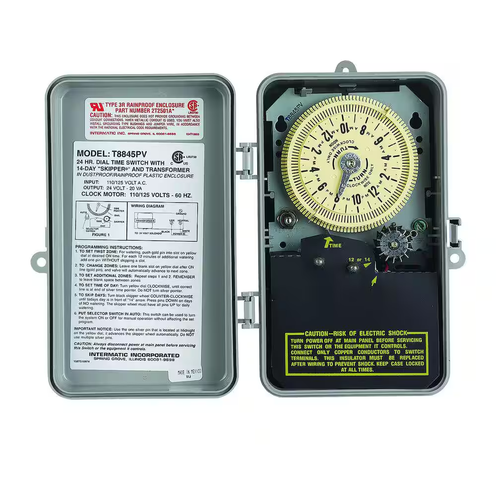 Fast Shipping On All Items 30 Days Money Guarantee Customer Support Excellent Service 100% Satisfaction Satisfaction Guaranteed T8800 Series 125-Volt Input with 24-Volt Output Indoor/Outdoor Irrigation/Sprinkler Timer Specification Back Battery Type No Backup Color Family Grays Commercial/Residential Commercial,Residential Compatibility Type No Additional Compatibility Features Manual Bypass Included No Additional Items Included Indoor/Outdoor Indoor/Outdoor Irrigation System Component Controller/Timer Mount Location Wall Number of Programs 44 Number of Start Times 44 Number of Zones 1 Pack Size 1 Power Type Hardwired Program Type Programmable Returnable 90-Day Smart Technology No Smart Technology Features Sprinkler Location Above ground Sprinkler Type Fixed Timer Type Manual Timing Segments 10 minutes Manufacturer Warranty 1-Year limited Product Depth (in) 4 in Product Height (in) 10 in Product Width (in) 6.5 in 6.5 inches x 4.0 inches x 10.0 inches. Item Description On/Off/Auto switch provides options without disturbing cycle Includes a 24-volt, 20 volt Amp transformer NEMA 3R plastic case These irrigation timers are designed to permit one to 44 "ON" operations every 24 hours and provide watering increments down to 12 minutes or up to 20 hours and 45 minutes to ensure proper watering increments. These models also allow for biweekly scheduling with the convenient 14-day skipper for maximum water conservation and odd/even day compliance. Perfect for use with agriculture feeders and greenhouse misting controls. About us We offer the best prices around on high quality products. Our E-store includes media such as books, movies, music and games while offering electronics, toys, sporting apparel, clothing, tools, general home, garden items and more. Shipping We are always working hard to ensure your package arrives as soon as possible. Please understand that some factors like weather, high postal traffic, and the performance of shipping companies are outside of our control. We offer free shipping to the lower 48 states and ship within 2-3 business days of payment, usually sooner. We do not accept P.O. Boxes. Please provide a physical address. For shipping outside of the continental USA, we only use eBay's Global Shipping Program.The item is shipped to KY and then sent to the rest of the world. International customers are responsible for all duties and taxes. Continue to check out to calculate costs for shipping the item to your country. Messages regarding eBay's Global Shipping Program MUST be directed at eBay EXCLUSIVELY. Returns We offer a 30-Day Return Policy on items in which you are not completely satisfied with. You have the option of a full-refund or an exchange of the item. No returns are available on items shipped outside of the USA Satisfaction We try over very best to make sure every customer is completely satisfied. If there's a problem, message us! We're happy to help. Payment Options Shop With Confidence