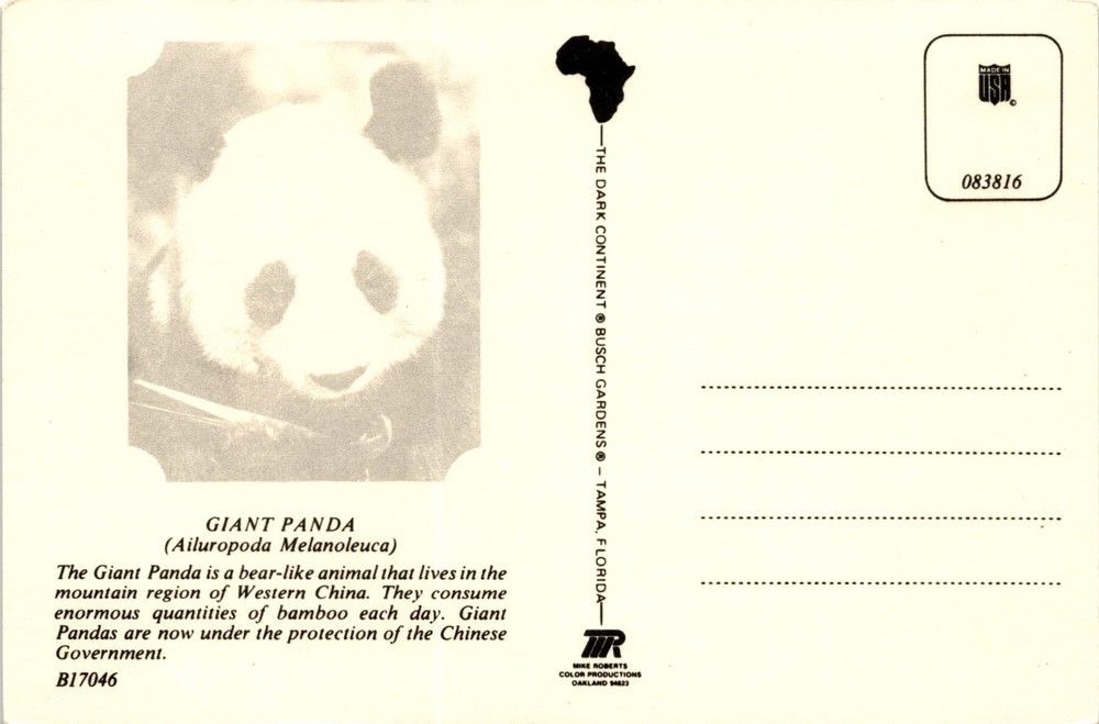 MAKE AN OFFER. THE MORE YOU BUY THE BETTER DEAL I WILL ACCEPT Busch Gardens is a popular theme park located in Tampa, Florida, known for its various attractions and animal exhibits. One of the highlights of Busch Gardens is the Dark Continent area, which features animals and habitats from Africa. The postcard specifically mentions the Giant Panda, which is a bear-like animal native to the mountain regions of Western China.