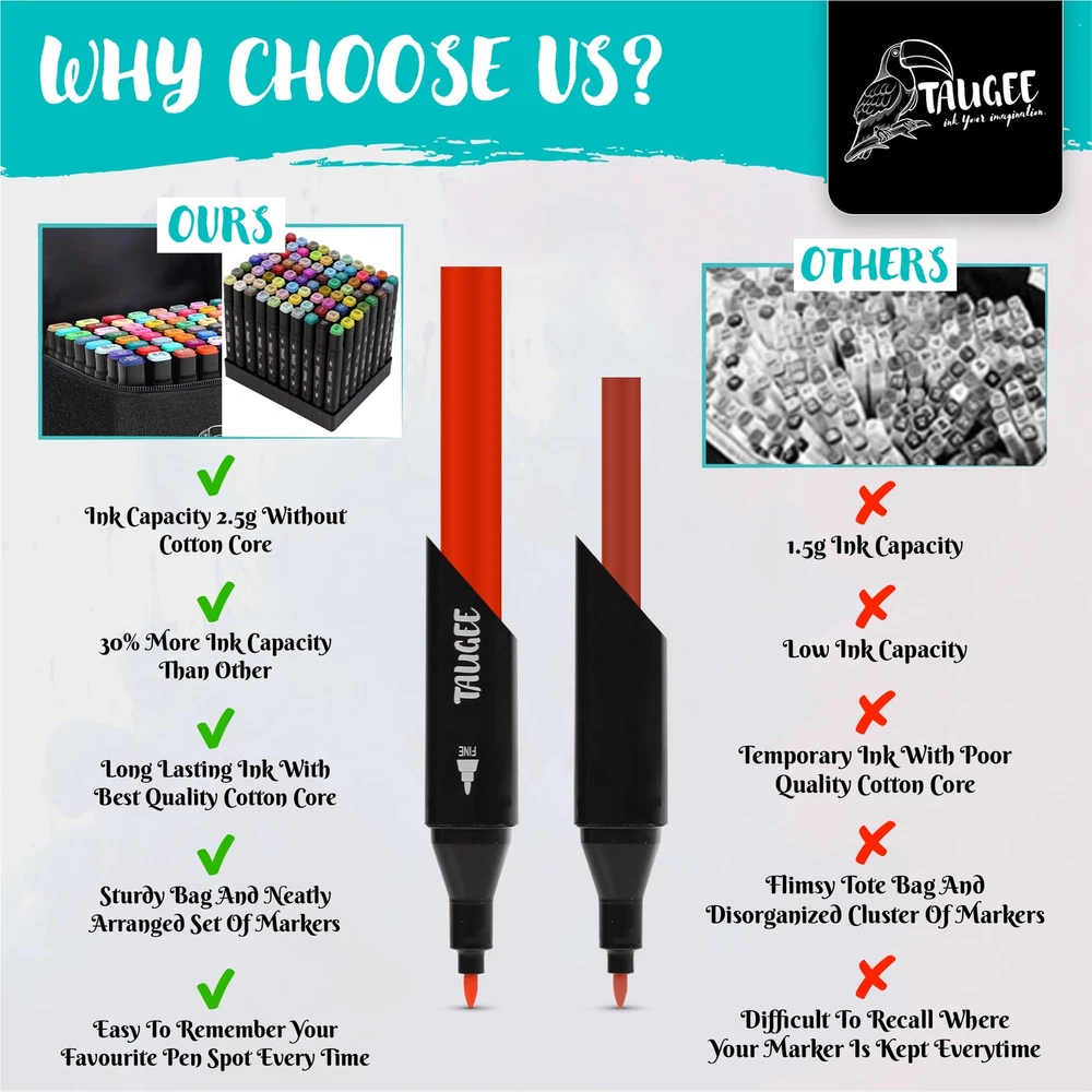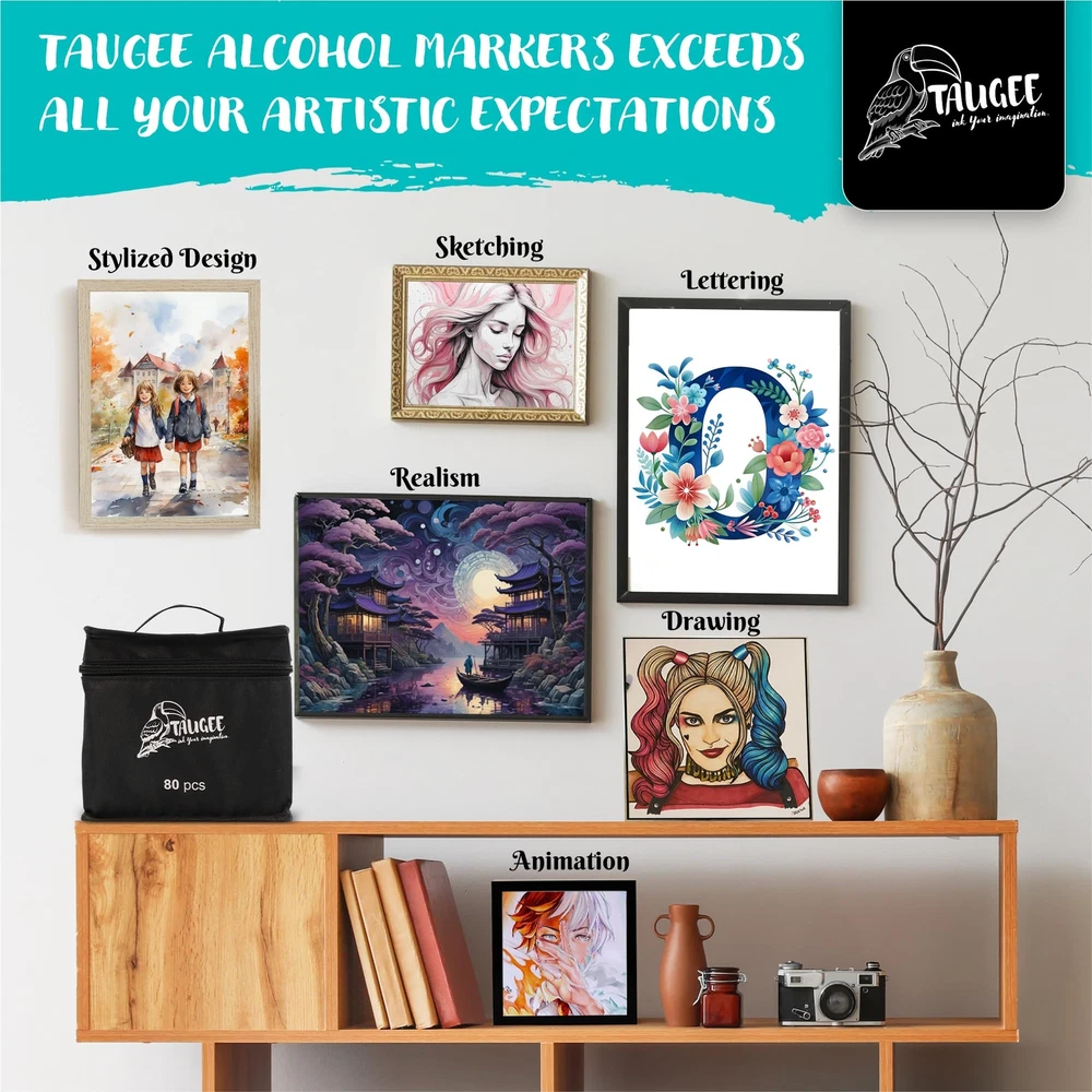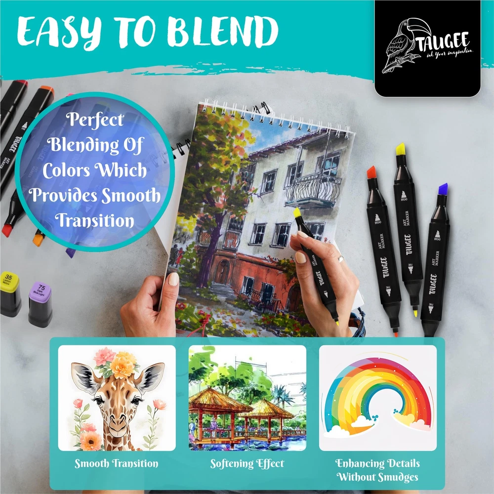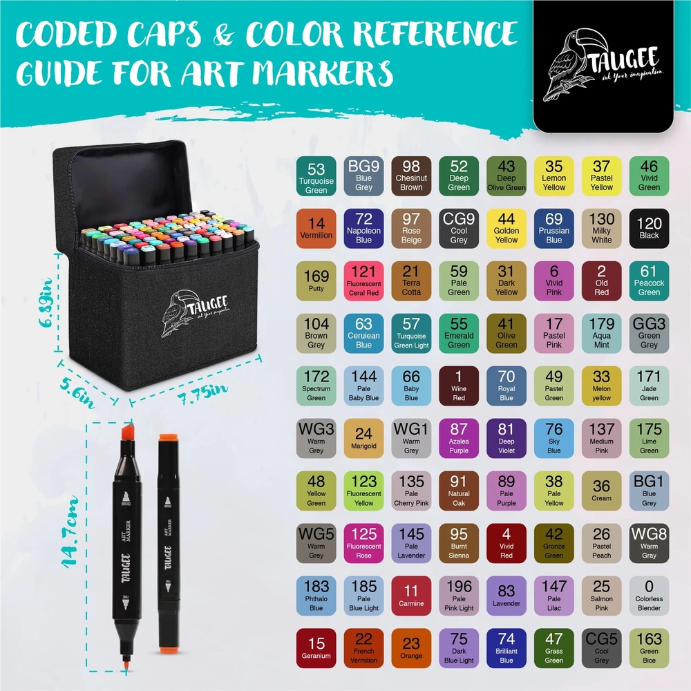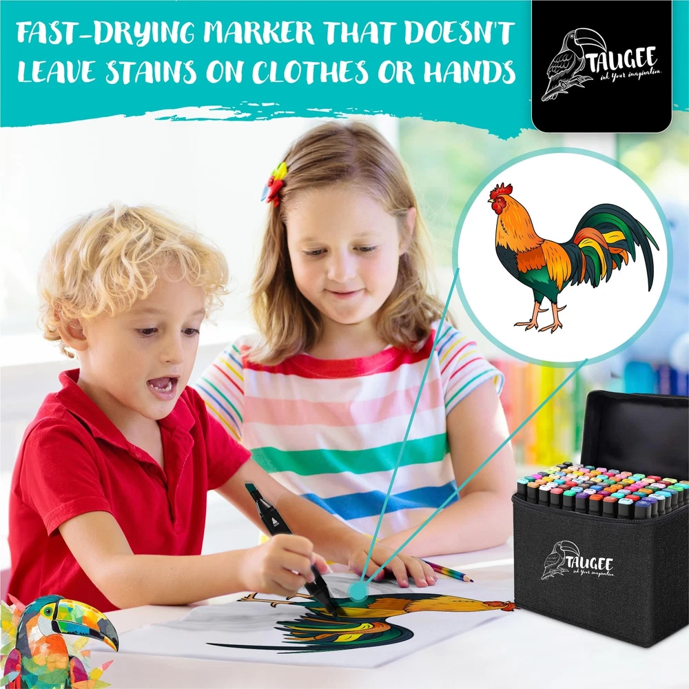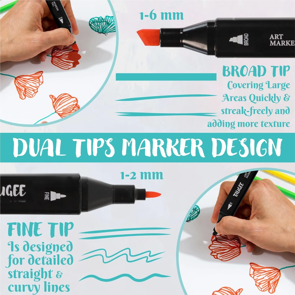 Get ready to unleash your creativity with the TAUGEE Color Alcohol Markers Set! This comprehensive set of dual tip markers is perfect for artists of all ages, from kids ages 4 to adults. Whether you're a seasoned illustrator or just starting with adult coloring books, these bulk markers art pens are the perfect tool for coloring, drawing, illustration, sketching, and painting. With vibrant colors and brush tip markers included in this markers bulk set, you'll have every shade you need to bring your artwork to life. The alcohol based markers (artist markers) offer easy blending capabilities, allowing you to create smooth transitions between colors and achieve professional-looking results. The brush tip alcohol markers are also perfect for adding fine details and precise lines to your work. Not only these are art markers for adults, but they're also an ideal choice for kids looking to get creative. These markers for kids ages 8-12 and adult markers offer a safe and non-toxic way for young artists to explore their artistic abilities. With a wide range of skin tone markers for coloring including double sided markers in the set, kids can also learn how to accurately represent diverse characters in their drawings. Don't miss out on the opportunity to take your artwork to the next level with the TAUGEE Color Alcohol Markers Set. Whether you're an adult looking for high-quality dual tip markers for adult coloring books or a parent searching for durable and vibrant kids markers, these chisel tip markers and alcohol brush markers have everything you need to create stunning works of art with a marker set. Add these colored markers for coloring books or other artistic activity to your collection today and let your imagination run wild! [Safe & Odorless Ink]: SGS-approved non-toxic marker ink ensures worry-free drawing markers. The odorless formula is ideal for prolonged use in any setting. Ideal for extended use in any environment. [Tidy Organization]: A stable base holder keeps art markers neat, prevents mess, and reinforces the tote bag structure for secure carry. Markers for adult coloring and kids markers too. [Quick-Dry Precision]: High-quality ink dries swiftly on any surface, preventing stains on hands, paper, or clothes. Perfect for mess-free, kid-friendly creativity. [Long-lasting Ink]: Enjoy extended lifespan with ink that resists quick drying. Keep colors vibrant for continuous inspiration. Perfect professional markers for artists and dual markers. [Seamless Blending]: Effortlessly blends colors for gradients and textures. Layer hues for captivating artistic effects. Great for colored markers for adults, kids, and artists alike. [Minimize Bleed-Through]: While all alcohol markers naturally bleed through paper, you can easily avoid this by using thicker paper or placing an extra sheet underneath your work to protect your surfaces.
