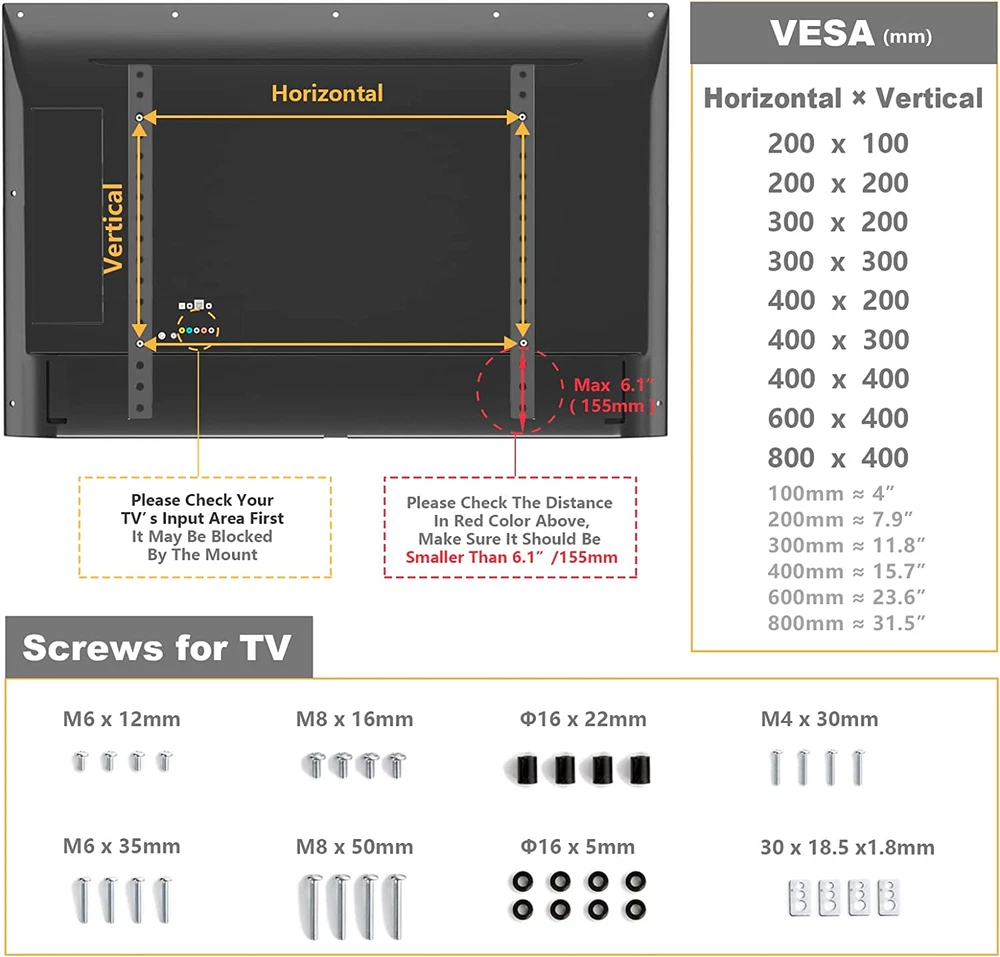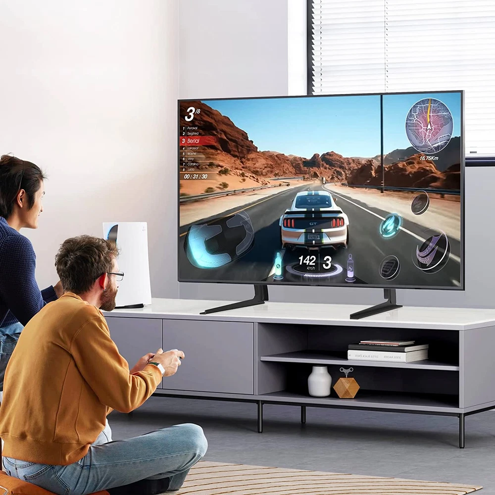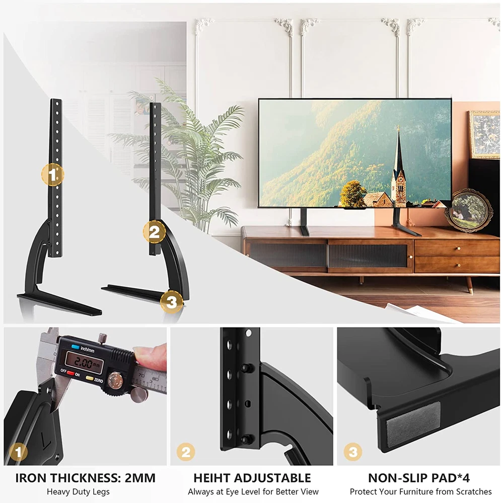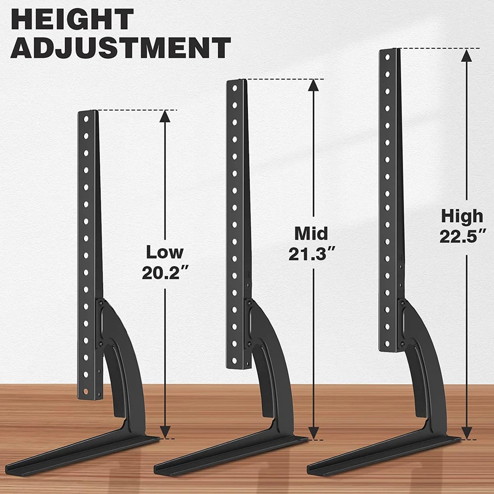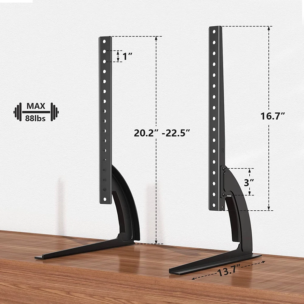 Store New Arrivals Add to Favorite View Feedback Contact Fast deliveries to the customer's home Quality customer service John Make the customers happy! TAVR Universal Table Top TV Stand Base/Legs for Most 32 37 40 42 47 50 55 LCD LED Plasma Flat Screen Tvs, Height Adjustable Replacement Stand, Holds up to 88 Lbs, Max VESA 800X400 Mm Description Highly Compatible TV Stand for Most 32-55 TVS : The universal tv stand base fits most 32 37 40 42 47 50 55 inch TVs and most brands of TVS except Samsung. The mounting holes are on the back of on the back of your TV from 200x100mm up to 800x400mm. Please check your TV's mounting holes to ensure compatibility before purchasing. Notice: If your TV is above 42 inches, please confirm your VESA is better above 200x200mm. Otherwise, the legs will be too close. Metal TV Legs with a super Loading Capacity : Heavy Duty Sturdy steel design make the tabletop tv leg base load capacity up to 88 lbs, greatly improving its durability and stability. We are confident to provide him with five years of after-sales protection. Furthermore, it offers a stylish look to suit any decor, with sharp angles and a black matte finish. Super Simple Installation within 5 minutes : The tabletop TV stand is an excellent alternative to a wall-mounted TV cabinet, and it's also convenient to replace a lost or damaged TV stand. The required installation parts and easy-to-follow installation manual are provided along with the TV stand. If you have any questions during the installation and use process, you can contact our local customer service team at any time and will get back to you within 12 hours. Space-saving TV Legs with No Scratch : The space-saving TV legs is ideal for use in narrow spaces and does not take up much space. Unlike a wall-mounted TV stand, it can be moved to any space you need and has a lot of applications. It's great the tv replacement stand comes with soft pad on the bottom to protect the furniture from being scratched and protect your TV from slipping. Height Adjustable for Maximum Viewing Comfort : The height of the TV can be adjusted from 20.2" to 22.5" with this TV base, ensuring that the TV is always positioned at eye level for optimal viewing experience. Product Description 3 - LEVEL HEIGHT ADJUSTMENT PUT THE TV WHEREVER YOU NEED MORE DETAILS MOVE AROUND This hook can be adjusted around according to your TV's vesa. HEGHT ADJUSTMENT The mount has height adjustable option, height from 20.2" to 22.5". REDUCE SPACE The stand holder can provide better stability and much more space for storage. NON-SLIP NON-SCRATCH The bottom of each foot has padding that prevents skidding while protecting the table top from scratches. OTHER TABLETOP TV STAND RECOMMENDATION Add to Cart Customer Reviews 4.4 out of 5 stars 6,751 4.4 out of 5 stars 900 4.6 out of 5 stars 867 4.5 out of 5 stars 1,583 Price $19.99 $ 19 . 99 $20.99 $ 20 . 99 — $29.33 $ 29 . 33 TV Size Range: 32"-55" 13"-32" 27"-60" 37"-75" Loading Capacity: 88 lbs 44 lbs 88 lbs 110 lbs Max. VESA: 800x400 mm 100x100 mm 400x400 mm 600x400 mm Height Adjustability: 3 Level 5 Level 6 Level 6 Level Easy Installation ✔ ✔ ✔ ✔ Check the mounting holes/TV size/TV weight before buying to ensure compatibility "are screws included" Dear customer, We equipped this TV stand with M4, M5, M6, M8 screws. "will this work for VIZIO D40u-D1, 40inch?" Dear customer, The universal tv stand fits most 32-55 inch TVs. 1.Please check the weight is less than 88 lbs. 2.Make sure your TV has 4 mounting holes that are listed in the VESA standard list: 800x400-200x100mm. "How far forward from the back of the legs are the vertical brackets?" Dear customer, Thanks for your inquiry. This universal Table Top TV Stand's vertical stand is 153mm (6.02 inches) from the back of the leg. Item model number Universal Table Top TV Stand Item Weight 4 pounds Item display height 22.5 inches Mounting Type Tabletop Mount Color Black Product Dimensions 9.9 x 1.18 x 17.3 inches Material Metal Country of Origin China Compatible Devices Television Movement Type Fixed Minimum Compatible Size 32 Inches Color Name Black Maximum Compatible Size 55 Inches ABOUT US We offer the best prices around on high quality products. Our E-store includes media such as books, movies, music and games while offering electronics, toys, sporting apparel, clothing, tools, general home, garden items and more. SHIPPING We are always working hard to ensure your package arrives as soon as possible. Please understand that some factors like weather, high postal traffic, and the performance of shipping companies are outside of our control. We offer free shipping to the lower 48 states and ship within 2 business days of payment, usually sooner. We do not accept P.O. Boxes. Please provide a physical address. For shipping outside of the continental USA, we only use eBay's Global Shipping Program. The item is shipped to KY and then sent to the rest of the world. International customers are responsible for all duties and taxes. Continue to 'check out' to calculate costs for shipping the item to your country. Messages regarding eBay's Global Shipping Program MUST be directed at eBay EXCLUSIVELY. RETURNS We offer a 30-Day Return Policy on items in which you are not completely satisfied with. You have the option of a full-refund or an exchange of the item. No returns are available on items shipped outside of the USA PAYMENT We accept PayPal. CONTACT US This page content is yet to come Please ad us to your favorite seller and visit again later Thank You CUSTOMER SATISFACTION We try our very best to make sure every customer is completely satisfied. If there's a problem, message us! We're happy to help. WE ACCEPT