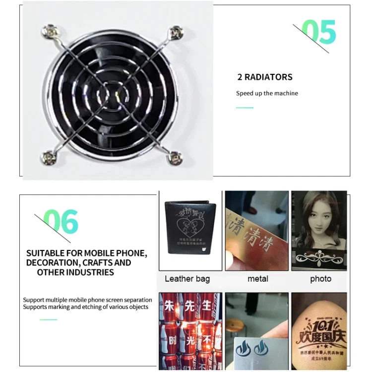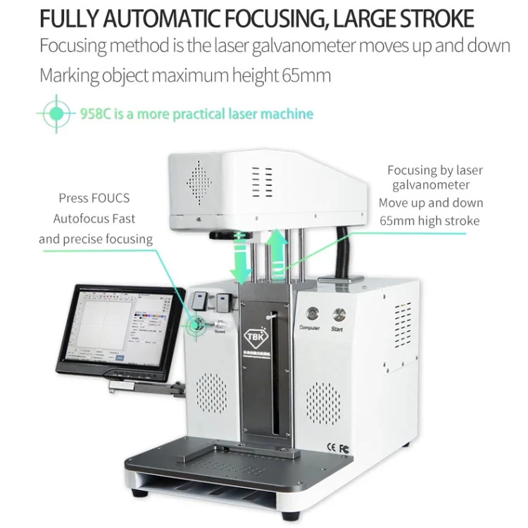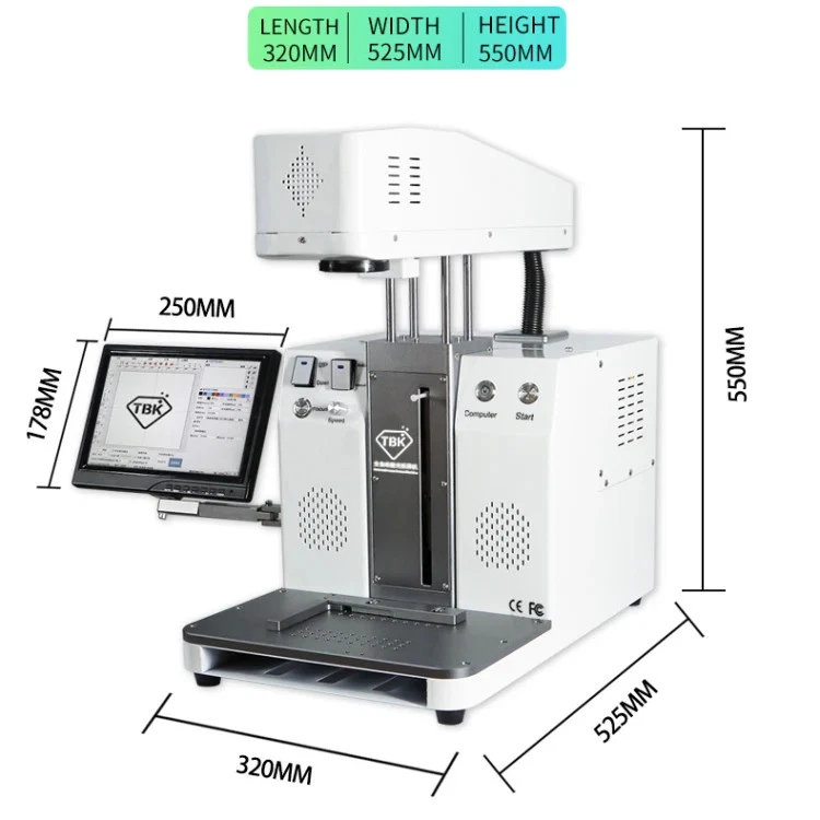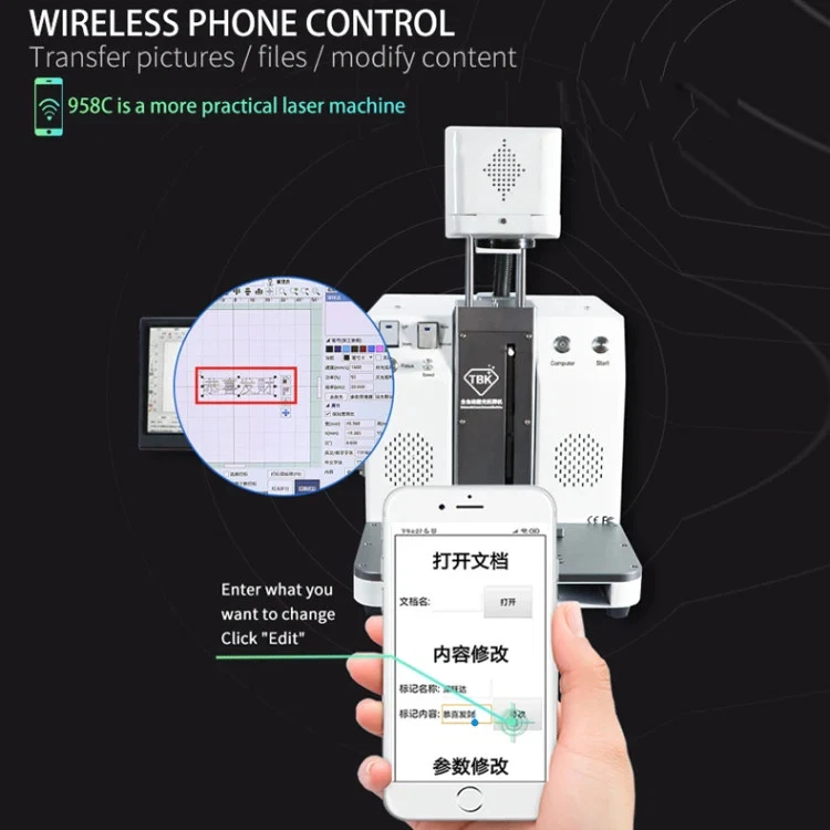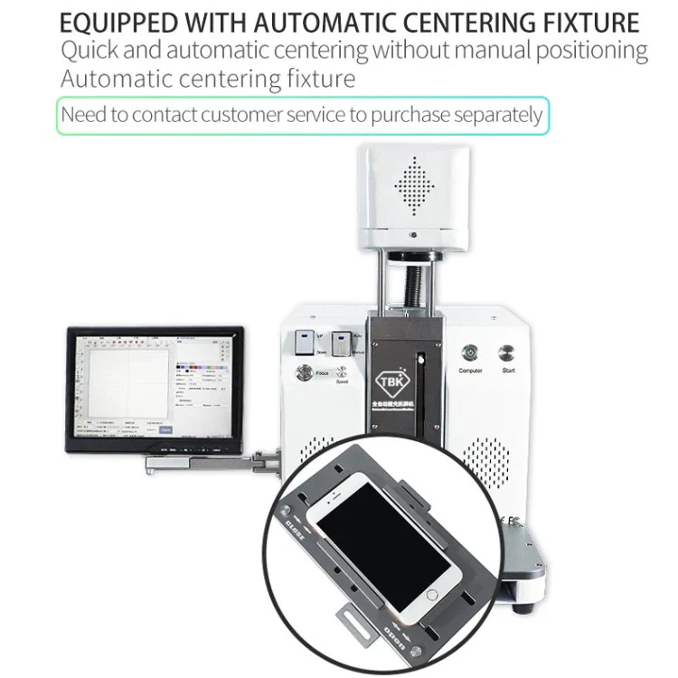 1. Can filber laser marking pictures on metal or mobile back case 2. Printing LOGO on your goods 3. Model : TBK-958C 4. Voltage: 220V/110V 5. Power: 500W 6. One-button start-up and operation simple 7. Sensor autofocus 8. Selected high speed galvanometer 9. Built-in computer and Precise drawing 10. Stable,durable,low power,high efficiency 11. Smaller size,ligh weight 12. Brand new design: wireless phone control 13. Many functions can be controlled on the mobile phone,which is efficient to use fast,easy and convenient 14. New appearance design, more concise convenient and professional 15. Laser power: 6W 16. Marking depth: 0.015-0.5mm 17. Laser Wavelength: 1064nm 18. Width of the line: 0.05-0.01mm 19. Automatic focus, Laser-head auto lifts up/down 20. Smart design of removable top-side, left-side and right-side panels is convenient for maintenance 21. Max marking size: 175 x 175mm Specification: General Certificate CE, FCC Package Weight One Package Weight 37.20kgs / 82.01lb One Package Size 60cm * 50cm * 60cm / 23.62inch * 19.69inch * 23.62inch Qty per Carton 1 Carton Weight 38.00kgs / 83.77lb Carton Size 62cm * 52cm * 62cm / 24.41inch * 20.47inch * 24.41inch Loading Container 20GP: 133 cartons * 1 pcs = 133 pcs 40HQ: 309 cartons * 1 pcs = 309 pcs