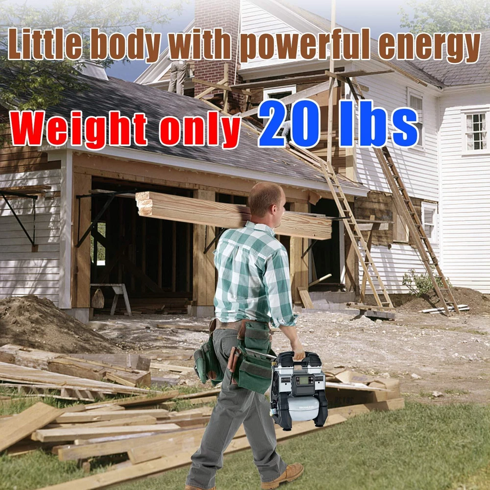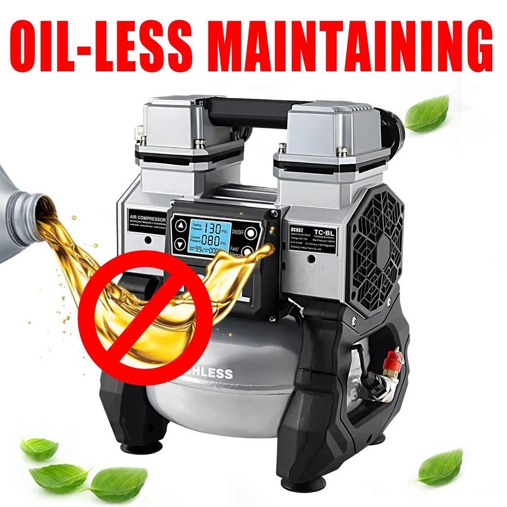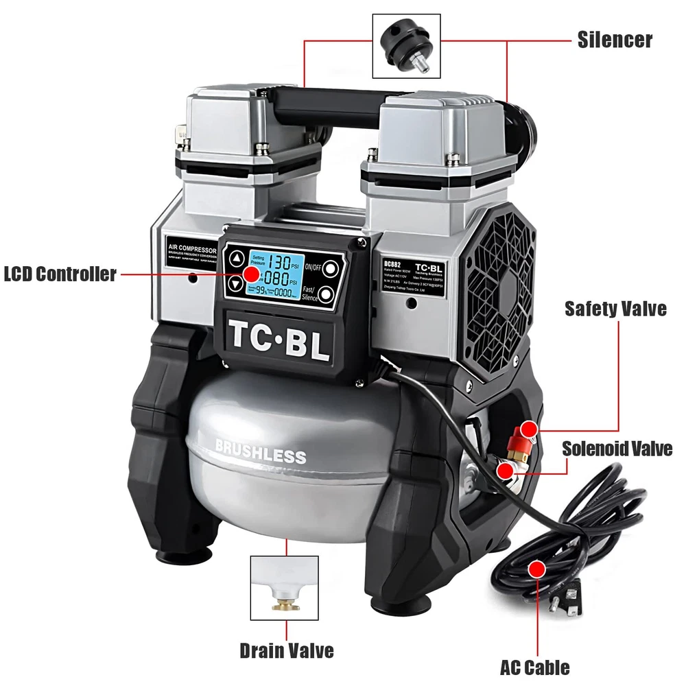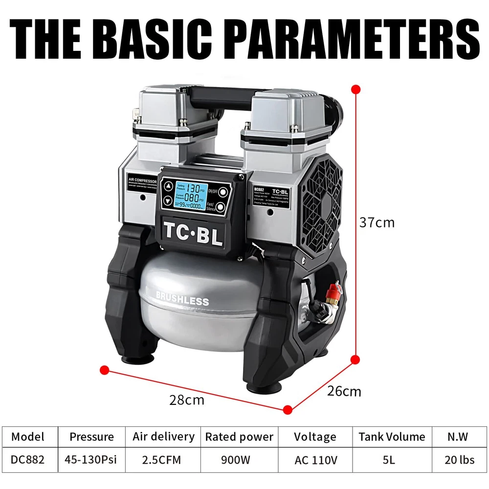 TC·BL Portable Air Compressor,110V Quiet Small Air Compressor,Lightweight and Oil free with 5L Aluminum Tank BRUSHLESS AND OIL FREE MOTOR:More power up to 900 watts, and lifetime maintenance free. PORTABLE AND POWERFUL:The N.W. of the air compressor is only 20LBS,Heavy Duty Double cylinder design,130PSI Max,2.8 SCFM@90PSI allows for quick compressor recovery time. ULTRA QUIET:Oil-free motor for maintenance-free operation,the air compressor has high and low speed mode.Low speed mode is about 60dBA and high speed mode is 75dBA noise,ensure a quiet work setting. INTELLIGENT CONTROL:The air compressor is equipped with a control panel, which can precisely adjust the air pressure. The display shows the real-time air pressure. When the air pressure reaches the set pressure, the machine will automatically stop working. WIDE APPLICATION:This air compressor is widely used in many fields,such as inflation, brad nailing, stapling and air brushing applications. TC·BL Portable Air Compressor DC882 AC110V Oilless,Ultra quiet,Lightweight Shipping We offer FREE shipping on all orders! We use a selection of shipping services such as UPS, FedEx, USPS etc. We only ship to the lower 48 states, no APO/FPO addresses or PO Boxes allowed. Local pickups and combined shipping options are not provided at this time. Return You can return a product for up to 30 days from the date you purchased it. Any product you return must be in the same condition you received it and in the original packaging. Please keep the receipt. Payment We accept payment by any of the following methods: PayPal Please pay as soon as possible after winning an auction, as that will allow us to post your item to you sooner! Feedback Customer satisfaction is very important to us. If you have any problem with your order, please contact us and we will do our best to make you satisfied. Contact Us If you have any queries, please contact us via ebay. We usually respond within 24 hours on weekdays. Please visit our eBay store to check out other items for sale! Thank you for shopping at our store.