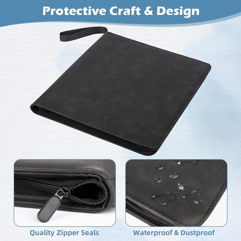 Protect, organize, and showcase your valuable card collection with this premium collectible card binders, designed for all types of standard-sized trading cards, including TCG cards, MTG cards, baseball cards, basketball cards, football trading cards. Whether you’re a hobbyist or a serious collector, this card book zipper is the perfect solution for keeping your cards safe and well-organized. The tcg binder 12 pocket includes 20 pages, each with 12 pockets on both sides, offering a total of 480 pockets for your collection. Made from transparent, durable plastic, each pocket displays your cards clearly while protecting them from damage. The side loading card binder design prevents your cards from falling out, making it easier to access and organize your collection. The high-quality leather cover of the binder is waterproof and provides excellent protection against external elements, keeping your cards safe from water, dust, and wear. Whether you need a MTG binder, a baseball card binder, or a sports card binder, this binder offers lasting durability and style. The smooth zipper closure keeps dust, dirt, and fading at bay, ensuring your cards stay in pristine condition. Perfect for card collectors, this binder is the ultimate storage solution for any binder for cards needs, providing an efficient and safe way to store and display your card collection. Whether you’re organizing football card binders or adding to your sports card binder, this binder will keep your cards secure and protected for years to come. Large Capacity to Store Up to 480 Cards – This MTG card binder includes 20 pages, each with 12 pockets on both sides, offering a total capacity of 480 standard-sized cards. Perfect for TCG cards, MTG cards, baseball cards, basketball cards, football cards, and trading cards, this card album is the ultimate storage solution for all types of cards Premium Leather Cover for Durability and Style – Made from high-quality, waterproof leather, these collectible card binders not only protects your cards from external elements but also gives it a sophisticated and durable finish. Whether you’re looking for a sports card binder, baseball card binder, this mtg card binder adds a premium feel to your card collection Crystal Clear, Durable Pockets for Display and Protection – Each pocket is made from transparent, durable plastic, allowing you to clearly see your cards while keeping them safe from damage, scratches, or bending. Whether you’re using it as an MTG binder or TCG binder, this card binder zipper ensures your collection stays pristine and protected Side Loading Design for Extra Security – The side loading card binder design ensures that your cards are inserted from the side, preventing them from slipping out. This feature provides extra security for your valuable cards, making it ideal for long-term storage and display Smooth Zipper for Full Protection – The baseball card binder is equipped with a high-quality zipper that keeps your cards secure and prevents dust, dirt, and fading. Whether it’s used as a football card binder, sports card binder, tcg binder 12 pocket, or a card collection binder, the zipper ensures your cards are kept in pristine condition for years