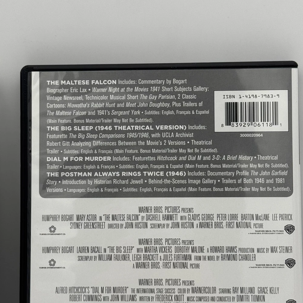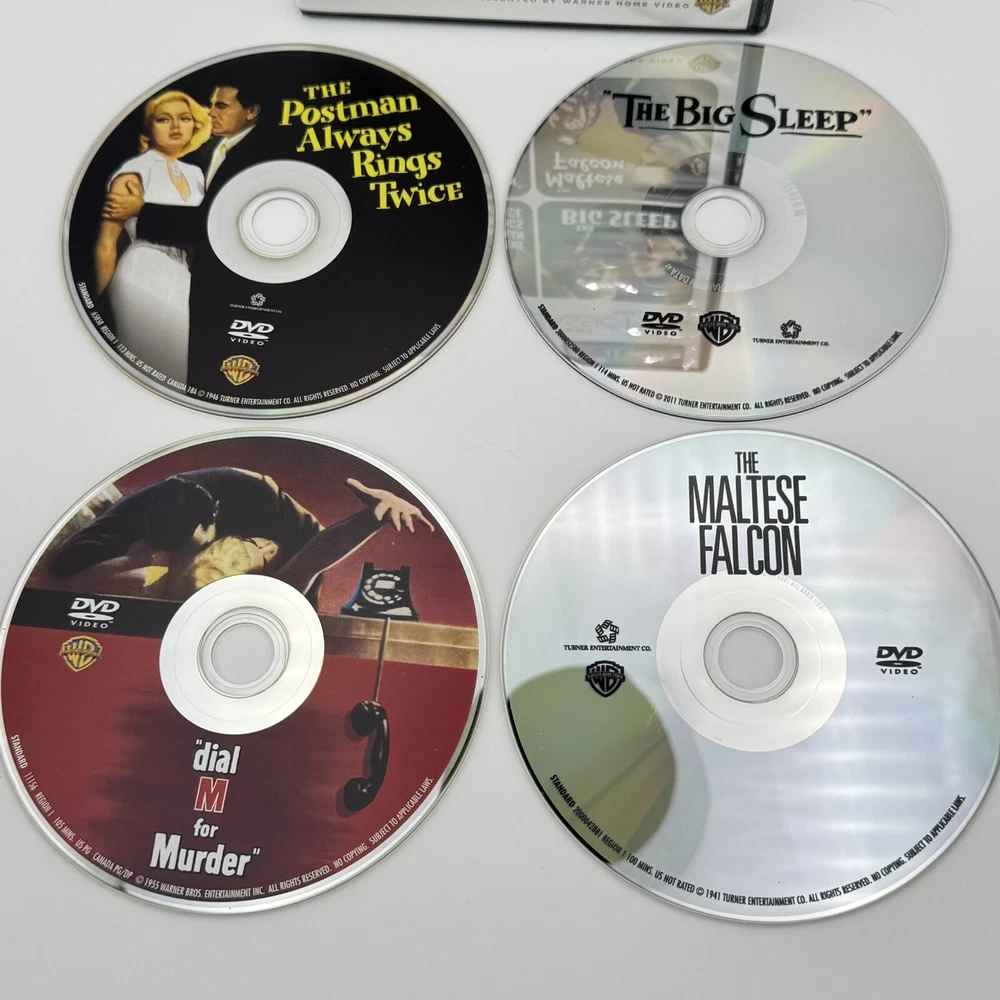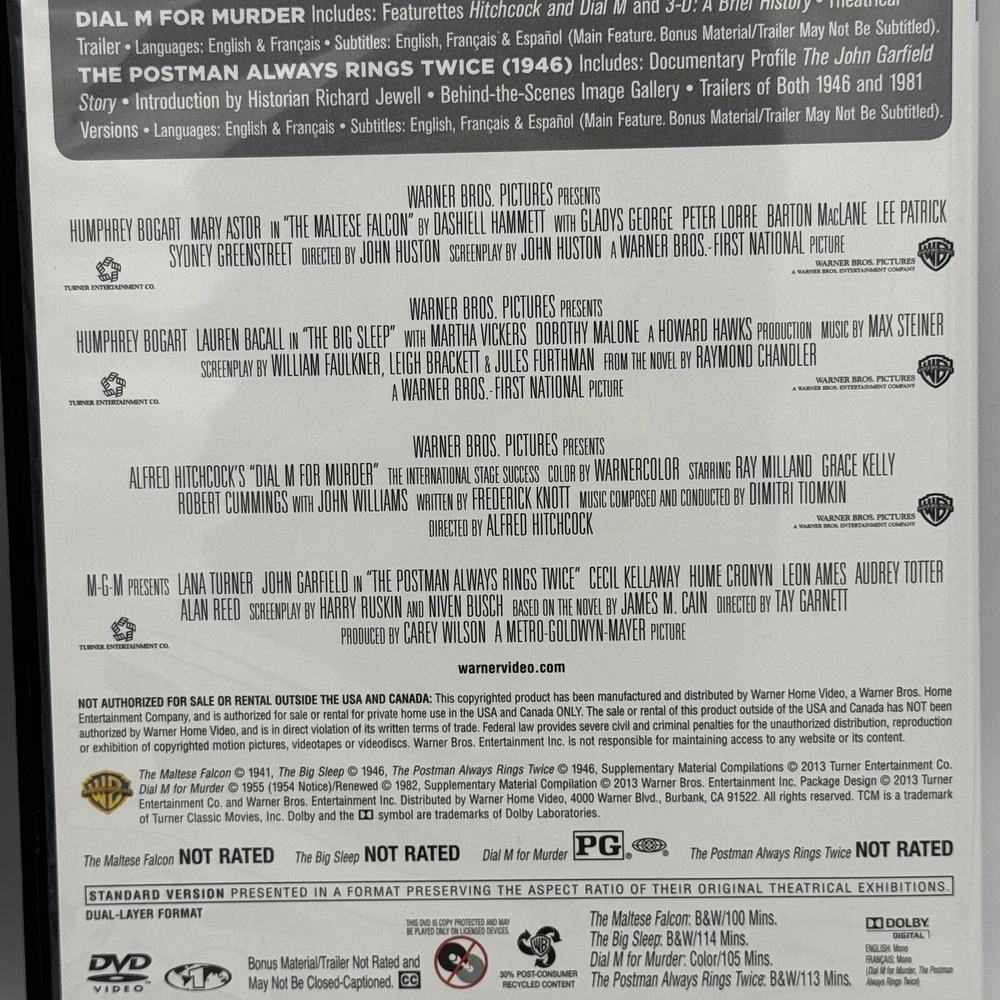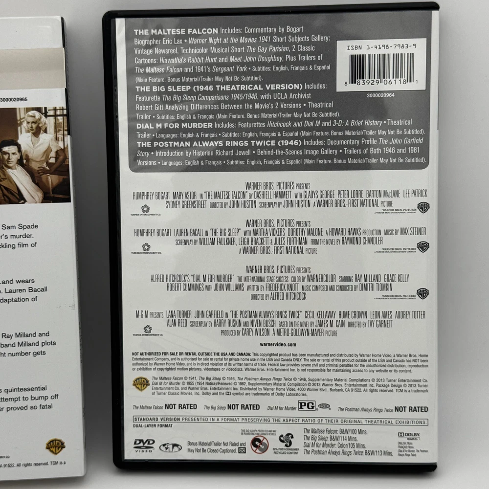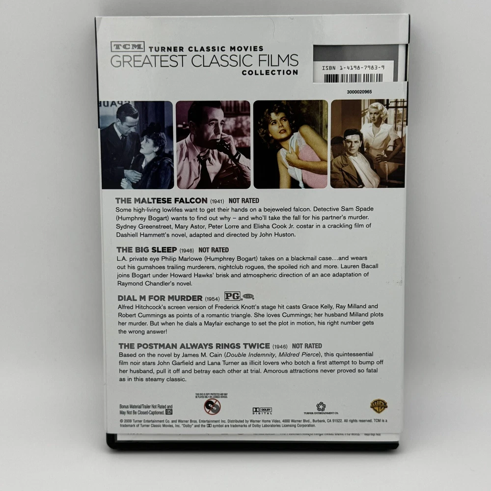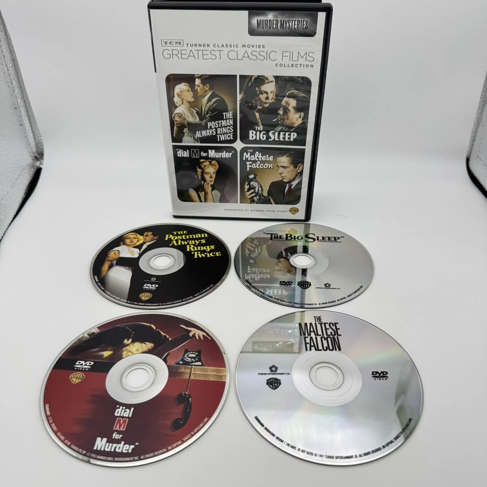 TCM Greatest Classic Films: Murder Mysteries DVD | Big Sleep Maltese Falcon VGC THE MALTESE FALCON (1941) NOT RATED Some high-living lowlifes want to get their hands on a bejeweled falcon. Detective Sam Spade (Humphrey Bogart) wants to find out why - and who'll take the fall for his partner's murder. Sydney Greenstreet, Mary Astor, Peter Lorre and Elisha Cook Jr. costar in a crackling film of Dashiel Hammett's novel, adapted and directed by John Huston. THE BIG SLEEP (1946) NOT RATED L.A. private eye Philip Marlowe (Humphrey Bogart) takes on a blackmail case... and wears out his gumshoes trailing murderers, nightclub rogues, the spoiled rich and more. Lauren Bacall joins Bogart under Howard Hawks' brisk and atmospheric direction of an ace adaptation of Raymond Chandler's novel. DIAL M FOR MURDER (1954) Alfred Hitchcock's screen version of Frederick Knott's stage hit casts Grace Kelly, Ray Milland and Robert Cummings as points of a romantic triangle. She loves Cummings; her husband Milland plots her murder. But when he dials a Mayfair exchange to set the plot in motion, his right number gets the wrong answer! THE POSTMAN ALWAYS RINGS TWICE (1946) NOT RATED Based on the novel by James M. Cain (Double Indemnity, Mildred Pierce), this quintessential film noir stars John Garfield and Lana Turner as illicit lovers who botch a first attempt to bump off her husband, pull it off and betray each other at trial. Amorous attractions never proved so fatal as in this steamy classic. ---------------- Smoke-free home. Items stored in cool, dry space. Please see photos for best description of the item’s condition. All photos are of the actual item listed for sale. We do our best to provide proper photos and descriptions of the items to insure there are no surprises once received. We will ship your item within 1-2 business days of purchase. Thank you for shopping Declutteringo!