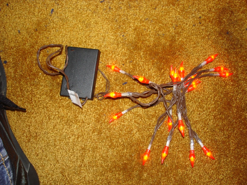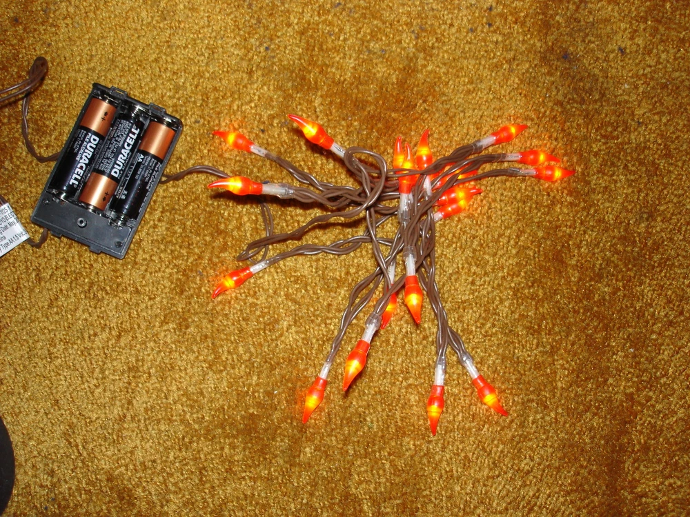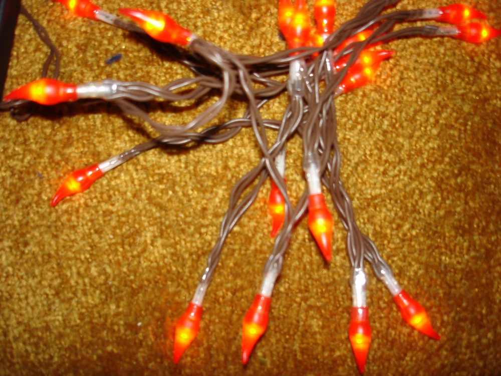 TEAR DROP BATTERY OPERATED LIGHTS 20 ORANGE THERE ARE 54 INCH LENGHT OF LIGHTS WITH APPROX 2 1/2 INCHES BETWEEN EACH OTHER. THE ARE 20 TEAR DROP BULB LOOKS RED BUT LIGHTS UP ORANGE. THESE ARE NEW. TOTAL LENGHT IS 77 INCHES INCLUDING CORD TAKES 3 DOUBLE A BATTERIES. YOU NEED TO PUT THE BATTERIES IN THE CORRECT DIRECTION OTHER WISE THEY WILL NOT WORK. CAN NOT CONNECT TO EACH OTHER ONE SET ONLY THEY ARE PLASTIC WITH A RUBBER TEAR DROP FOR INDOOR USE ONLY THESE LIGHTS HAVE BEEN OPEN AND CHECKED TO MAKE SURE THEY WORK BEFORE GOING OUT THANK YOU FOR LOOKING