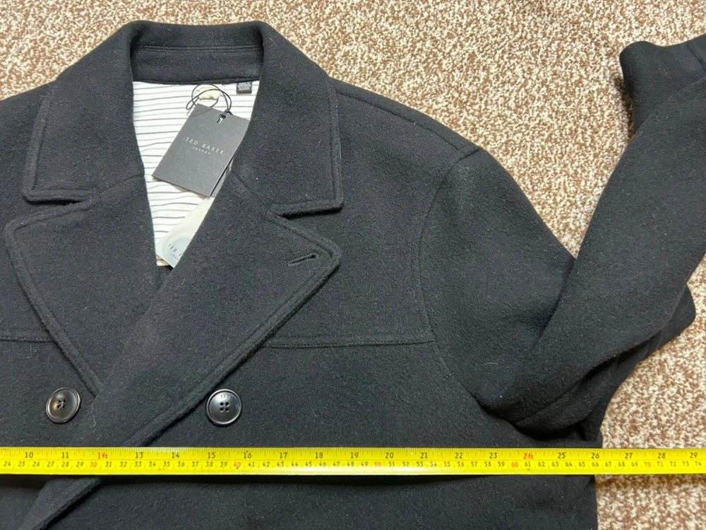 BRAND NEW Men's Black wool blend pea coat from TED BAKER Model: Atllas RRP £325 Cut from super soft wool blend fabric Double breasted button fastening Part lined in cotton Front pockets Material: 70% wool 30% polyamide Lining: 100% cotton Label size: TB5 X Large Garment measures: Pit to pit: 26" Pit to hem: 15.5" Neck to hem: 28" Pit to cuff: 17" Stock ref: NP 2430 /24014 /07114