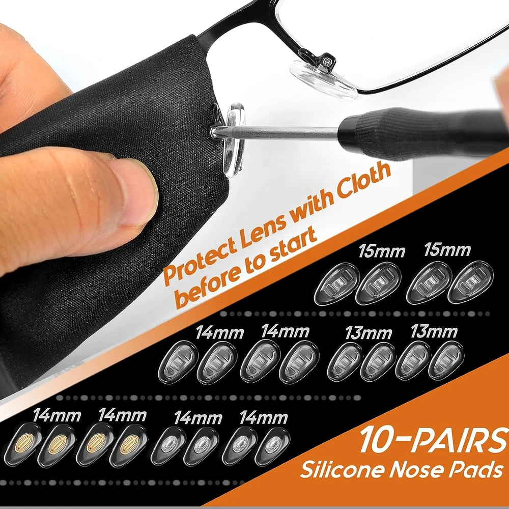 Store New Arrivals Add to Favorite View Feedback Contact TEKPREM Magnetic Eyeglass Repair Tool Kit, Eye Glasses Repairing Screwdriver Set with Eyeglass Screws,Silicone Nose Pads,Tweezer,Small Screwdriver for Eyeglasses,Sunglasses and Nose Pads Replacement Description Package Dimensions 5.16 x 3.46 x 0.67 inches; 3.53 ounces Manufacturer TEKPREM [Comprehensive Glasses Repair Kit]: All-inclusive Eye Glasses Repair Kit, featuring 15 assorted screw types, 1 small Phillips and 1 flathead screwdrivers, 10 pairs of different-sized silicone nose pads, 1 keychain screwdriver, 1 curved precision tweezer, a superfine fiber glasses-specific cleaning cloth. All these essential tools are neatly arranged within a convenient and portable plastic case, ensuring effortless storage and easy access whenever needed. [Eyeglass Repair Kit with Screws]: There are two individual 10-grid plastic boxes containing 15 varieties of eyeglass screws and 10 pairs of silicone nose pads. All the screws are securely placed in their respective grids, ensuring they remain well-organized and minimizing the risk of accidental mixing or spillage. These eyeglass screws are commonly utilized for repairing eyeglass frames, hinges, decorations, frameless designs, and for replacing nose pad screws. [Magnetic Eyeglasses Screwdrivers]: This eyeglass tool kit comes equipped with two small magnetic screwdrivers: a 2.0mm flathead screwdriver and a 2.0mm Phillips screwdriver. The magnetic tips facilitate effortless retrieval of these tiny eyeglass screws, making the process exceptionally easy and convenient. [Screw in Silicone Nose Pieces]: This kit offers a selection of 5 different types, totaling 10 pairs of silicone and plastic nose pads. Among them, you'll find 3 varieties of silicone nose pads and 2 types of plastic nose pads, available in both golden and silver-grey colors. These diverse nose pads effectively cater to a wide range of needs for eyeglass nose pad replacements, ensuring ample choices for your convenience. [Essential Precision Tweezer]: The precision curved tweezer in this kit is an indispensable tool for effortlessly picking up tiny screws or nose pads during repairs. Its pointed and sharp design ensures ease in handling, making eyeglasses repair a smooth process. Product Description Upgraded 15 types of assorted eyeglass screws and appliactions -Connect nose pads and brackets, Screws diameters are 1.0, 1.1, 1.2mm Nose Pads Screws: 1.8x1.0x3.6 1.8x5.0 1.8x1.1x3.6 2.0x1.2x3.6 -Eyeglass parts installation & fixation Frame Screws: 2.5x1.4x2.5 2.5x1.4x3.0 2.5x1.4x3.5 2.5x1.4x4.0 2.5x1.4x5.0 2.5x1.4x6.0 2.5x1.4x7.0 2.5x1.4x8.0 -Connect eyeglass frame and legs,make it easy to fold and store. Hinge Screws: 2.5x1.4x4.0 2.5x1.4x5.0 2.5x1.4x6.0 2.5x1.4x7.0 2.5x1.4x8.0 2.5x1.6x4.0 2.5x1.6x5.0 3.0x1.7x5.0 -Decorative & Frameless Screws Frameless Screws: 2.0x1.2x3.6 3.0x1.7x5.0 2.5x1.4x6.0 2.5x1.4x7.0 2.5x1.4x8.0 Decorative screws: 2.5x1.4x2.5 2.5x1.4x3.0 2.5x1.4x3.5 Note: No nuts included in this kit. A Must Have Tool for Glasses Repair -Precision Tweezer Included in this kit is a Precision Curved Tweezer designed to enhance your repair experience, setting it apart from other toolkits that provide only standard, tiny, or plastic tweezers. The precision curved tweezer included in this kit is an essential tool, facilitating the effortless handling of small screws or nose pads during repairs. It's crucial to ensure that the screw is completely loosened before utilizing the tweezer to extract it. To prevent damage to the screw hole, exercise caution and refrain from applying excessive force when removing the screws. Small handle, Light and Accurate Fit Eyeglass Repair Screwdriver Tired of disappointing eyeglass screwdrivers that fall short of expectations? Introducing our solution: the black P#00 Phillips screwdriver and 2.0mm flathead screwdriver, precisely crafted to perfectly match the majority of eyeglass screws. These magnetic, compact, and lightweight screwdrivers are easy to handle, boasting a flexible swivel cap for convenient screwing. With these tools, replacing your eyeglass nose pads becomes a breeze. They are also versatile enough to tackle other screws on your eyeglasses. It's crucial to note that these screwdrivers are intentionally small and light, measuring 4.61 inches in length and weighing only 0.21 ounces. This design is tailored for eyeglass repair, offering a more practical alternative to bulky-handled screwdrivers. Keychain Screwdriver 4 in 1 keychain eyeglass screwdriver with small phillips,flat and 2 hex socket tip for normal and frameless glasses repair. Magnetic Eyeglass Screwdriver The screwdrivers are magnetic to hold tiny eyeglass screws and make it convenient for eyeglass repairs. 10 Pairs of Eyeglass Nose Pads 5 Types of 2 Pairs each nose pads They're 3 types of silicone nose pads and 2 types of plastic nose pads in golden and sliver grey color. Complete and portable eyeglass repair kit This is TEKPREM new upgraded eyeglass repair tool kit with include everything you need for eyeglass repairs. All packed in a small plactic box with seperated grid. Small and light plactic box, easy to store. ABOUT US We offer the best prices around on high quality products. Our E-store includes media such as books, movies, music and games while offering electronics, toys, sporting apparel, clothing, tools, general home, garden items and more. SHIPPING We are always working hard to ensure your package arrives as soon as possible. Please understand that some factors like weather, high postal traffic, and the performance of shipping companies are outside of our control. We offer free shipping to the lower 48 states and ship within 2 business days of payment, usually sooner. We do not accept P.O. Boxes. Please provide a physical address. RETURNS We offer a 30-Day Return Policy on items which you are not completely satisfied with. You have the option for a full-refund or an exchange of the item. No returns are available on it