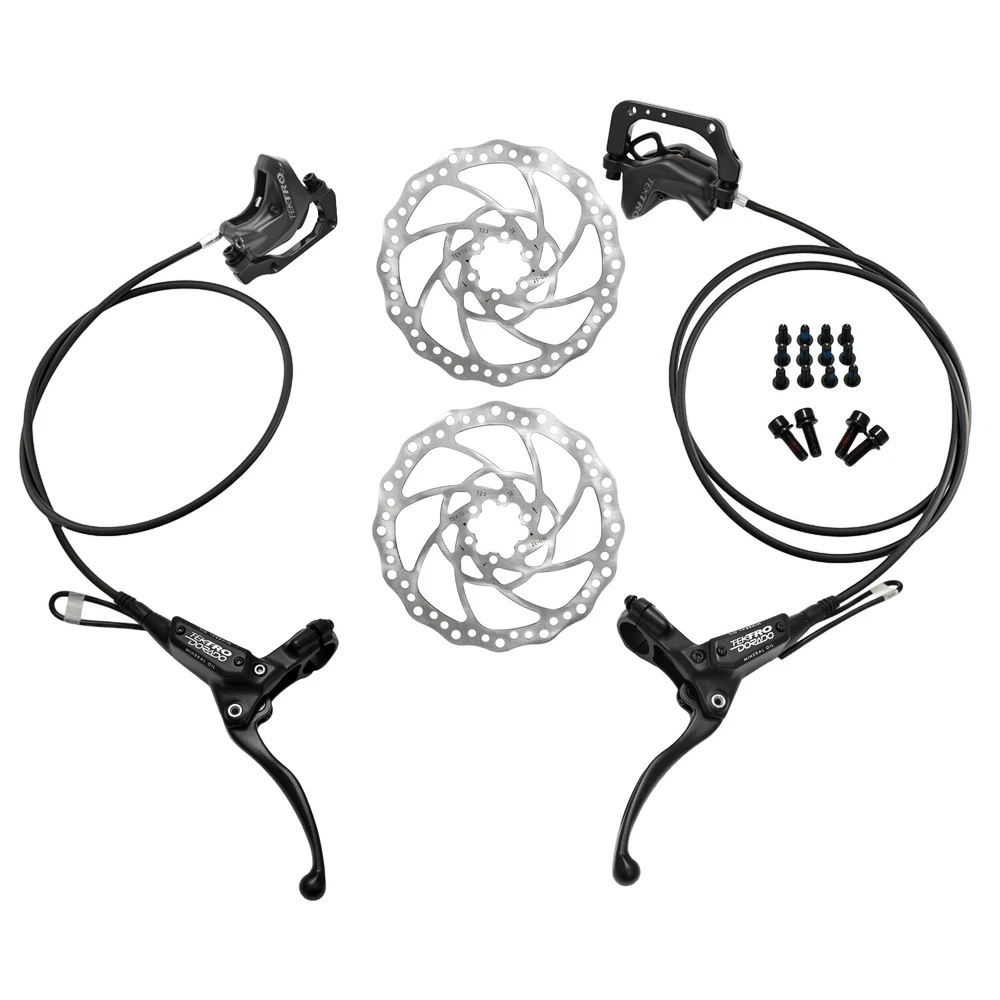 - Open system, 4 piston - With power cut-off sensor, Thicker rotor & ball-end design - Powerful & durable brake for 45km/hr E-bikes - Easy installation, adjustment and maintenance Lever - Forge aluminum lever / bracket - Two pieces clamp - 4 finger blade with ball end - Reach adjustment - Finish : Black(as pic. shown) Caliper - 4 Piston forged aluminum body - Free angle of hose connector for varied frames - 2.3mm thickness rotor - Easy installation & maintenance from top - Finish : Black (as pic. shown) Pads - Overall balance resin pad - Upload replacement Rotor - 2.3mm thickness - High heat dispersion & heat tolerance - Diameter :180mm x2 Hose Length: Front: 900 mm / Rear: 1500 mm Weight: Front wheel approx. 420grams / Rear wheel approx. 446grams (Excludes rotor & mounting bolts) Package includes: - Brake caliper x2 (Front and Rear) - Brake lever x2 (Left - front and Right - rear) - Hose x2 - Brake pad x2 - 180mm Rotor x2 SP ID: MH2713 Payment Shipping Returns Now eBay manages the end-to-end payments process. If you have any payment problem, please feel free to directly contact Ebay customer service. All items are shipped within 3 business days after received your payment. The delivery time depends on destination and other factors. If the item that your ordering is out of stock, we will refund the money to you. If you are not satisfied with this item, just simply notice us in 3 days after you received item, before you decide to ship item back, make sure to contact us via E-mail for shipping address. Shipping and handling fees are non-refund. Customers will be responsible for all return shipping cost. Returns without original package will not be accepted. designed by