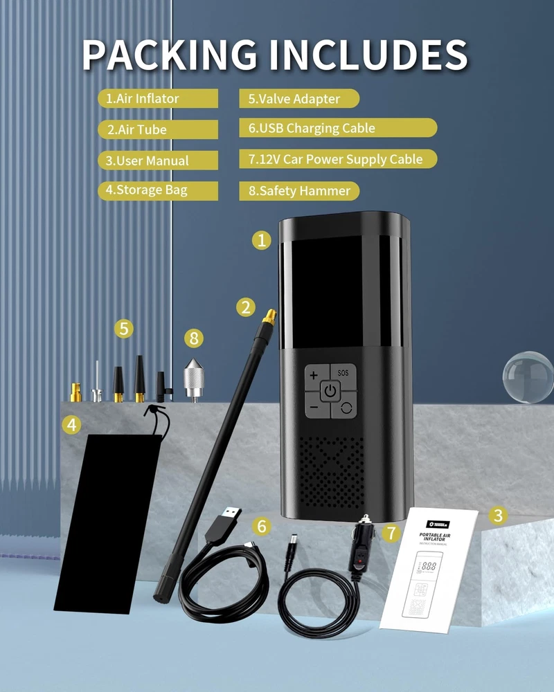 TEMOLA Tire Inflator Portable Air Compressor, Air Pump for Car Tires 150PSI Cordless Air Compressor Portable With Pressure Gauge, 12V DC Tire Pump for Car Motorcycle Bicycle, Car Accessories SIMPLE AND FAST TIRE INFLATOR: The tire inflator portable air compressor is very easy and convenient to use. All you need to do is connect the air pump to the valve, press the start button and it will start inflating. The air pump for car tires can inflate a 195/55/R15 auto tire from 0 to 35psi in 5 minutes, and the air compressor for car will automatically shut off when the car tire air pump portable reaches the preset pressure. DUAL POWER SUPPLY MODE AIR PUMP: The TEMOLA air compressor portable is equipped with a dual power supply, so you can switch between cordless and electric inflation at any time. The electric air pump has a built-in rechargeable 2000mAh*2 battery and can be used to inflate the automotive directly after a full charge. You don't need to worry if the battery runs out on the road because the portable air compressor comes with a 12V DC power cord for Road Rescue emergencies. DISPLAYS AND LED LIGHTS TIRE PUMP: The portable tire inflator for cars displays PSI, BAR, KPA, and KG/CM² and contains an ultra-bright display that makes it easy to use even at night. To properly address nighttime filling work, the car accessories for men are equipped with an LED lighting function with independent switch control for emergency use. MULTI-ACCESSORIES ELECTRIC PUMP: The portable air pump for car tires is suitable for filling any Presta Valve Adapter on cars, SUVs, motorcycles, and bicycles, in addition to which the car air pump comes with 3 additional nozzles (including needle valve adapter, air nozzle cone, and Schrader Valve Adapter). Cater to your various inflatable needs such as sports balls, air mattresses, pool toys, and other inflatable equipment. PACKAGE LIST TIRE COMPRESSOR: You can store the mini air pump anywhere in your vehicle and take it out whenever you need to. Car decor travel essentials package includes Air inflator * 1, Presta to Schrader adapter * 1, Air nozzle cones * 2, Needle valve adapter * 1, Replacement Fuse * 1, User manual * 1, Safety Hammer*1, Storage Bag*1. SIMPLE AND FAST TIRE INFLATOR: The tire inflator portable air compressor is very easy and convenient to use. All you need to do is connect the air pump to the valve, press the start button and it will start inflating. The air pump for car tires can inflate a 195/55/R15 auto tire from 0 to 35psi in 5 minutes, and the air compressor for car will automatically shut off when the car tire air pump portable reaches the preset pressure. DUAL POWER SUPPLY MODE AIR PUMP: The TEMOLA air compressor portable is equipped with a dual power supply, so you can switch between cordless and electric inflation at any time. The electric air pump has a built-in rechargeable 2000mAh*2 battery and can be used to inflate the automotive directly after a full charge. You don't need to worry if the battery runs out on the road because the portable air compressor comes with a 12V DC power cord for Road Rescue emergencies. DISPLAYS AND LED LIGHTS TIRE PUMP: The portable tire inflator for cars displays PSI, BAR, KPA, and KG/CM² and contains an ultra-bright display that makes it easy to use even at night. To properly address nighttime filling work, the car accessories for men are equipped with an LED lighting function with independent switch control for emergency use. MULTI-ACCESSORIES ELECTRIC PUMP: The portable air pump for car tires is suitable for filling any Presta Valve Adapter on cars, SUVs, motorcycles, and bicycles, in addition to which the car air pump comes with 3 additional nozzles (including needle valve adapter, air nozzle cone, and Schrader Valve Adapter). Cater to your various inflatable needs such as sports balls, air mattresses, pool toys, and other inflatable equipment. PACKAGE LIST TIRE COMPRESSOR: You can store the mini air pump anywhere in your vehicle and take it out whenever you need to. Car decor travel essentials package includes Air inflator * 1, Presta to Schrader adapter * 1, Air nozzle cones * 2, Needle valve adapter * 1, Replacement Fuse * 1, User manual * 1, Safety Hammer*1, Storage Bag*1. Shipping from the USA All of our products are shipped from the USA, ensuring quick delivery to your destination. Payment We offer the following payment methods: PayPal, credit card, bank transfer, and eBay's secure payment system. Free Shipping & Free Returns Shipping within the USA is FREE. Additionally, any return is absolutely free for you. Risk-Free Purchase You have the option to return an item within 30 days without any justification. We cover the return shipping costs! Fast Shipping We ship immediately upon receipt of payment. Generally, the package is delivered within 2-3 days in the USA. If it takes longer, we will contact you. Quality and Costs Made in Europe, USA, China No customs fees or additional charges Total satisfaction guarantee Invoice with declared VAT available upon request in .pdf format Feedback Your feedback is very important to us. After you pay for your purchase, you will automatically receive positive feedback from us.