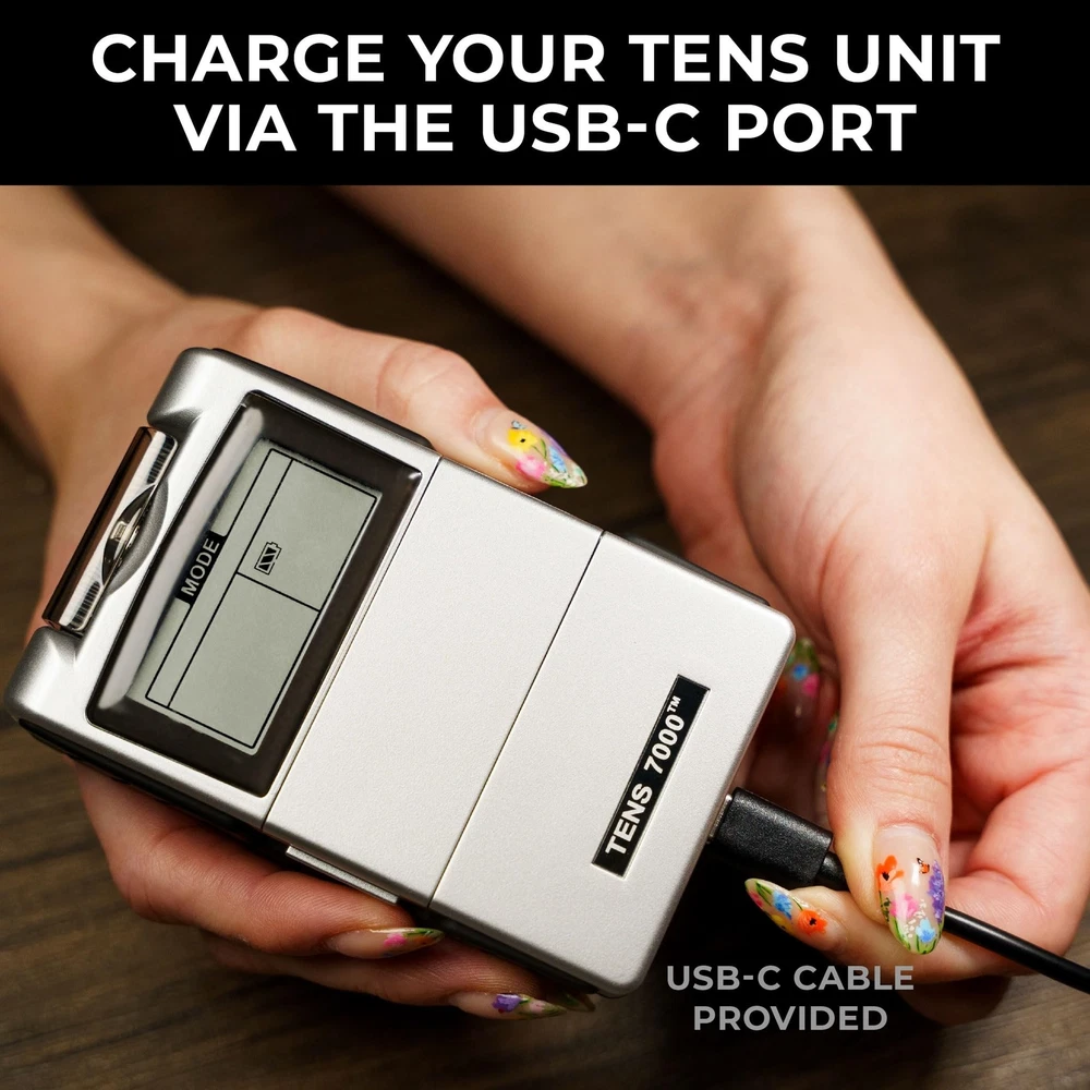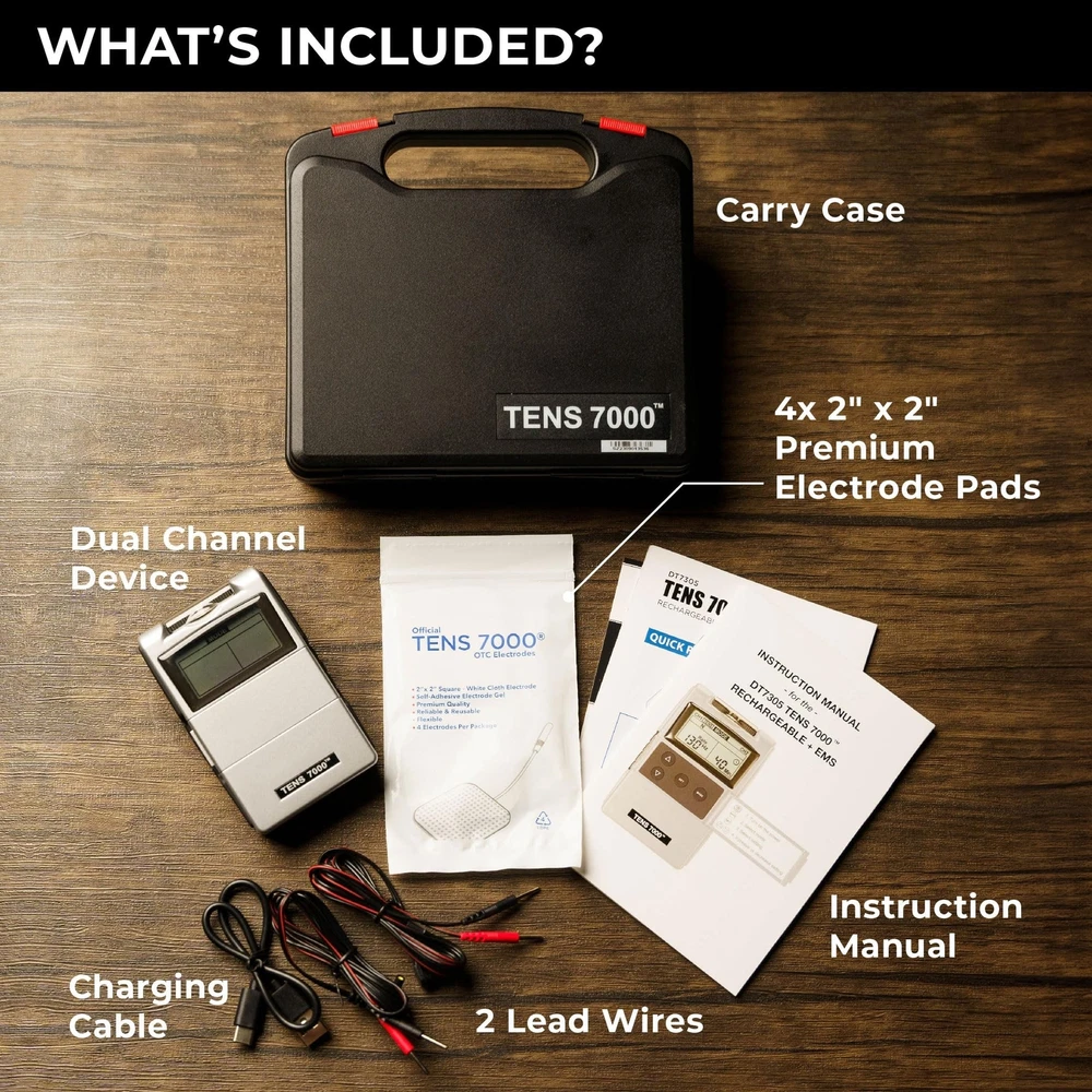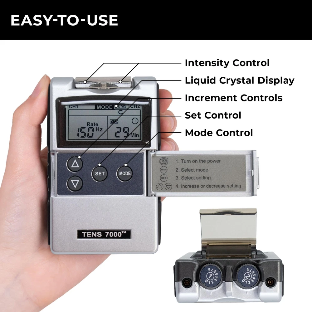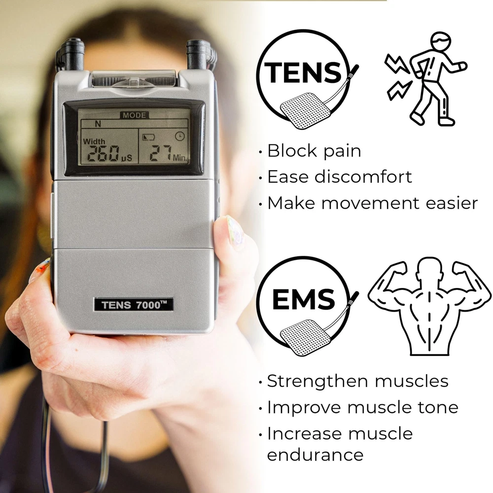 TENS 7000 Rechargeable Tens Unit Muscle Stimulator, EMS Muscle Stimulator, Back Pain Relief, 4 Electrodes/Unit Pads, Period Pain Simulator, Muscle Recovery & Growth, Stim Machine, Electrotherapy Product Details Product Dimensions : 4 x 2.5 x 1 inches; 13.44 ounces Item model number : DT7305 Date First Available : February 4, 2024 Manufacturer : Compass Health Brands Country of Origin : China Best Sellers Rank: #46,463 in Health & Household (See Top 100 in Health & Household) #116 in Muscle Stimulators & Accessories #116 in Muscle Stimulators & Accessories Customer Reviews: 4.3 4.3 out of 5 stars 154 ratings Rechargeable TENS & EMS Therapy: The TENS Unit combines TENS for pain relief with EMS (Electrical Muscle Stimulation) for muscle recovery and growth. Target back pain, neck pain, sciatica, and more with adjustable settings for personalized comfort Long-lasting Pain Relief: Rechargeable TENS unit eliminates the need for constant battery changes, so you can experience uninterrupted pain relief during extended therapy sessions. Focus on managing your pain with our muscle pain relief machine Precise & Targeted Electric Shock Therapy For Muscles: The TENS 7000's design delivers targeted electrical stimulation to specific areas. Included electrodes ensure easy application, while intuitive controls let you adjust intensity for a customized experience. More Than Pain Relief: Beyond pain management, this TENS unit muscle stimulator promotes muscle recovery and growth, ideal for fitness enthusiasts. TENS Unit helps alleviate back pain, neck pain, carpal tunnel relief, menstrual cramp relief, and more Take Your Life Back: TENS 7000 devices are on the FSA HSA approved products only list. This user-friendly muscle stimulator and electric massagerh elps manage pain, recover muscles, and even ease period pain and menstrual pain discomfort
