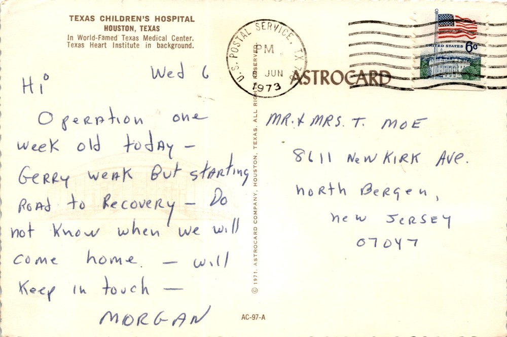 MAKE AN OFFER. THE MORE YOU BUY THE BETTER DEAL I WILL ACCEPT The postcard is dated June 1973 and features an image of Texas Children's Hospital in Houston, Texas, located in the renowned Texas Medical Center. The hospital is known for its specialized care for children and is affiliated with the Texas Heart Institute, which can be seen in the background of the image on the postcard.The postcard is addressed to Mr.