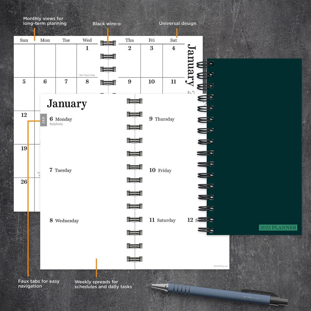 TF PUBLISHING 2025 Deep Jade Small Weekly Monthly Planner - 2-Page Large Calendar Grid and Lined Notes Section in Back - 12 Month Monthly Day Planner for Purse - 3.5" x 6.5" TF Publishing’s 2025 Deep Jade Small Weekly Monthly Planner makes planning and being organized easy! Start each month with a 2 page calendar grid while the 2 page weekly spread lets you plan out each day. The covers are durable, look good, and help it lay flat in combination with the wire-o binding. Faux monthly tabs are also included for easy access to your plans. FRESH AND STYLISH: This small weekly monthly planner featuring a jade green cover is made for productivity! The layout makes organizing and planning simple and it easily fits in your pocket, backpack or purse so you can bring it with you! ORGANIZATION ESSENTIAL: Track your plans easily with this 3.5" x 6.5" pocket planner covering January 2025 through December 2025. This monthly calendar is full of planning potential and you’ll have all of your information in one convenient place! STRAIGHTFORWARD DESIGN: This daily planner features 2-page monthly calendar grids with ample writing space and weekly planning pages for your plans and schedule. Notes pages and a bonus page with views of 4 months from the previous year are included. The covers don’t just look good—they’re also durable! This checkbook size calendar will be protected wherever you take it. The sturdiness and thick uncoated paper ensure that you’ll have it until the last monthly spread is finished! TRUSTED BRAND: Founded in 1996, TF Publishing is one of the U.S.' largest producers of stationery goods with a diverse range of licensors, artists, and photographers. Our 2025 product line embraces a plastic-free lifestyle that is fully recyclable. Shipping from the USA All of our products are shipped from the USA, ensuring quick delivery to your destination. Payment We offer the following payment methods: PayPal, credit card, bank transfer, and eBay's secure payment system. Free Shipping & Free Returns Shipping within the USA is FREE. Additionally, any return is absolutely free for you. Risk-Free Purchase You have the option to return an item within 30 days without any justification. We cover the return shipping costs! Fast Shipping We ship immediately upon receipt of payment. Generally, the package is delivered within 2-3 days in the USA. If it takes longer, we will contact you. Quality and Costs Made in Europe, USA, China No customs fees or additional charges Total satisfaction guarantee Invoice with declared VAT available upon request in .pdf format Feedback Your feedback is very important to us. After you pay for your purchase, you will automatically receive positive feedback from us.