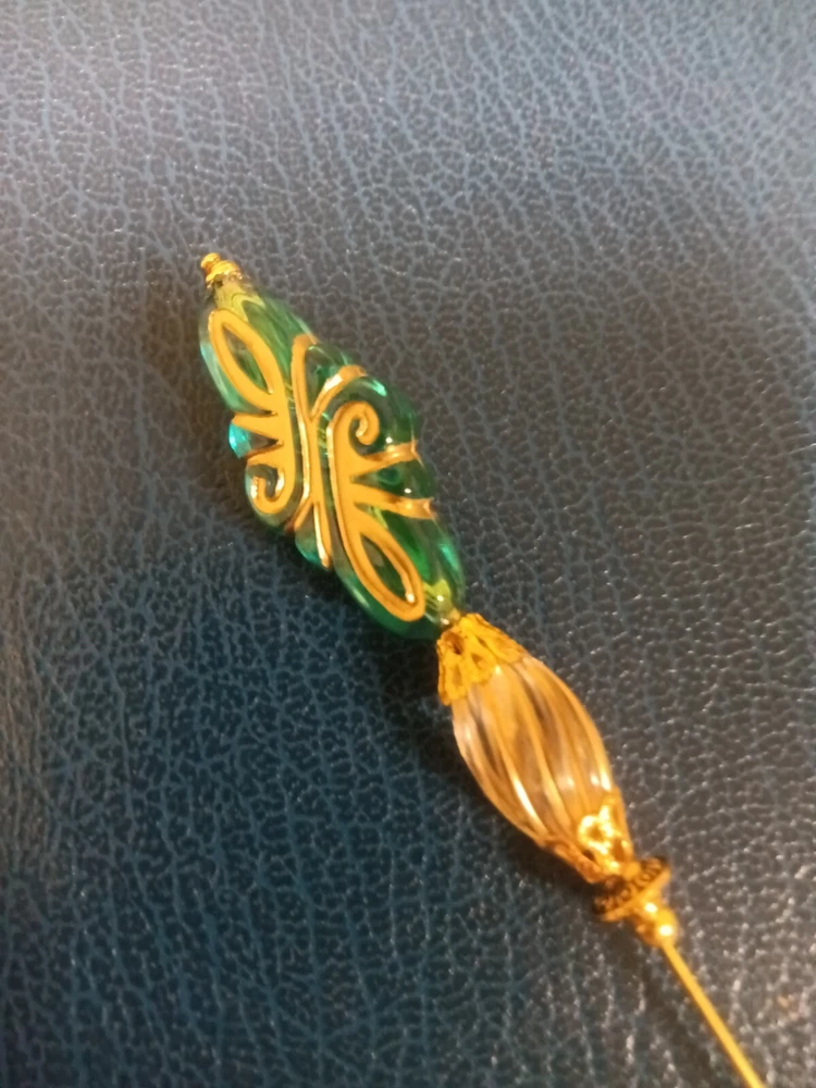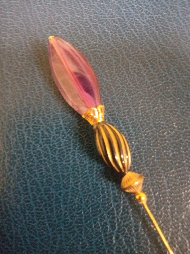 Three Very Fancy Art Deco styled Hat Pins. In the Victorian/Edwardian styled Hat Pins. Each pin is a long 8". Gold toned metal trim. Safety end caps included. Hat Pins by Joanne. Thanks for looking and check back often.