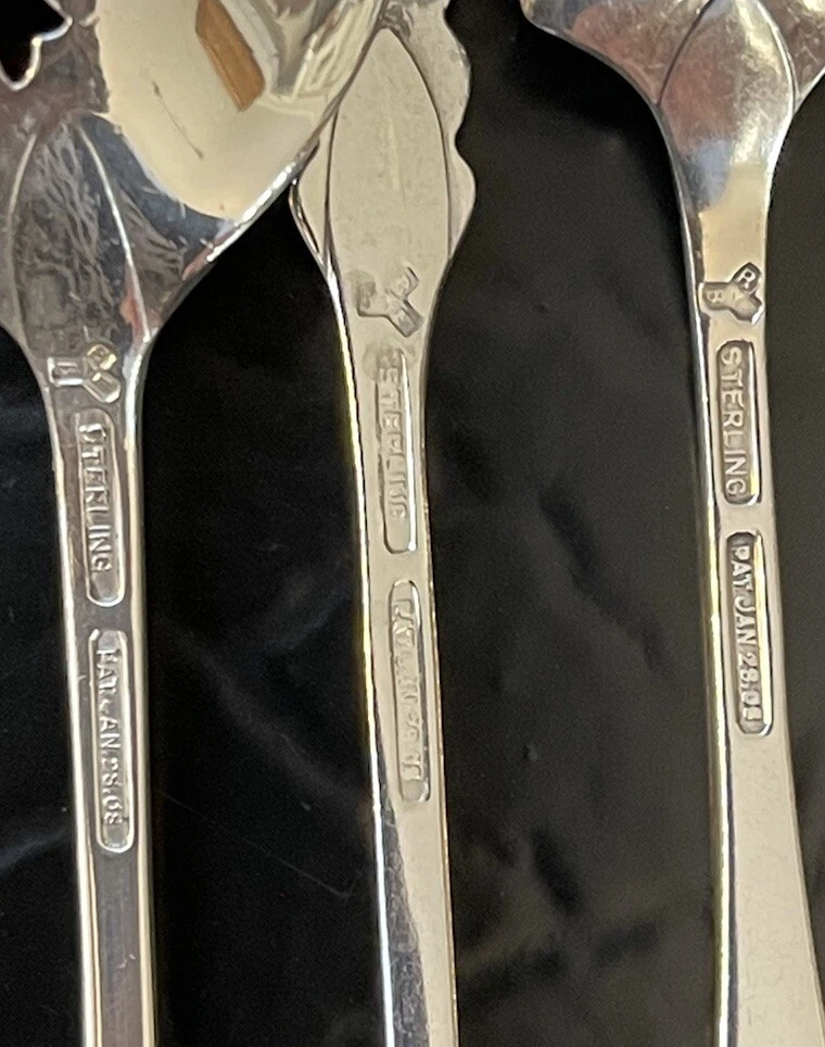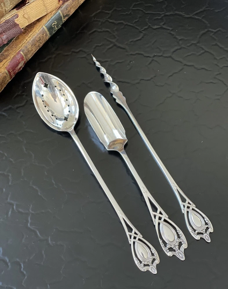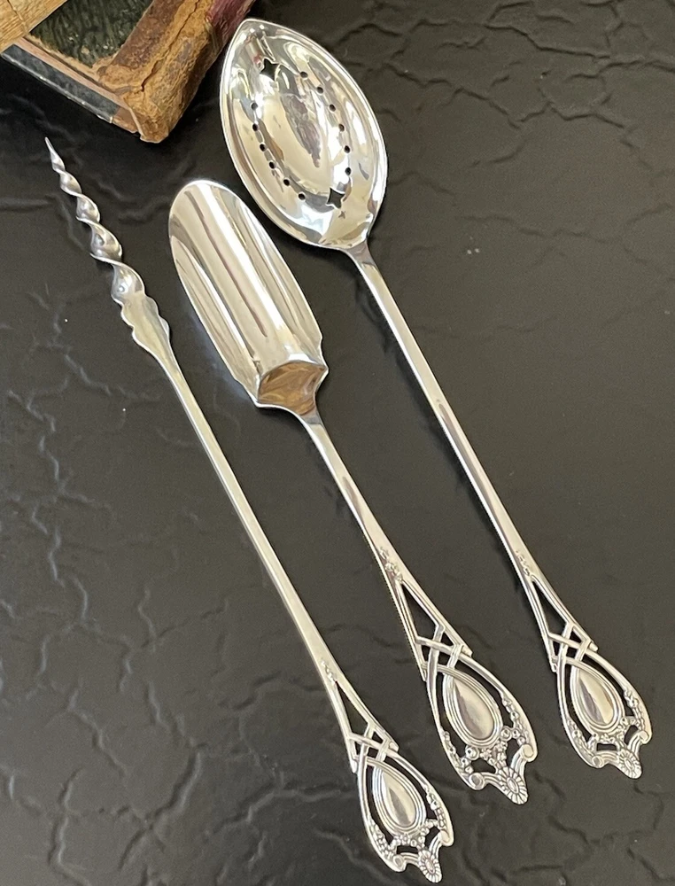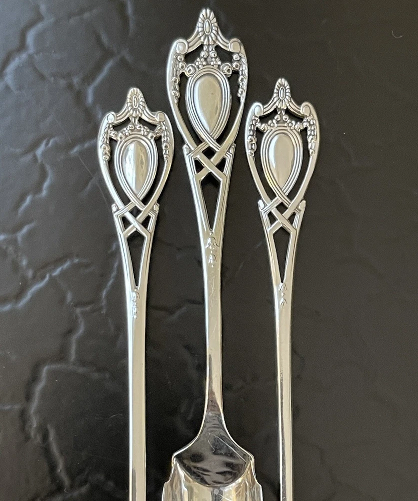 Stunning Set of THREE Rare Original Antique Lunt Monticello Sterling Silver Dining Serving Pieces β’ Olive Butter Cheese Set β’ Superb Stylish Examples β’ Kindly View Photo Gallery β’ 1.361 ozt Beautiful set of THREE fine extremely rare gleaming Lunt Monticello serving pieces, just perfect for your next celebration, party or holiday gathering. Glorious serving set includes one butter pick 6.5β, one pierced bowl olive spoon 6.4β, and one Stilton cheese scoop 5.5β. A stunning addition to any collection of American silver to be used and enjoyed for generations. Lightly hand polished to reveal luminous silver shine. Superb original examples in signature Monticello pattern by LUNT, c1908. Excellent antique condition with quality feel in hand. Sumptuous design featuring elegant classical cartouche motif. Sterile and ready to use. Happy Bidding!