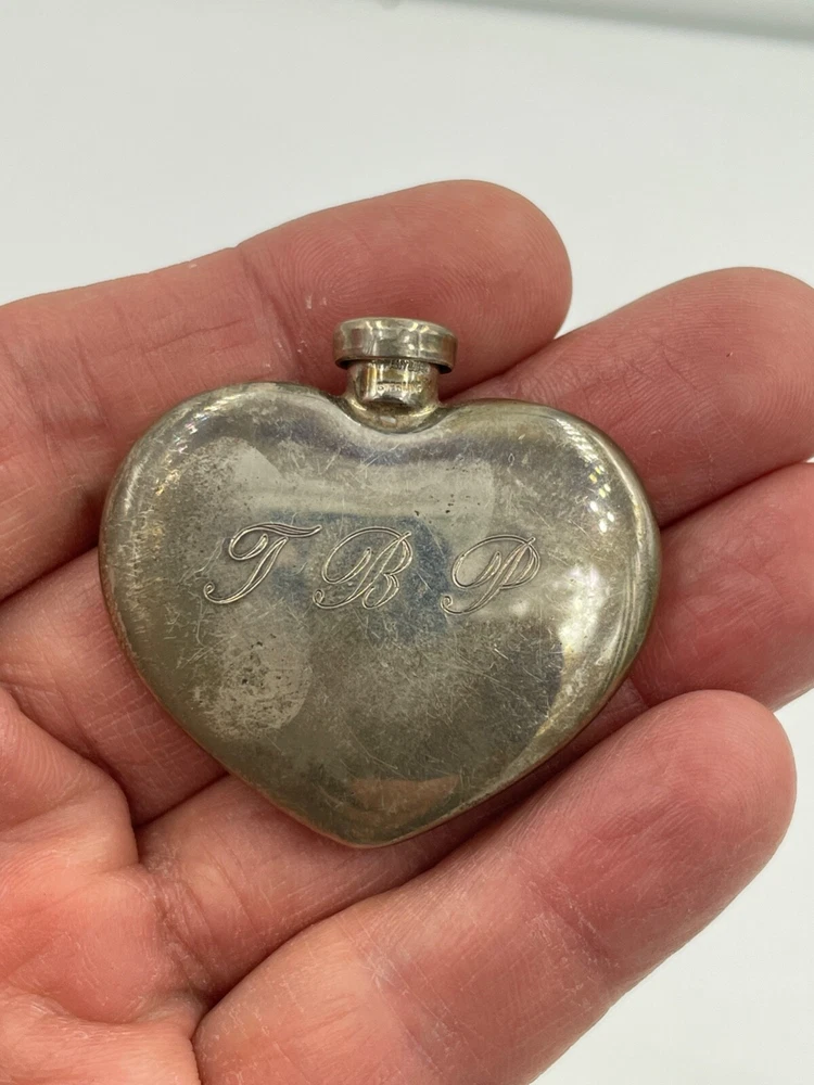 Mid Century Tiffany & Co. Heart shape perfume bottle flask with heavy patina throughout. It's monogrammed shown in the pictures, has light scrathces unpolished. We don't polish any of our vintage items we leave this up to the discretion of the buyer. It measures 1 3/4" by 1", weighing 16.7 grams. Monograms can be easily removed if desired. We are jewelers all of our items are professionally inspected and tested, we guarantee all of our items to be as described. We have many other hard to find items listed so please take a look, you never know what you might find. Thank you and happy shopping.