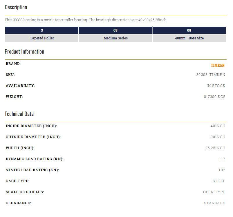 TIMKEN 30308 Taper Roller Bearing 40x90x25.25mm Description TIMKEN 30308 Taper Roller Bearing 40x90x25.25mm On Mar 12, 2025 at 01:47:55 PDT, seller added the following information: