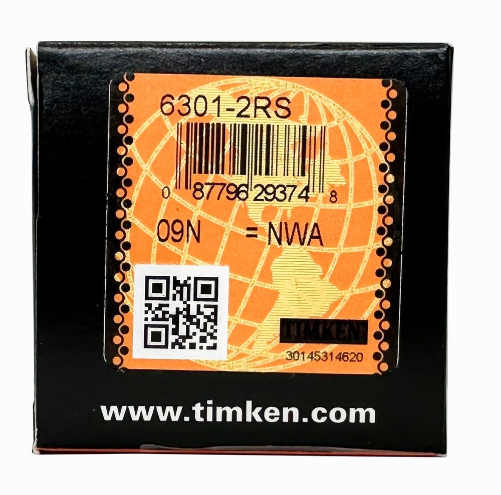 TIMKEN BEARINGS MODEL:6301-2RS Specifications Clearance : C0(Normal) Bore Size d: 12 mm Features : Contact Seals Bearing Type : Standard DGBB Weight : 0.060 Kg Dimensions Outside Diameter D : 37.000 mm Outside Ring Width B : 12.000 mm Radius Rs min : 1.000 mm Basic Load Ratings Cr - Dynamic Load Rating : 9.7 kN C0r - Static Load Rating : 4.2kN Factors Grease Reference Speed : 19000 rpm Oil Reference Speed : 27000 rpm FREE RETURN FOR 30 DAYS!
