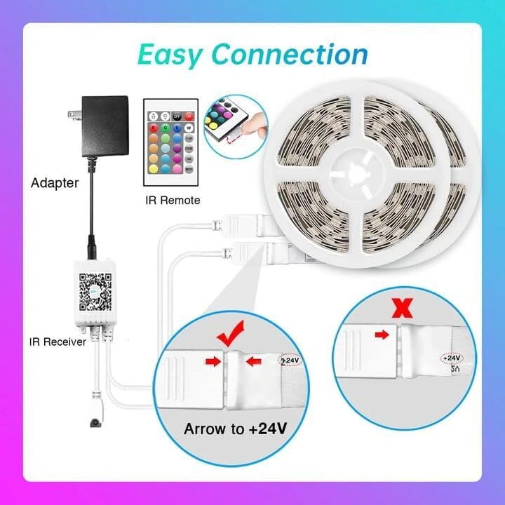 TJOY 100ft Bluetooth LED Strip Lights, Music Sync 100ft, Multi-colored RGB Product Details Color: Multi-colored RGB Brand: TJOY Indoor/Outdoor Usage: Indoor Special Feature: Color Changing Light Source Type: LED Power Source: AC Adapter (DC Power Supply) Light Color: Multicolor Theme: Music Occasion: Christmas Style: Modern Upgraded LED Lights 100 ft - 100ft LED strip lights, super long led light enough to reach around your room and Brightness enough to ignite the heart of happiness. These RGB LED light strips very suitable for decorating your Bedroom,Upstairs,Kitchen,Ceiling,Computer desk, and Living rooms, Holidays,Parties.It will also be a great present for your kids. 2 Control Ways - 1 Self developed Bluetooth app close to users' habits:DIY more than 16 million colors,adjust the brightness and switch as you like. With the smart phone APP, you can have the timing function, pre-setting the appropriate time and suitable color to make it turn on/off automatically. 2 A 24keys IR remote,A small, functional remote control. 100 FT Bluetooth Music Sync LED Strip - The Bluetooth strip light has a smart Music Mode by APP , built-in sensitivity adjustable microphone, led lights color change with the External music rhythm or music in your phone. You can also choose 22 unique patterns ,Each mode can be applied to different scenes, and everything is under control! Cuttable & Easy To Install - The smart led strip lights can be cut along the cut-line(but the cut-off part cannot be used any longer) to allow you to DIY any shapes for different needs. (Note: When installing at the corner, please install according to the picture on the A+ page to avoid damage).Surface should be clean and dry possible before installation.Industry-Leading adhesives, which can solve the problem of falling light strips. Professional Services - We are committed to providing customers with the best product quality and shopping experience, a 12 months after-sales service and 100% satisfaction for LED strip lights 50ft. Please carefully read the user manual before strip lights using. If you still have any issues during installation, defective items, replacements or refunds, please contact our customer service email for a prompt solution, TJOY will resolve it within 24 hours. With a stable Bluetooth connection, you can use APP to change colors, power the lights on/off, or adjust brightness within a control range. APP :With more than 16 million colors, the RGB strip lights offer you a vivid lighting experience. Choose from many scene modes and easily transform your indoor ambiance for bedroom, parties, dinners, and holidays. Adjust 16 million colors and brightness/Color changing with music/Change color with the external Rhythm/22 styles at will/timing mode for smart life/Shake to change color