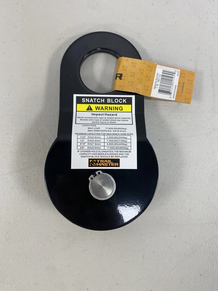 The Trail Master Snatch Block can increase the pulling power of your winch, and even double it with a double-line pull. It can also change the direction of the pull when you have an offset anchor, preventing damage to your steel cable or synthetic rope. With a 17,600 lb. load capacity, this snatch block can accommodate ropes up to 3/8" diameter and is a must for any off-roader. SN: O31