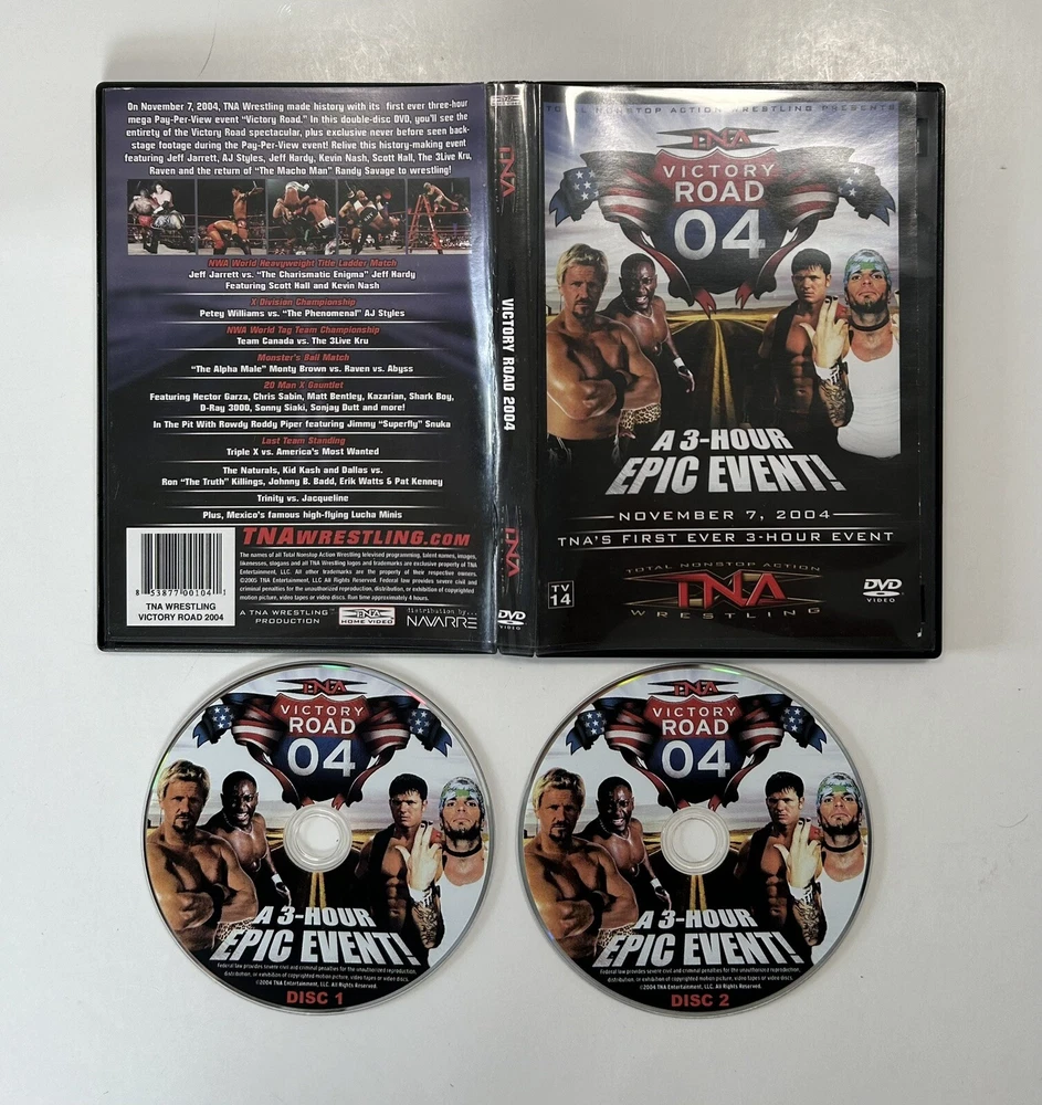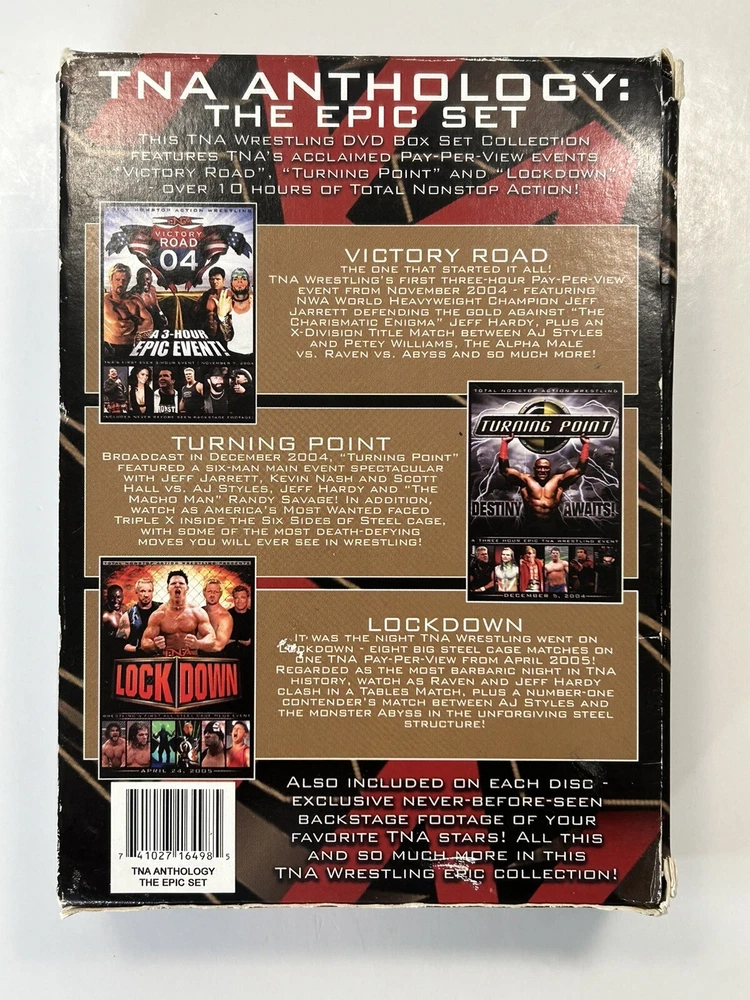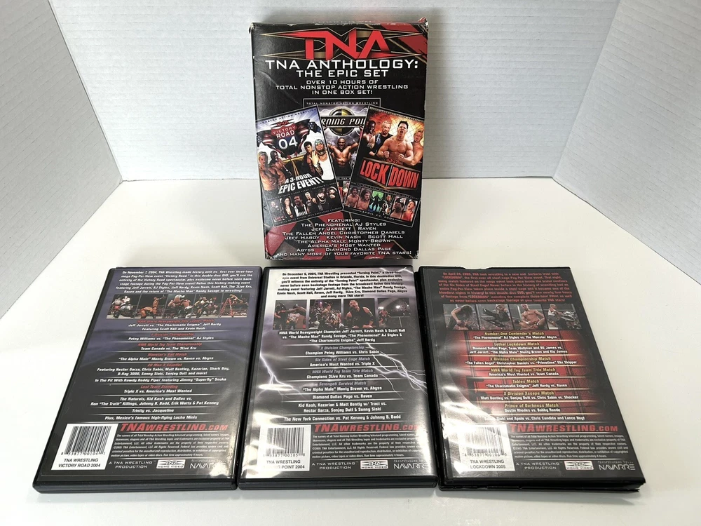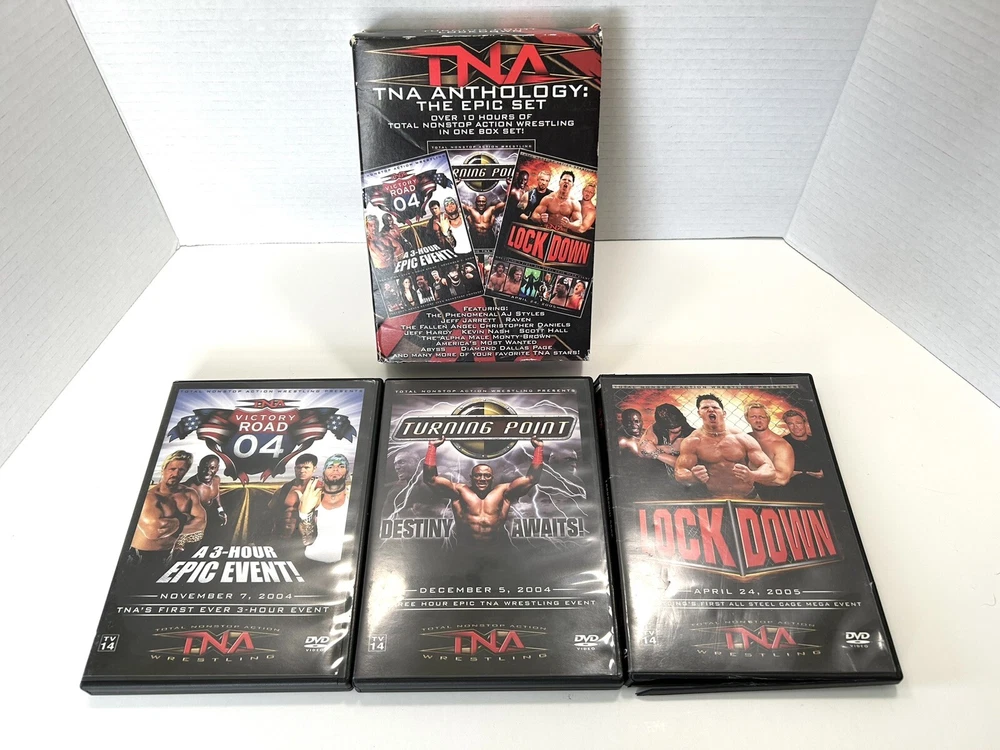 TNA Anthology The Epic Set - Victory Road 04, Turning Point, Lockdown 6 DVD Wrestling Box Set Great Gift Idea Starring Wrestlers Macho Man, Jeff Hardy, Kevin Nash, Raven, Abyss, AJ Styles, and more * Lockdown Case is Broken & All DVDs have Scratches but have been Tested & are Working!* Pre-Owned - Please see P ictures for D etails