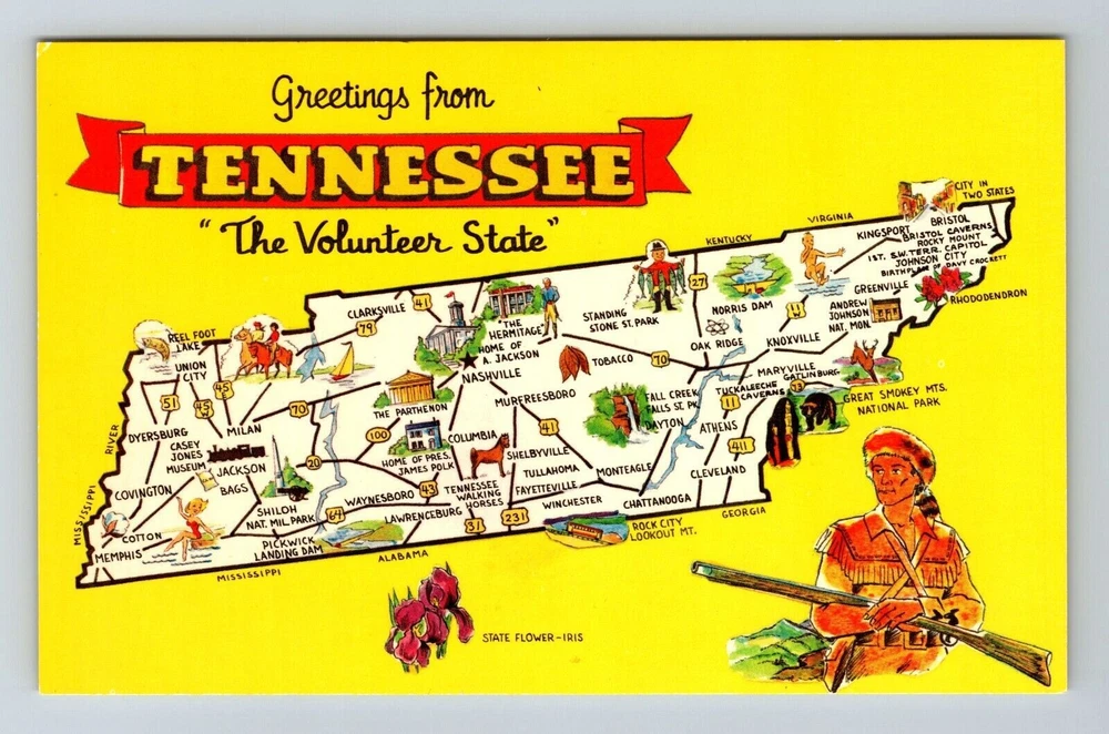 TN-Tennessee, Landmarks Map Greetings, Volunteer State, Vintage Postcard