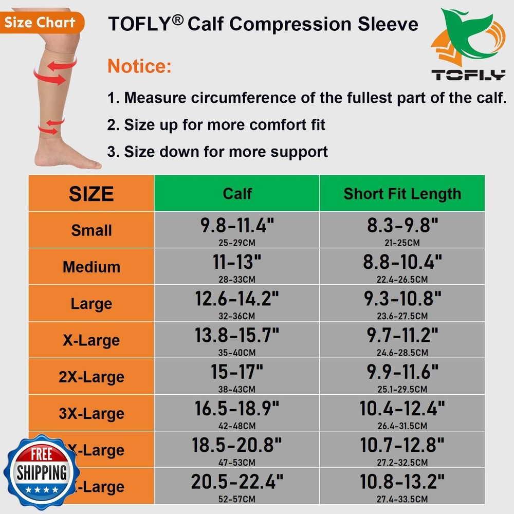 TOFLY® Calf Compression Sleeve for Men and Women, 1 Pair, Footless Compression Socks 20-30mmHg for Leg Support, Shin Splint, Pain Relief, Swelling, Varicose Veins, Maternity, Nursing, Short Beige 4XL Features GET PERFECT FIT ACCORDING TO SIZE CHART: Measure the thickest part of your calf then compare to the size chart of left images to get the perfect fit. They include size Small, Medium, Large, X-Large, 2X-Large, 3X-Large, 4X-Large, 5X-Large and painstakingly measured to ensure an exact fit. So whether or not you already have other calf sleeves, please try ours this time, as we provide "BUY 100% RISK FREE" Service, so why not to see whether these are better for you? IT JUST WORKS, TRY PLEASE! -DURABLE & COMFORTABLE: TOFLY compression calf sleeves are made of premium quality material, Nylon 77%, Spandex 23%, lightweight, breathable & durable, sweat-absorbent, anti-slip. True graduated compression of 20 - 30 mmHg (CLASS II), with seamless woven construction, these fit snug with no loss of compression after long time wear. IT JUST WORKS, TRY PLEASE! -RELIEF & RECOVER FAST: By improving blood flowing & circulation, TOFLY compression hose help to prevent the ankle & leg swelling, reduce muscle cramping while re-energizing tired legs. These footless compression hose also help reduce the risk of developing varicose veins, DVT, leg cramps, arthritis, shin splints, pulled muscle, tendonitis, lymphedema, ease muscle soreness as well as leg fatigue. IT JUST WORKS, TRY PLEASE! -GREAT FOR DAILY USE: These compression sleeves could be used during pregnancy, or whatever your sports might be, running, hiking, martial arts, volleyball, basketball, cycling, baseball, yoga, workouts or any fitness activities. Or for people in retail, air travel, jobs as a nurse or in construction that require long standing on your feet, even to cover up tattoos! BUY WITHOUT ANY RISK: Please feel free to contact us whether you have any problem here. And any question will be answered within 12 hours! We are so confident you will like our Calf Compression Sleeve since we know they do WORKS! Doctors, nurses, teachers, flight attendants, salesmen, policeman and the elder can benefit from our Compression Sleeve. Choose us, choose healthy and comfort! Shipping Free & Fast Shipping: We offer free shipping to most of the USA with a normal delivery time of 3-7 days. However, due to the current situation, additional delivery time (up to 3 weeks) may be required for some items. Alternative Carriers: We may use alternative carriers (e.g., USPS, FedEx, UPS) to ensure your package arrives safely and on time. Due to the use of multiple carriers, we are unable to provide a tracking number automatically. Handling Time: Orders are processed and shipped within 1-2 business days of receiving cleared payment. Shipping Restrictions: Shipping to Alaska, Hawaii, Puerto Rico, Guam, and other US territories may incur shipping charges or delivery restrictions. Please contact us before ordering, or your order can be refunded/cancelled. State Restrictions: Certain items may not be shipped to California due to state regulations. Contact for Tracking Updates: If you require tracking updates or have any concerns about the delivery of your order, please feel free to contact us, and we will be happy to assist you. Return Policy 30-Day Hassle-Free Returns: If you are not completely satisfied with your purchase, you can return the item for free within 30 days of receiving it for a full refund or exchange. Easy Return Process: Contact us, and we will provide you with a prepaid return shipping label and detailed instructions. No Restocking Fee: There are no restocking fees for returns. However, the buyer is responsible for return shipping costs if the return is not due to a seller"s error. Refund Processing: Refunds will be processed within 1 business day of receiving the returned item in its original condition. Feedback Your feedback is extremely important to us. We strive to provide the best products and customer service possible. If you are satisfied with your purchase, please take a moment to leave us a positive review. If you have any concerns or issues with your order, please contact us before leaving negative feedback. We are committed to resolving any problems and ensuring your satisfaction. Contact Us If you have any questions or concerns, please feel free to reach out to our customer support team. You can contact us through the eBay messaging system. We are available Monday to Friday, 9:00 am to 5:00 pm EST, and we will do our best to respond to your inquiry within 24 hours. Thank you for supporting our small family business!