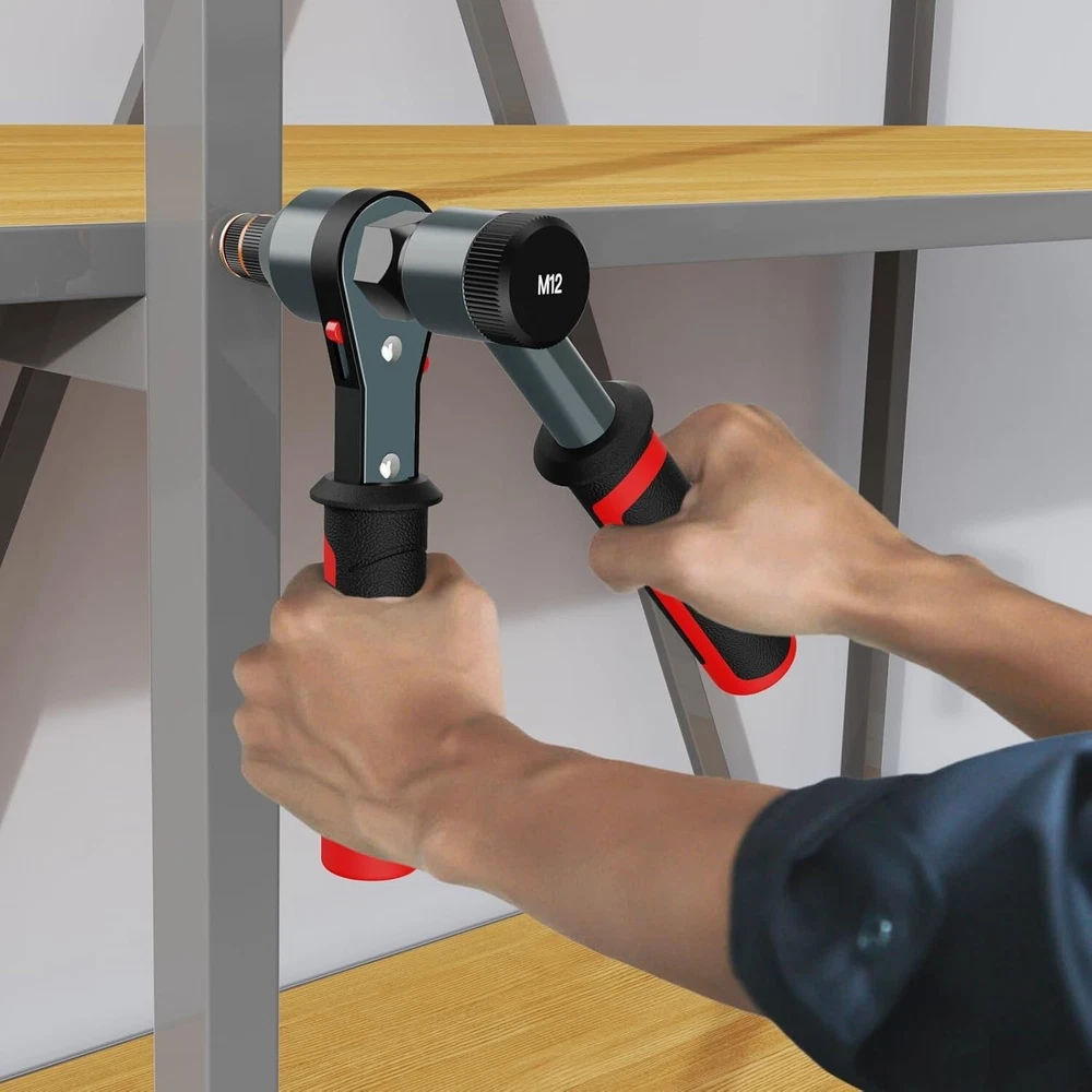 Rivet Nut Tool Rivet Nut Kit, Rivnut Tool Kit with 10 Metric and SAE Mandrels, 100 Pcs Rivet Nuts Assortment Kit, Professional Ratchet Nutsert Tool Kit with Rugged Carrying Case, TR21 Ratcheting Mechanism: The Ratchet Nut Tool features a ratcheting mechanism that allows for easy and efficient installation of rivet nuts. This mechanism ensures that the nut is securely fastened without excessive manual force Quick change mandrels: A convenient feature of the TOLRET Rivet Nut Tool is the quick-change mandrel system. This allows users to easily switch between different mandrel sizes without the need for additional tools, reducing downtime during jobs Ergonomic Design: The ergonomic design of the handle provides a comfortable grip and optimal control during operation. So that users can reduce fatigue and improve work efficiency when using it for long periods of time Durable Construction: Built to withstand the rigors of industrial use, the Ratchet Rivet Nut Gun features a rugged and durable construction. The combination of high quality materials and precision engineering ensures a long service life Consistent results: The ratcheting mechanism ensures that each rivet nut is installed with a consistent level of force, resulting in reliable and consistent results for nut tightness and safety