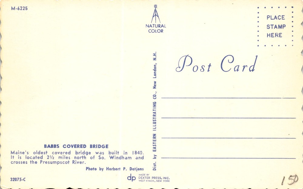 MAKE AN OFFER. THE MORE YOU BUY THE BETTER DEAL I WILL ACCEPT The postcard features a photo of Babbs Covered Bridge, which is noted as Maine's oldest covered bridge, constructed in 1840. It is situated 22 miles north of South Windham and spans the Presumpscot River. The photo was taken by Herbert P. Detjens and distributed by Eastern Illustrating Co.