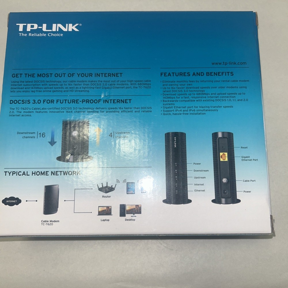 The TP-Link TC-7610 is a high-speed cable modem with a maximum downstream data rate of 300 Mbps. It has a black color and features wireless connectivity, making it suitable for use with routers. This modem is designed for home networking and connectivity, and is compatible with DOCSIS 3.0 standards. With its Ethernet ports and channel bonding feature, it offers fast and reliable internet access for multiple devices. Made by TP-LINK, a trusted brand in networking technology, this model is a reliable choice for those in need of a high-performance modem.