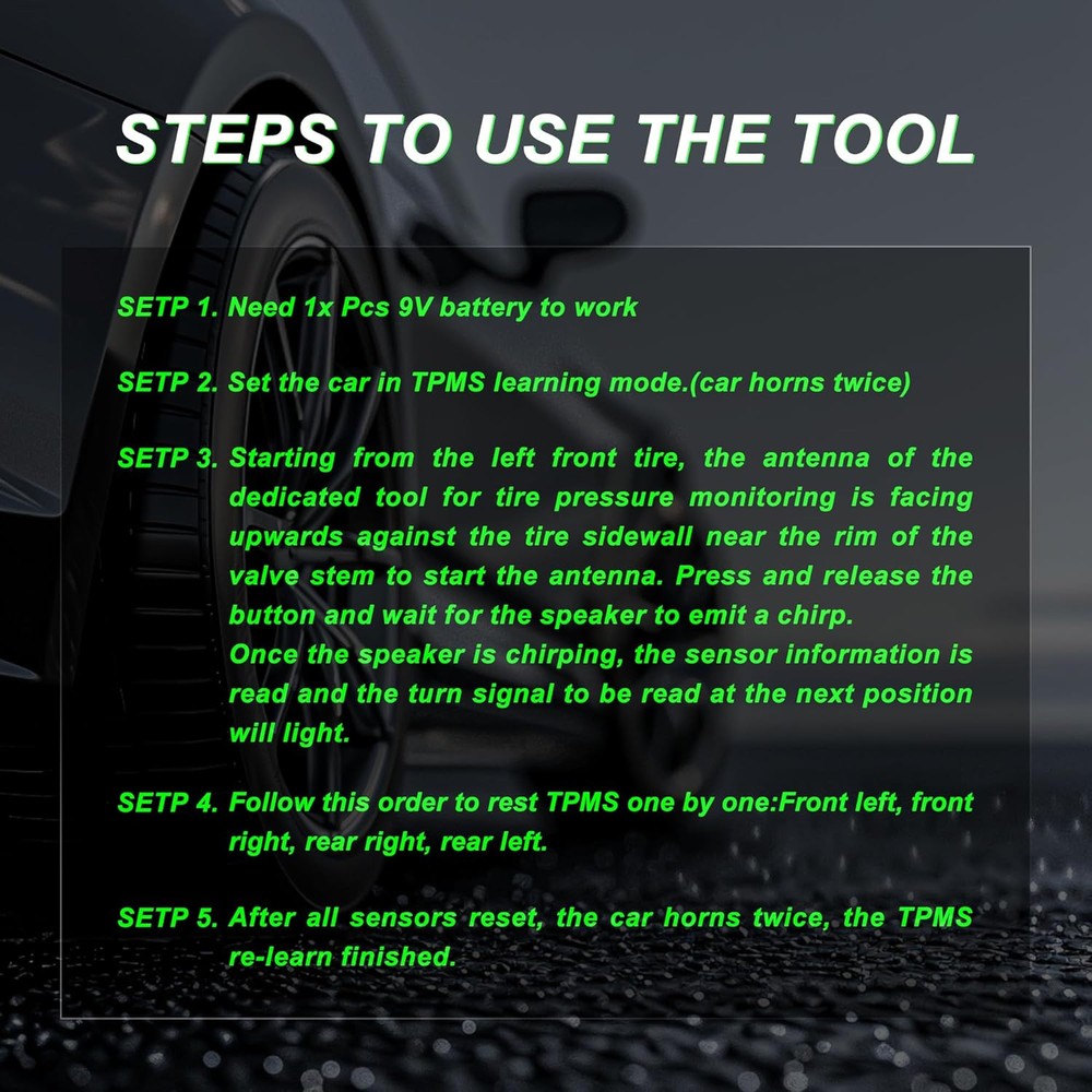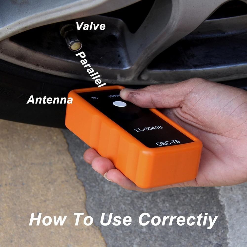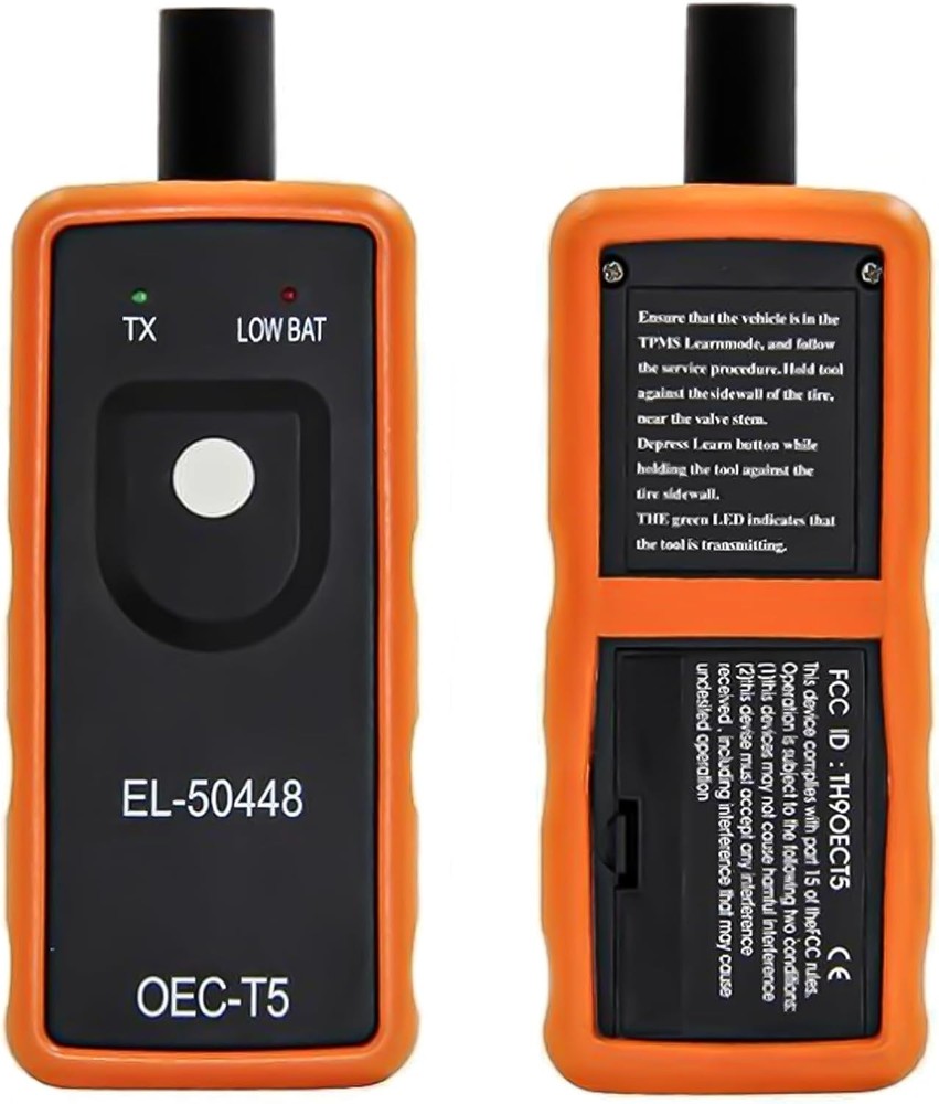 TPMS Relearn Tool - Automotive Tire Pressure Monitor System Activation and Reset for GM Vehicles - Car Accessory for Tire Sensor Programming Product Details Brand: Couslcd Item dimensions L x W x H: 2 x 0.8 x 0.5 inches Material: Acrylonitrile Butadiene Styrene Item Weight: 0.02 Kilograms Style: Tire Pressure Monitor Sensor Maximum Supply Voltage: 9 Volts Measurement Accuracy: ±8.3 kPa (1.2 psi) Mounting Type: Tire Mount Output Type: Push Button Specific Uses For Product: TPMS reset and activation for GM vehicles Upper Temperature Rating: 8E+1 Degrees Celsius Manufacturer: Couslcd Item Weight: 0.704 ounces Product Dimensions: 2 x 0.8 x 0.5 inches Item model number: Tire Pressure Monitor Sensor Manufacturer Part Number: Couslcd-TYFWQ Brand: Couslcd Item dimensions L x W x H: 2 x 0.8 x 0.5 inches Material: Acrylonitrile Butadiene Styrene Item Weight: 0.02 Kilograms Style: Tire Pressure Monitor Sensor 【Standard Specifications】: OEC-T5 specifications, EL-50448 measures approximately 6.1 x 2.4 x 1.4 inches and is comfortable to hold. It uses a 9V battery and has an operating temperature of -20~80°C. With it, individuals can easily complete the relearning of the vehicle pressure sensor, which can greatly save time and money on trips to the auto store. 【Activation Reset Function】: This is a must-have learning tool for replacing tire pressure sensors, removing tire pressure alarms or replacing tires. With a powerful activation reset function, quickly and easily reset your tire pressure sensor to keep your vehicle's tire pressure monitoring system operating optimally. For instructions on how to use this product check out Product Description. 【Vehicle Universal】: Our activation tool is universal for most cars on the market, such as sedan, SUV, pickup truck, etc., not for large trucks. EL-50448 fits Enclave, Encore, LaCrosse, Regal, Camaro, Corvette, Traverse, Malibu. Please carefully identify the proper fit for your vehicle. (Different vehicles may take different amounts of time to reset all tire sensors after rotation.) 【Easy to Use】: Make sure your vehicle is in learning mode and follow the maintenance procedures. Place the tool firmly against the tire sidewall, near the valve stem. While holding the tool against the tire sidewall, press the learn button. (Note: Make sure the battery is in good condition and the antenna is in the correct position when using) 【Reliable Material】: The shell is made of ABS plastic, solid and durable, effective against dust and splashing water drops. Wear-resistant, easy to use for a long time and protect the internal electronic components. Responsive and powerful performance, can activate the tire pressure sensor quickly and accurately within 1-2 minutes. Specifications:Material: ABSColor: Orange + BlackSize: 6.1 x 2.4 x 1.4 InchesPackage Include: 1 x Relearn Tool for Auto Tire Pressure Monitor SensorThe sensor re-read-in read-in procedure must be executed after each tire change, body control module replacement, or sensor replacement. Once the reread mode is enabled, the identification code for each sensor will be read into the body control module memory. When a sensor identification code is read, the body control module causes the horn to chirp to indicate that the sensor has sent an identification code and that it has been received and read by the body control module. The body control module must read the sensor identifiers in the correct order to determine the correct sensor location.▲The first code read is assigned to the left front position, the second to the right front position, the third to the right rear position and the fourth to the left rear position. The turn signal lights will illuminate separately to indicate the correct order of the read positions.①Use the EL-50448 or equivalent to diagnose sensor functionEach sensor has an internal low frequency coil. When tire pressure monitoring is used in enable mode, a low frequency transmission signal will be generated to activate the sensor. In read-in mode, the sensor responds to the low-frequency activation by transmitting the signal. In Tire Pressure Monitor Read-In Mode, when the Body Control Module receives a Read-In Mode transmission signal, it assigns the sensor identification code to the vehicle location corresponding to its read-in sequence.②Sensor Function - Using the Pressure Increase/Decrease MethodIn standstill mode, each sensor takes a pressure measurement sample every 30 seconds. If tire pressure increases or decreases by more than 8.3 kPa (1.2 psi) from the last measurement, a re-measurement will be taken immediately to confirm the pressure change value. Synopsis: This is a tire pressure reset instrument, or learning motion. After each tire shift, tire, body control module, and tire pressure sensor replacement, the sensor re-matching procedure must be performed to ensure the correctness of the tire pressure value acquisition display.Operation steps:1. Make sure the vehicle is in the TPMS learning state/mode.2. Follow the automotive maintenance procedures, holding the instrument in order (left front, right front, right rear, left rear), aligned with the valve core lever (the mouth of the gas) near the tire sidewall to press the reset button. 3. At this time the green LED light (TX light) will light up, that is, to send a signal, when you hear the car beeps after that is a successful match.4. Match other tires in-50448 instructions:EL50448 works on all General Motors products manufactured for the North American market. It won't work if you've purchased aftermarket sensors that are the wrong frequency. EL50448 fit for G.M most kind of vehicles, equipped with a 315 or 433 MHz Tire Pressure Monitoring (TPM) system. This re-learn procedure can be performed by using special tool to use EL 50448 TPMS Activation ToolStep 1- Enter leaning modeSet the gearshift lever to "P"Put the ignition switch to “ON”Enter the interface of tire pressure display by DICDIC shows "Press Se