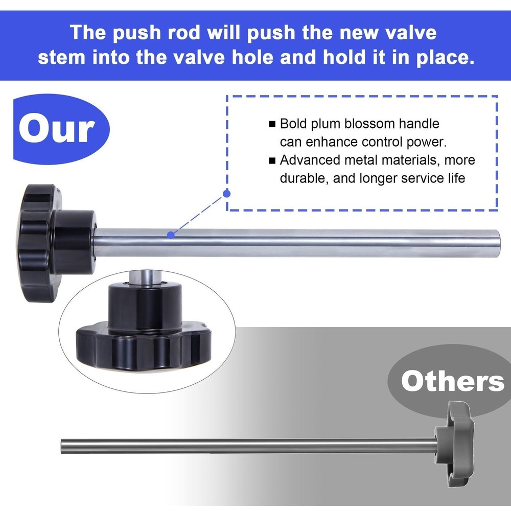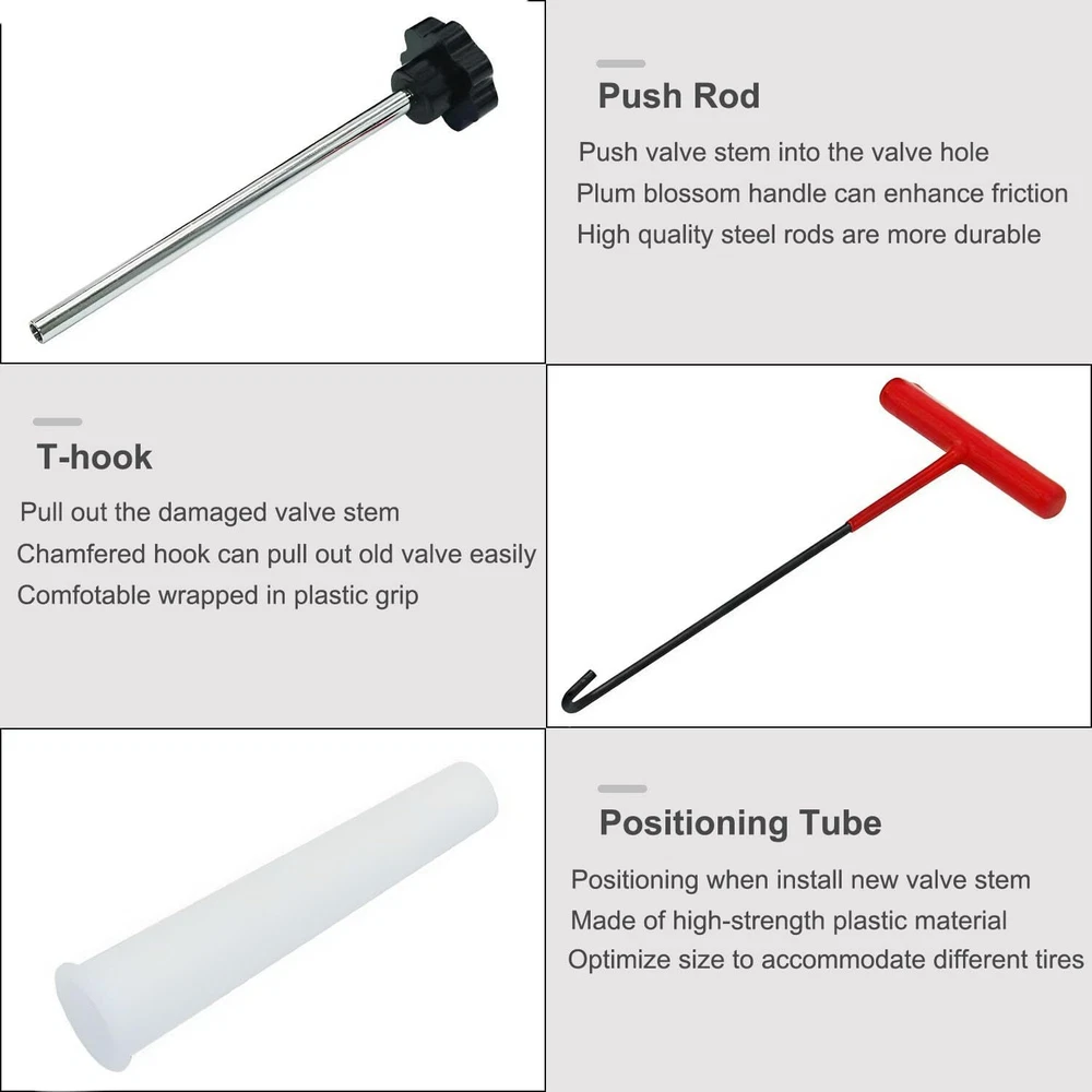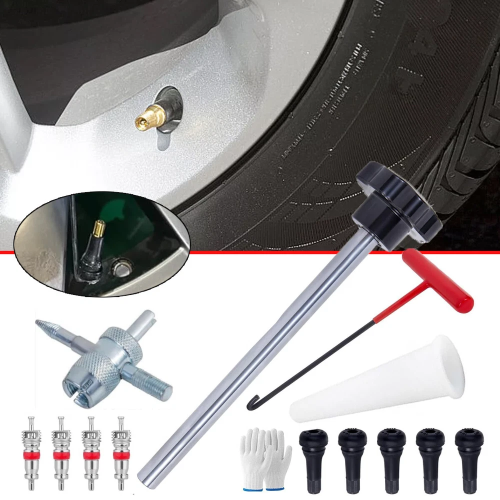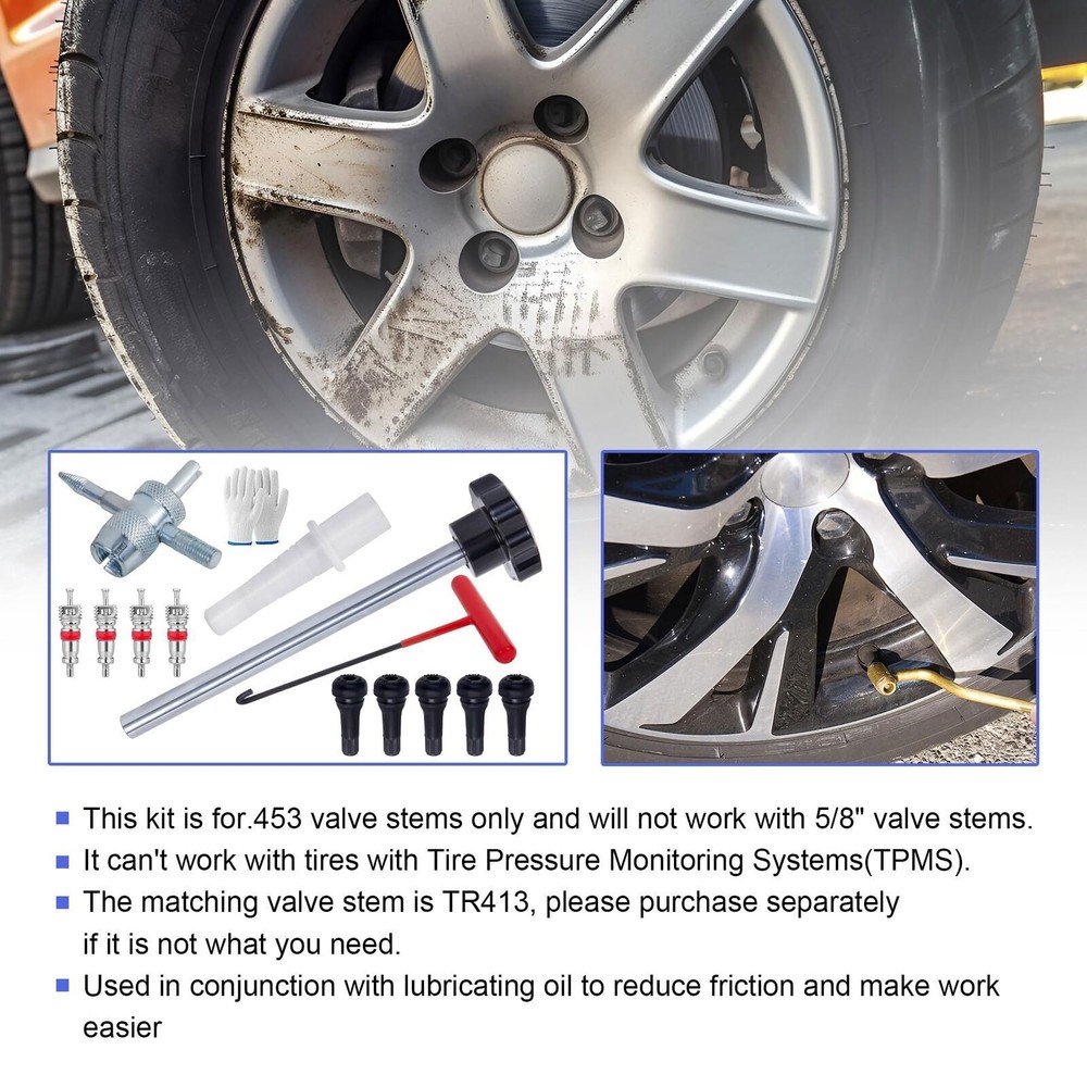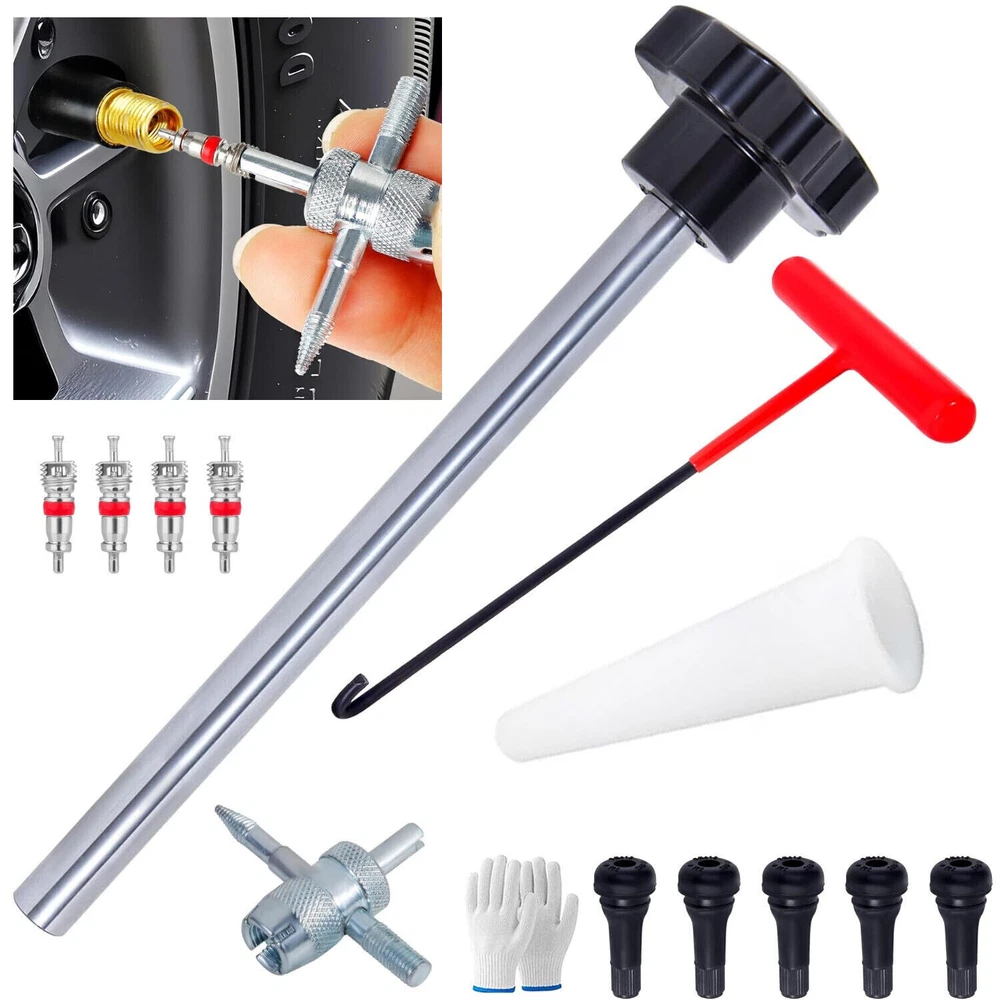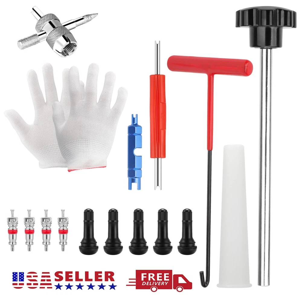Description: Handy tool:Quick valve change tool kit,Ideal for leaking valve stems,Change Valve Stem without removing the tire,Solid Steel construction with industrial grade nylon handles.Be proficient enough to replace a tire valve in 15 seconds Product Features:The T-shaped hook can quickly pull out the damaged valve core. The tapered positioning tube provides guidance and positioning when installing a new valve core. The metal push rod can accurately push the new valve core into the rim valve hole.Our engineers have improved and tested product structure and product materials many times, hoping to serve you Scope of application:Our tool is suitable for most models with 11.3mm (0.453inch) rim holes.not suitable for 5/8"(15.8mm) valve core. Also not suitable for tires with tire pressure mon Tire Valve Stem Core Replacement Tool Kit TR413 Valve Core Remover Installer US Description: Handy tool:Quick valve change tool kit,Ideal for leaking valve stems,Change Valve Stem without removing the tire,Solid Steel construction with industrial grade nylon handles.Be proficient enough to replace a tire valve in 15 seconds Product Features:The T-shaped hook can quickly pull out the damaged valve core. The tapered positioning tube provides guidance and positioning when installing a new valve core. The metal push rod can accurately push the new valve core into the rim valve hole.Our engineers have improved and tested product structure and product materials many times, hoping to serve you Scope of application:Our tool is suitable for most models with 11.3mm (0.453inch) rim holes.not suitable for 5/8"(15.8mm) valve core. Also not suitable for tires with tire pressure monitoring system (TPMS). Suitable for cars,small trailers, light trucks, lawn mowers, wheelbarrows,ATVs and motorcycles. Package: T-shaped hook, tapered positioning tube, metal push rod, 5 TR413 valve cores, a pair of gloves, instruction manual(There is a usage video on our website link),extra gift,4-Way Valve Tool+four valves cores Steps for usage: 1.Deflate the tire; 2. Insert the T-shaped hook into the gap between the wheel hub and the valve core, rotate the hook to pull out the valve core; 3. Install the new valve core to the push rod; 4. Taper positioning The tube is aligned with the valve hole, and the push rod installs the valve core through the tapered positioning tube; 5. Rotate the push rod to disengage the valve core. Payment Shipping Return Contact us About us Payment 1.Paypal, Credit Card, G Pay etc, many payment way is accepted. 2.Please be sure your shipping address is correct before make a payment. Shipping 1.We are shipping from multiple warehouses (Houston, Texas/ Corona, California) , please note before placing an order 2.We will ship out the item within 1-3 business days after comfirming the payment, appreciate your patience. 3.If the items are broken on the way( we will check the orders clearly before we sent them ),please contact us in 3 days you received it. We will send you a new one or refund your payment. Return 1.We stand behind every buyer.Items can be returned for exchange or refund within 30 days. 2.Please contact us when you have any confusion of our item, we will solve the trouble for you as soon as possible. Contact us 1.This is professional Seller.We will reply your message within 24 hours. 2.Please contact us whenever you have any question about the item. We will deal with it as soon as possible. 3. If you are unhappy with the item or our service,please Contact Us before leave feedback,just give me a chance,thank you! About us 1. Unless specified otherwise, all our products are IN STOCK and are shipped from Local warehouse - Not Overseas! 2. We provide a 30 day Satisfaction Guarantee or your money back (provided items are in the same new and resaleable condition.) 3. We have a PayPal Verified Business Account, please buy with Confidence! 4. Every item will be tesrted before send.We know our products well and if we don't have the answers we will do our best to find them for you! 5. Our friendly team look forward to serving you! Your satisfaction is our No.1 Priority We will do our best to satisfacy you.