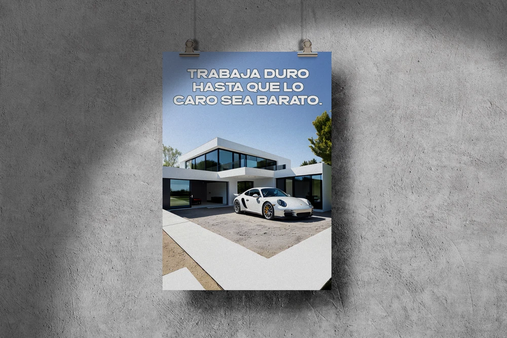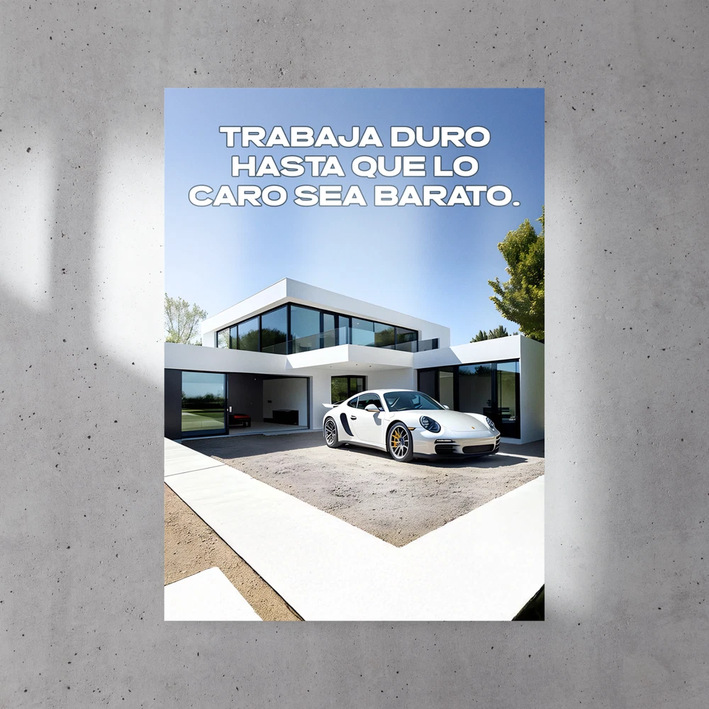 Elevate your space with the timeless appeal of a vintage/retro poster, "TRABAJA DURO HASTA QUE LO CARO SEA BARATO." This piece, showcasing the iconic Porsche 911, is a 24x36" glossy poster that makes a bold statement in any room. The high-quality paper material ensures vibrant color retention, making it a standout addition to your décor. The poster's large size and vertical orientation lend itself to a perfect fit for rooms ranging from your living room to your workshop. Without being personalized or signed, it maintains a classic, universal charm that art enthusiasts and sports car aficionados alike will appreciate. Whether it's for your home or office, this piece is sure to impress.