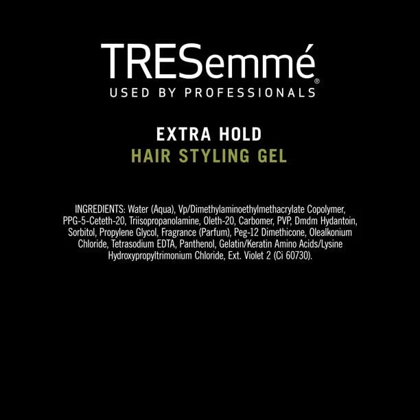 Product Description Tresemme Tres Two, Gel Extra Firm Control, Extra Hold, #4 Hair Styling Gel, 9 Ounce (Pack Of 8) TRESemme Extra Hold Frizz Control Hair Styling Gel, The best styling gel should hold your style without causing a sticky situation. TRESemme Extra Hold Hair Gel delivers all-day-long humidity resistance and keeps your style going strong without ever feeling stiff or sticky. After you put the work into your style, you better lock it in before you lose it. Built for control and ready to be styled, this Extra Hold Gel fights frizz all day long with 24-hour humidity protection, while continuously holding your style in place. This hair styling gel can be used on any hair type, as a curly hair gel or to lock in your wavy styles. Our unique, alcohol-free hair gel formula is great for all hair types and designed to add lasting shine to your style. Step 1: Prep your hair with your favorite TRESemme shampoo and conditioner. Step 2: Start by dispensing a quarter-sized drop of TRESemme Extra Hold Hair Gel into your hands and use fingers to evenly coat towel-dried hair, creating your preferred style. Add more hair styling products as needed. TRESemmé Extra Hold Frizz Control Hair Styling Gel, 9 oz MEGA HOLD HAIR GEL: TRESemmé Extra Hold Hair Gel adds long-lasting shine and firm hold without leaving hair looking sticky or wet ANTI-FRIZZ GEL: This alcohol-free hair styling gel delivers all-day control with humidity resistance to help keep frizz away LOCK IN YOUR STYLE: TRESemmé Extra Hold Hair Gel for women will keep you in control and your hair game strong TREND LED, RIGOROUSLY TESTED: Ingredients in this hair gel are carefully selected to ensure your hair receives the best possible care. We don't test on animals & are PETA Approved HAIR CARE TIPS FROM OUR STYLISTS: Dispense a quarter-size drop into your hands and use your fingers to evenly coat damp hair, creating your desired style. Add more gel as needed EXTRA HOLD HAIR GEL: This gel is a professional-quality clean-feel styling gel that doesn’t dry out your hair. It delivers all-day control with humidity resistance to help keep frizz away NO CRUNCH: Our alcohol-free hair gel adds long-lasting shine and firm hold without leaving hair looking sticky PROTECT HAIR WHILE USING HAIR DRYER, STYLING TOOLS & APPLIANCES: Apply hair gel before using your hair dryer, styling tools & appliances to protect hair from damaging heat while defining your hair style with an extra hold hair gel. VITAMIN B 5 FOR VOLUME AND SHINE: Hair will appear healthy, thicker, with more volume and shine thanks to the Vitamin B 5 in this Extra Hold hair gel. FRIZZ CONTROL IN HIGH HUMIDITY: Frizz control hair gel with extra hold lets you rock your hairstyle and curly hair with confidence without worrying about the humid weather. HOW TO APPLY: Dispense a quarter-sized drop of Extra Hold hair gel into hands. Use fingers to evenly coat towel-dried, clean hair, and work into your preferred style. Add more product if needed. Use your hair dryer or air-dry. MORE THAN HAIR PRODUCTS: TRESemmé is committed to advancing the next generation of female leaders by creating an intentional momentum forward. Find out more about how at #WomenLeadTheWay. Inactive Ingredients Water (Aqua) Vp/Dimethylaminoethy|methacrylateCopolymer PPG-5-Ceteth-20 Trisopropanolamine Oleth-20 Carbomer PVP Dmdm Hydantoin Sorbitol Propylene Glycol Fragrance (Parfum) Peg-12 Dimethicone Olealkonium Chloride Tetrasodium EDTA Panthenol Gelatin/Keratin Amino Acids/Lysine Hydroxypropyltrimonium Chloride Ext. Violet 2 (Ci 60730). Ingredients Water (Aqua), Vp/Dimethylaminoethy|methacrylateCopolymer, PPG-5-Ceteth-20, Trisopropanolamine, Oleth-20, Carbomer, PVP, Dmdm Hydantoin, Sorbitol, Propylene Glycol, Fragrance (Parfum), Peg-12 Dimethicone, Olealkonium Chloride, Tetrasodium EDTA, Panthenol, Gelatin/Keratin Amino Acids/Lysine Hydroxypropyltrimonium Chloride, Ext. Violet 2 (Ci 60730). Active Ingredients NA