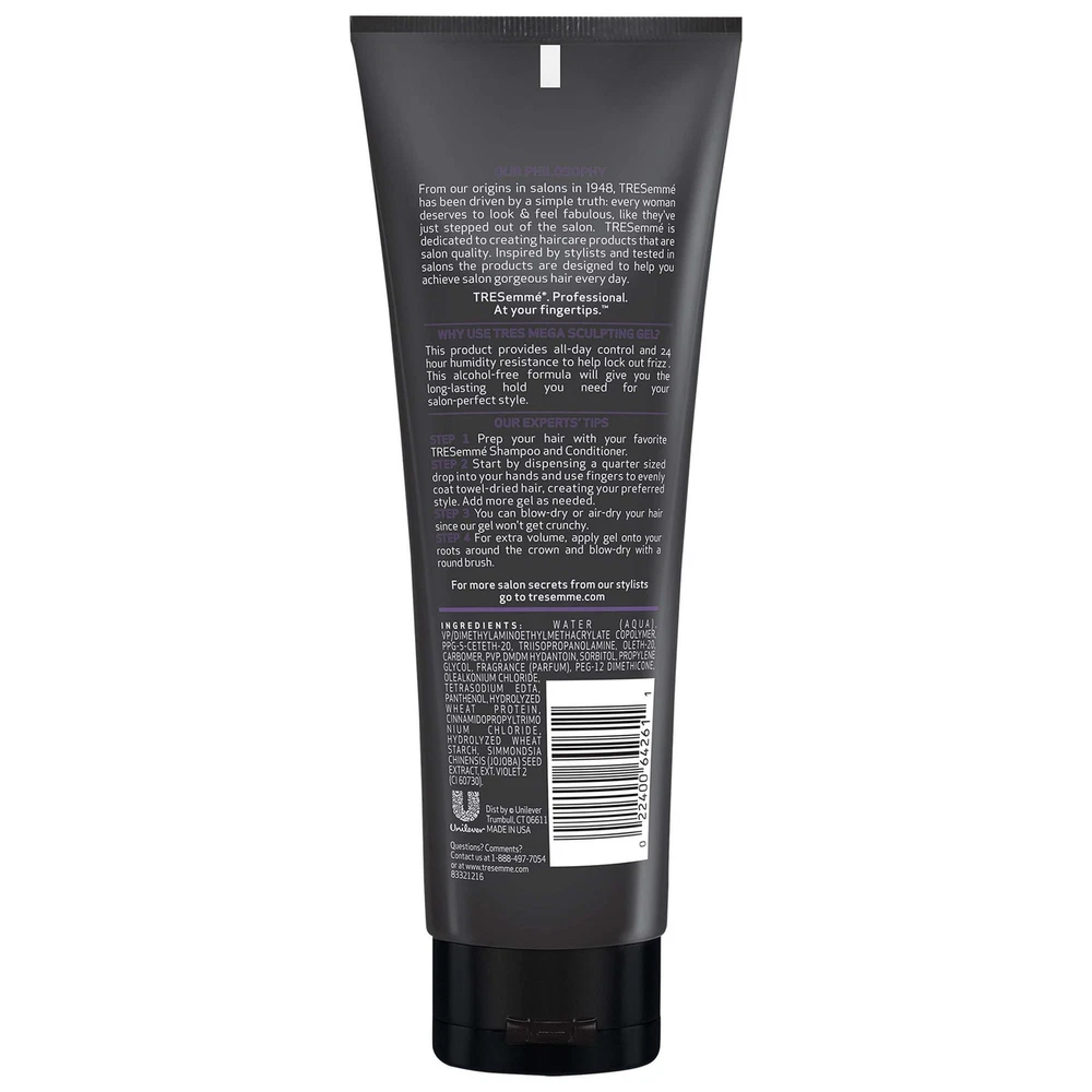 Product Description Tresemme Tres Two, Mega Control, Hair-Gel, for 24-Hour, Frizz Control #5, 9 Ounce (Pack Of 12) TRESemmé Mega Frizz Control Hair Styling Gel, Need a styling gel that delivers mega hold without feeling stiff or sticky? TRESemme Mega Control Hair Gel provides all-day resistance to humidity and keeps your style going strong without crunchy stiffness. After you put the work into your style, you better lock it in before you lose it. Sprays work best to lock in some styles, but when you're aiming for a sleek, tight look, you should use a styling hair gel for extra hold and humidity control. Built for control and ready to be styled, TRESemme Mega Control Hair Gel is an anti-frizz gel, giving you all-day hold with built-in 24-hour humidity protection. This mega control hair gel is perfect for slicking, shaping, or sculpting hair for that perfect look. Our unique, alcohol-free hair gel formula is great for all hair types and designed to keep your hairstyle on lock without leaving hair looking wet or feeling sticky. Step 1: Prep your hair with your favorite TRESemme shampoo and conditioner and hair styling products. TRESemmé Mega Frizz Control Hair Styling Gel, 9 oz MEGA FIRM STYLING HAIR GEL: TRESemmé Mega Control Hair Gel is a styling gel that adds long-lasting shine and mega hold to your hair for all-day control ANTI-FRIZZ GEL: This alcohol-free hair styling gel delivers all-day control with humidity resistance to help keep frizz away MAXIMUM HOLD: TRESemmé Mega Control Hair Gel is a stiff hair gel that locks in your style without ever looking sticky or wet TREND LED, RIGOROUSLY TESTED: Every ingredient is carefully selected to ensure your hair receives the best possible care. We do not test on animals and our hair products are PETA-approved HAIR CARE TIPS FROM OUR STYLISTS: Dispense a quarter-size drop into your hands and use your fingers to evenly coat damp hair, creating your desired style. Add more gel as needed FRIZZ FREE: Formulated with coconut oil, this formula gives all-day hold and 24-hour humidity resistance for resilient styles ALL-DAY HOLD: Level 5 hold, our strongest hold hair gel, is Infused with coconut oil. Achieve moisturized hair without compromising on hold CRUELTY-FREE: TRESemmé prohibits animal testing for our hair products and the ingredients used in them, anywhere in the world DO IT WITH STYLE: With professional quality hair products like our Mega Control Alcohol-Free Gel, you can confidently create your personal style Super firm control. Resistance To Lock Out Frizz And Lock In Style All Day Holds For 24 Hours In High Humidity Mega Firm Control For All Hair Types Product Benefits Humidity Resistant, Frizz Control Hair Type Curly Material Type Free Mineral Oil Free, Sulfate Free, Alcohol Free, Aluminum Free, Formaldehyde Free Scent Unscented Liquid Volume 9 Fluid Ounces Ingredients WATER (EAU), VP/DIMETHYLAMINOETHYLMETHACRYLATE COPOLYMER, PPG-5-CETETH-20, PHENOXYETHANOL, TRIISOPROPANOLAMINE, OLETH-20, CAPRYLYL GLYCOL, CARBOMER, PVP, SORBITOL, FRAGRANCE (PARFUM), PROPYLENE GLYCOL, PEG-12 DIMETHICONE, DISODIUM EDTA, PANTHENOL, COCOS NUCIFERA (COCONUT) OIL, BENZYL ALCOHOL, CITRONELLOL, GERANIOL, HEXYL CINNAMAL, LIMONENE, LINALOOL, EXT. VIOLET 2 (CI 60730).
