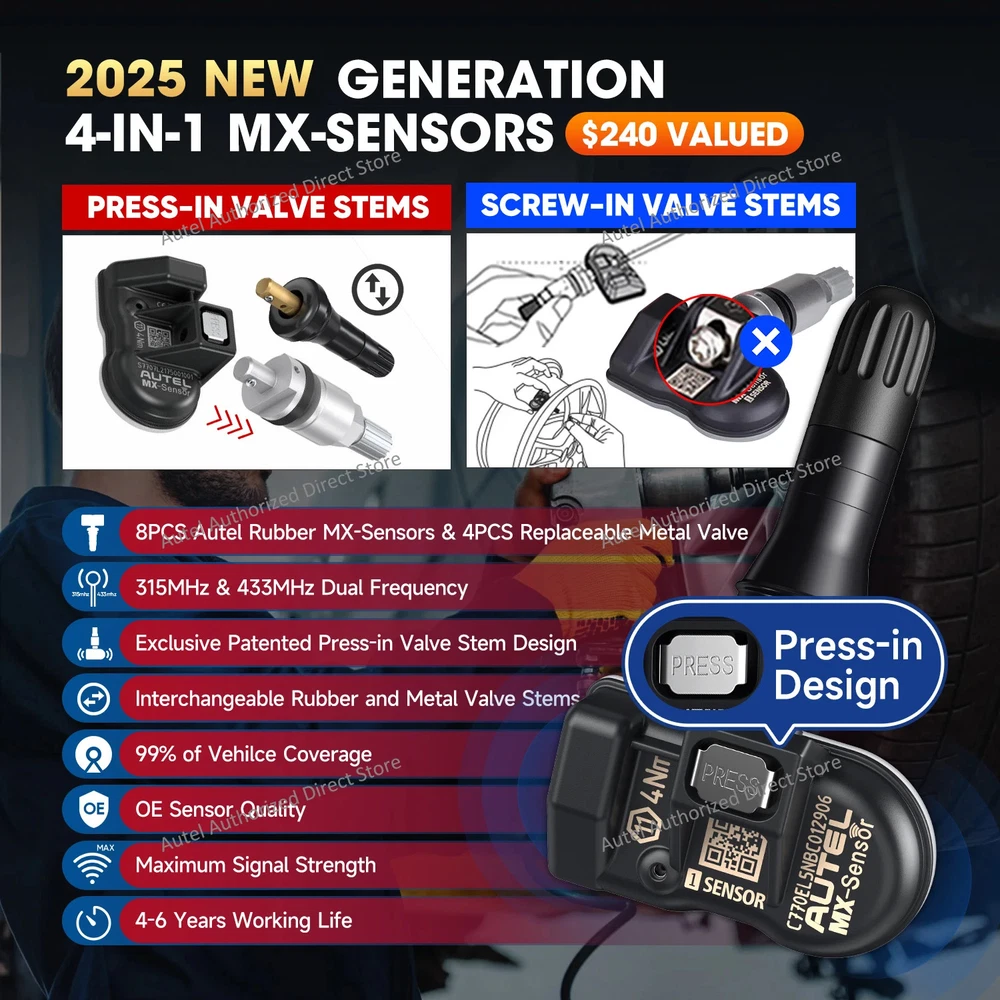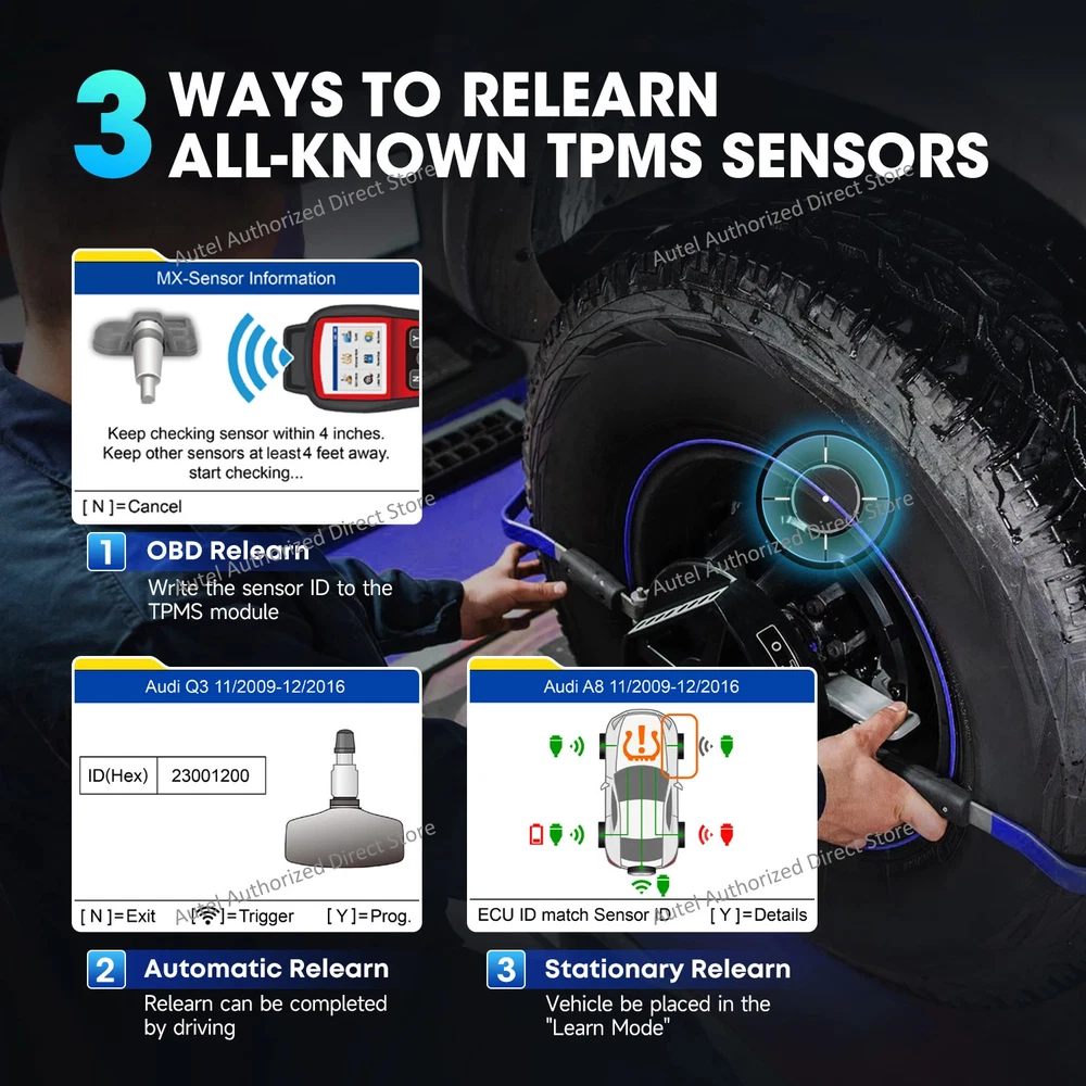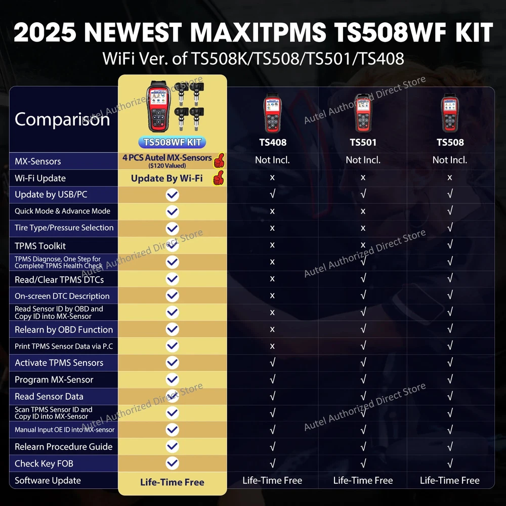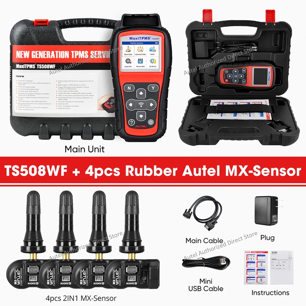 MaxiTPMS TS508WF KIT Via 4pcs Autel MX-Sensor, TPMS Programming Relearn Tool, WiFi Version of TS508, Relearn/Activate All TPMS Sensor, TPMS Reset, Lifetime Free Update Mulit-Languages Support & Lifetime Free Update: ■ TS508WF After-sales Service: 1 Year Warranty & Lifetime Free Software Update. ■ Support Multiple Languages: English, Traditional Chinese, French, German, Spanish, Dutch, Polish, Swedish, Korean, Japanese, Russian, Italian, Hungarian, Czech, Portuguese. (Please leave the S/N of machine to authorize the language you want after you receive it.) Highlights of TS508WF Kit, Upgrated Version of TS401/TS501/TS508: TS508WF has Quick Mode & Advance Mode, while Autel TS601, TS501, TS408S, TS408 is not supported. TS508WF can read TPMS live data, while TS501 Pro, TS501, TS408S, TS408 is not supported. TS508WF supports Tire Type/Pressure selection, while TS501, TS408S, TS408 is notsupported. TS508WF supports check fob & TPMS Toolkit, while TS408S is supported. TS508WF is the ONLY one can be updated via WIFI, all the above mentioned models have to be updated via USB or SD Card via PC. Autel MaxiTPMS TS508WF KIT Main Features: The ONLY Model with Quick Mode & Advanced Mode. Exclusive TPMS Status Screen: Read ECU sensor ID, Check sensor ID and ECU ID matching condition, Read DTCs from ECU and erase DTCs, View DTCs detail description. Program Autel MX-Sensors: Program by OBD & Auto Create 1-16 Sensor ID. Relearn TPMS Sensors: OBD Relearn, Automatic Relearn, and Stationary Relearn, 1000+ Relearn procedures. Activate All-known TPMS Sensors. TPMS System Diagnostics, Reset TPMS Light. Enhanced TPMS Functions for Japanese Vehicles. Read/Write Tire Type/ Pressure, TPMS Toolkit Functions. Fob Signal Test, Activate ECU for Toyota Vehicles. Free Lifetime Software Updates, unlimited update times for new vehicles and new TPMS features. 4pcs OEM Quality 2in1 Autel MX-Sensors. Quick Mode & Advanced Mode: A correct choice of working mode makes your TPMS work easy and efficient. Autel TS508WF TPMS Reset Tool is Autel's ONLY TPMS scanner that comes with 2 TPMS modes. Quick Mode provides direct TPMS functions to check TPMS sensors, program MX-Sensors quickly. Advanced Mode offers complete TPMS functions to perform sensor check, TPMS diagnose(read/ erase TPMS codes, TPMS light reset), MX-Sensor program, sensor relearn and information. 4PCS OEM Quality MX-Sensors: 1. 99% Vehicle Coverage, 315+ 433 Dual Frequency, 1-SKU Inventory. 2. Patented Press-release Valve Design, Interchange Rubber/ Metal valves Easily. 3. 100% Clone-able, Extraordinary Sensor Signal Strength. 4. Superior Battery Life and Reliability. 5. Meets Industry Standard J1205/J1206. MaxiTPMS TS508WF 2 Modes to Program Autel MX-Sensors: Autel MaxiTPMS TS508WF Wifi TPMS Programming Tool can program all Autel MX-sensors, both 315MHz and 433MHz to replace the broken sensors. TS508WF comes with 2 modes to program Autel MX-sensors: ● Copy By OBD: You should connect OBD cable to retrieve the sensor ID from the ECU. ● Auto Create 1-16: The sensors makes it possible to program up to 16 sensors simultaneously. Note: Autel TS508WF can program Autel MX-sensors only, does NOT program OEM sensors. Relearn All Known TPMS Sensors: TPMS reset tool Autel TS508WF can read, activate, and relearn all known TPMS sensors on the market. Autel TS508WF TPMS Kit provides 3 ways to relearn sensors. Stationary Relearn (vehicle in the “Learn Mode”), Automatic Relearn (relearn by driving), OBD Relearn (write TPMS sensor IDs to TPMS module via OBD connector), while OBD Relearn is not supported by TS408 or TS401. TPMS Relearn vary from car to car, kindly check compatibility with us before order. Active All TPMS Sensors, Turn Off TPMS Lights: Autel TS508WF Kit is able to activate all known OE/ universal TPMS sensors and view sensor information such as sensor ID, tire pressure, tire temperature, battery condition, sensor position and etc to help DIYers/ home mechanics find TPMS problems quickly, such as the low tire pressure, a weak battery, or a broken TPMS sensor. By fixing the broke TPMS sensors, you can turn off the TPMS warning light easily. Full TPMS Diagnostics & Services: Autel TS508WF TTPMS diagnostic tool can wirelessly activate 99% of TPMS sensors on the market, and enable you to quickly and accurately retrieve TPMS sensor data like Sensor ID, Tire Pressure, Tire Temperature, Sensor Battery, Sensor Position, Frequency, etc. Besides, TPMS TS508WF can read, clear TPMS DTCs, and reset TPMS warning lights, helping you solve 99.9% of TPMS issues. Turn OFF MIL: Autel TS508WF has TPMS diagnose function. It is used to find out TPMS related problems. You can check sensor-related problems, deflation in the tires and the rotation of wheels. TS508WF can read or clear TPMS DTCs,on-screen DTC description to perform DTC Lookup. It can help you find out problems with TPMS system faster. Print Data Function: Autel TS508WF TPMS diagnose Tool has Print Data function allows printing of TPMS DTC recorded data.Connect the tool and the computer with the supplied USB cable.Saved and viewTPMS DTCs, tire type and pressure information and print it out via PC for further analysis. This function can help users analyze and save data more conveniently. Key Fob Testing: When your remote key starts to fail or stop working, you can directly use the TS508WF in the tool library to test the signal strength of the remote key through WIIF or USB link, which is simple to use but quickly obtains results. Save your time by not having to go to the auto repair shop. Wi-Fi Update: The TS508WF provides two methods for updating: Update by Wi-Fi and Update by USB. The two methods bring customers faster and more convenient updating experience, disencumbering the worries that update must be done with computer. From now on, you only need to be in a Wi-Fi environment. TS508WF KIT Package List: 1pc x TS508WF 1pc x User manual 1pc x OBD II cable 1pc x USB cable 1pc x Carry case 1pc x AC Adapter 4pcs x Autel MX-