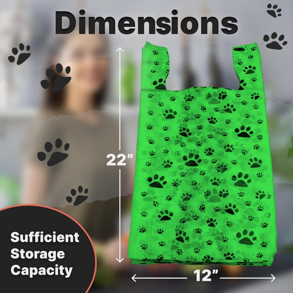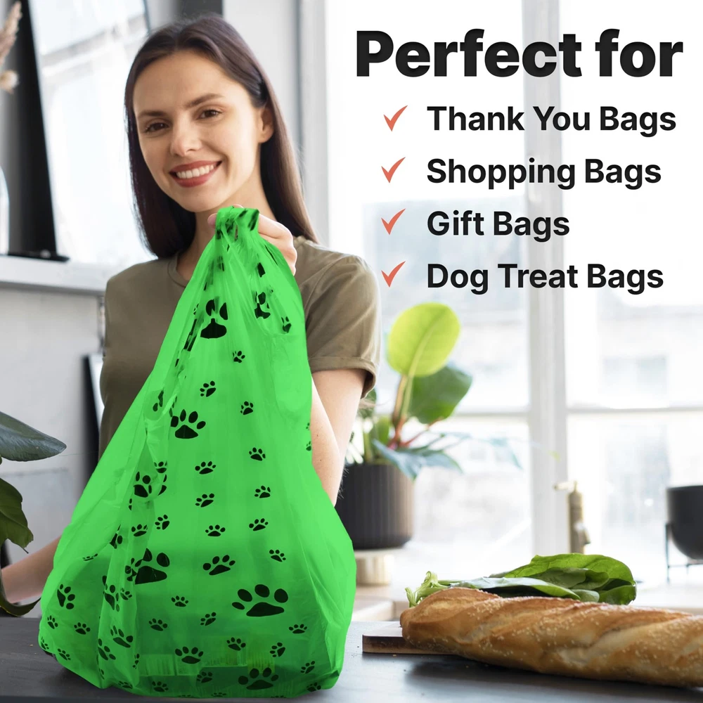 T Shirt Bags - Paw Print Bags - 100 Pack - Thank You Bags - Shopping Bags Cat or Dog Paw Print Design Plastic T-Shirt Bag 22" L x 12" W x 7" CUTE DESIGN - Your customers will feel so special with these Paw Print bags. The plastic T Shirt Bags are printed with plenty of cute dog footprints in black on Green Background these lovely paw prints will attract people more attention, with handy handle, it is easy for you to carry VARIOUS USES - Our paw print design bags have a wide range of usage, and can be used as: Thank you bags, Shopping Bags, Gift Bags, Dog Treat Bags etc; are suitable for retail stores, supermarkets, grocery and so on STONG AND DURABLE - Our T-Shirt Bag is made of plastic, which is hard-wearing and tough, lightweight and foldable! RELIABLE & CONVENIENT - Quantity the package comes with 100 pieces of large paw print bags. Handles are designed for easy carrying CAPACIOUS THANK YOU BAG - Enough capacity for storing, approx 22"L x 12"W and .6 mil thick with a gusset opening of approx 7" CUSTOMER SERVICE - If you have any questions, please contact us, we will provide you with professional services and reply to you within 24 hours CUTE DESIGN - Your customers will feel so special with these Paw Print bags. The plastic T Shirt Bags are printed with plenty of cute dog footprints in black on Green Background these lovely paw prints will attract people more attention, with handy handle, it is easy for you to carry VARIOUS USES - Our paw print design bags have a wide range of usage, and can be used as: Thank you bags, Shopping Bags, Gift Bags, Dog Treat Bags etc; are suitable for retail stores, supermarkets, grocery and so on STONG AND DURABLE - Our T-Shirt Bag is made of plastic, which is hard-wearing and tough, lightweight and foldable! RELIABLE & CONVENIENT - Quantity the package comes with 100 pieces of large paw print bags. Handles are designed for easy carrying CAPACIOUS THANK YOU BAG - Enough capacity for storing, approx 22"L x 12"W and .6 mil thick with a gusset opening of approx 7" CUSTOMER SERVICE - If you have any questions, please contact us, we will provide you with professional services and reply to you within 24 hours