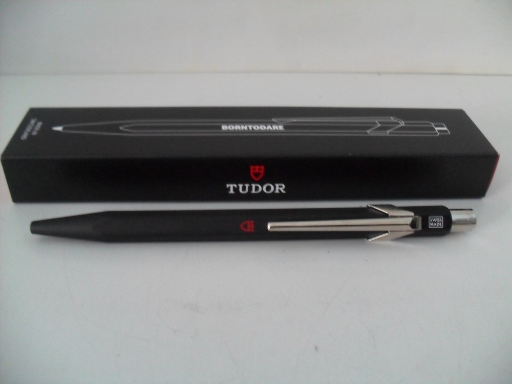 This is a RARE - TUDOR Watch Pen - Beautiful Matte Black CARAN d'ACHE Model 849. BRAND NEW - NEVER USED - EXCELLENT CONDITION! Sleek Matte Black Finish with Bright Chrome Trim. Features the Iconic TUDOR "red shield" Logo and Block Letter "BORNTODARE" TUDOR Motto Logo on the Barrel. The "849 - CARAN d'ACHE" Logo is Featured Under the Chrome Pocket Clip. Made in Switzerland - "SWISS MADE" Logo is Featured on the End of the Barrel Above the Chrome Pocket Clip. Includes TUDOR "BORNTODARE" Logo Gift Box. The ink color is blue. Non-Smoking home. Listing and template services provided by inkFrog