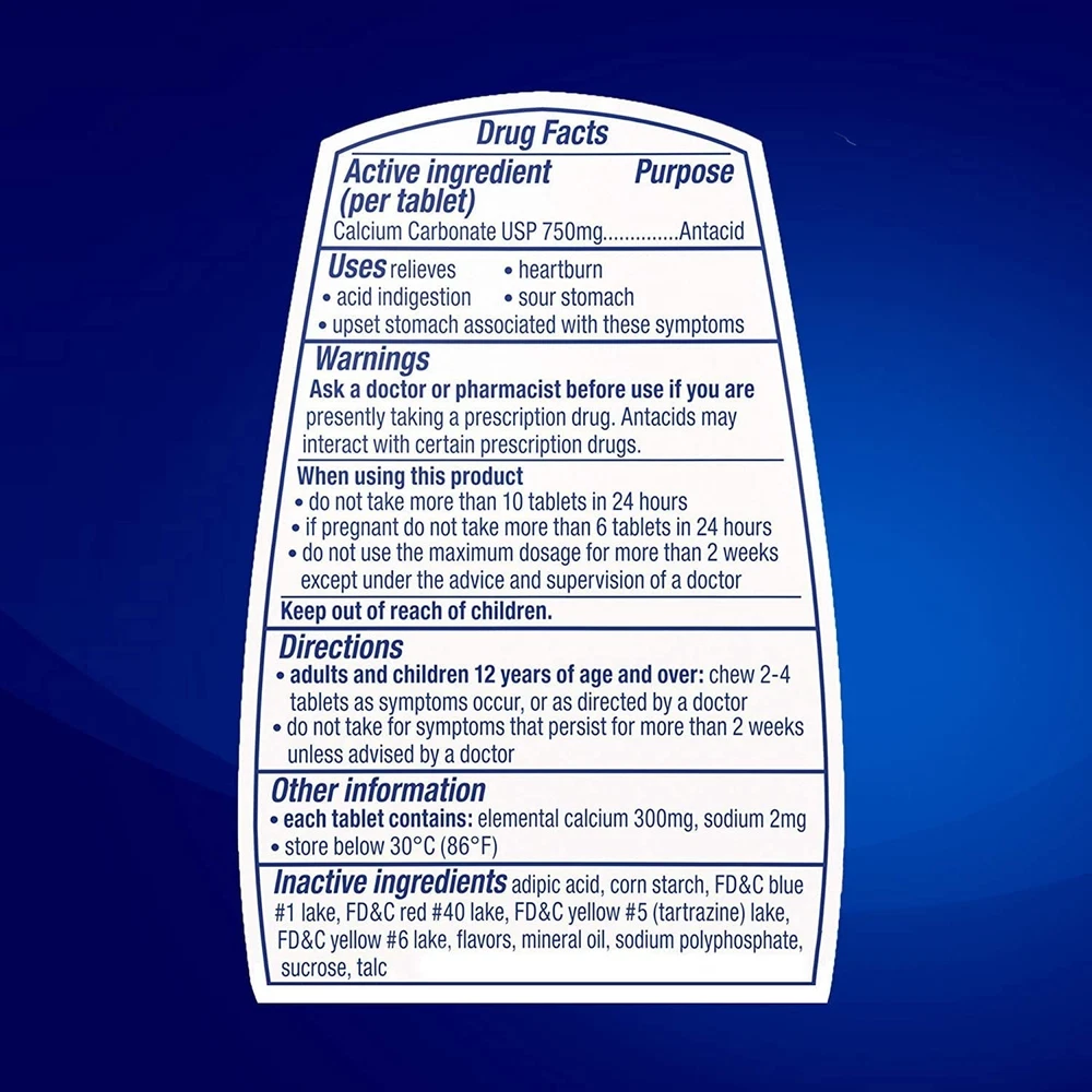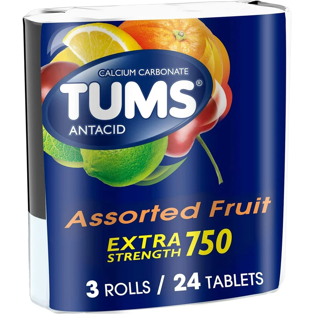 Product Description TUMS Extra Strength Assorted Berries Antacid Chewable Tablets for Heartburn Relief, 8 count (Pack Of 12) TUMS Chewable Antacid Tablets go to work in seconds, so you can forget your heartburn and get back to the moments that matter. TUMS extra strength antacid chewable tablets contain 50 percent more acid neutralizing power than regular strength TUMS, for fast acting relief. Each TUMS chewable antacid contains 750 mg calcium carbonate to quickly and effectively provide heartburn relief, sour stomach relief, acid indigestion relief and relief of upset stomach associated with these symptoms. TUMS heartburn medicine neutralizes acid on contact, giving you fast relief. Adults and children 12 years and older may chew two to four heartburn tablets, which come with pleasant assorted berry flavors, as symptoms occur or as directed by a doctor. Known as a trusted brand to fight heartburn fast for 90 years, TUMS is America’s #1 antacid and the #1 physician, pharmacist and OBGYN-recommended adult antacid brand. With TUMS assorted berries calcium carbonate tablets, you're ready when heartburn strikes. CONTENTS: 1 roll containing 8 TUMS Chewable Antacid Tablets for Extra Strength Heartburn Relief in easy to take, delicious assorted berry flavors MULTI-SYMPTOM RELIEF: Treats the four signs of heartburn: burning in the chest, acid indigestion, sour stomach and upset stomach FAST AND POWERFUL STRENGTH: Nothing works faster! These TUMS antacid tablets go to work instantly by starting to neutralize acid on contact GLUTEN FREE AND KOSHER: This heartburn and acid indigestion remedy has the active ingredient 750 mg calcium carbonate #1 DOCTOR RECOMMENDED: TUMS is the #1 recommended adult antacid brand by doctors, pharmacists and OBGYNs TRUSTED BRAND: America's #1 antacid, providing trusted heartburn relief for 90 years, supported by a satisfaction guarantee TUMS Extra Strength Assorted Berries chewable antacids offer fast acting, ultra strength heartburn relief so you can enjoy all of your favorite foods TUMS antacid tablets relieve heartburn, sour stomach, acid indigestion, and upset stomach associated with these symptoms Delivers double the acid neutralizing power per tablet of regular strength TUMS antacids Comes in a delicious assorted berries flavor and goes to work in seconds TUMS heartburn medicine is America’s number 1 antacid 8 Tablets Each Roll HSA AND FSA ELIGIBLE: HSA and FSA eligible product HSA and FSA eligible item Inactive Ingredients Adipic acid corn starch FD&C blue #1 lake FD&C red #40 lake flavors mineral oil sodium polyphosphate Ingredients Active Ingredients: Per tablet Calcium Carbonate USP 750mg - Antacid.; Inactive Ingredients: Adipic acid, corn starch, FD&C blue #1 lake, FD&C red #40 lake, flavors, mineral oil, sodium polyphosphate. Active Ingredients Calcium carbonate 750 mg Active Ingredient Name Calcium Carbonate