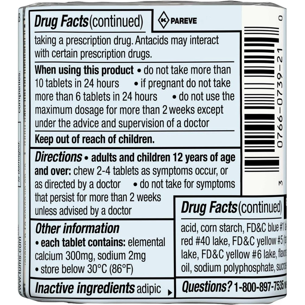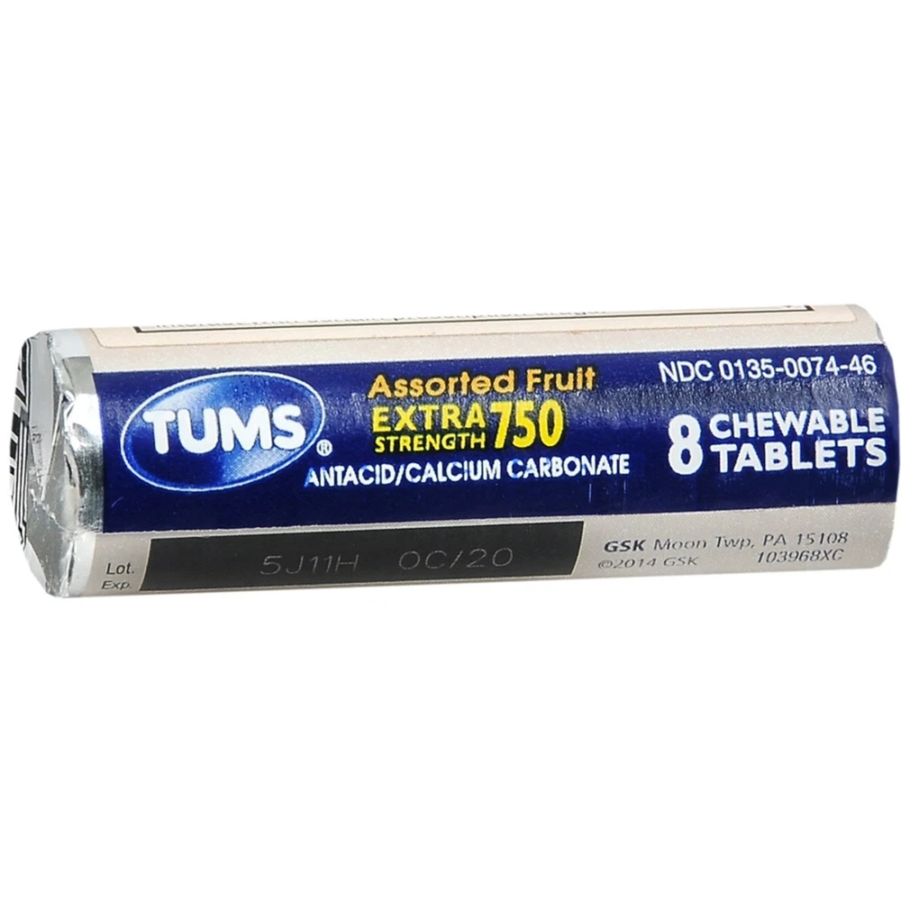 Product Description TUMS Extra Strength Assorted Berries Antacid Chewable Tablets for Heartburn Relief, 8 count (Pack Of 3) TUMS Chewable Antacid Tablets go to work in seconds, so you can forget your heartburn and get back to the moments that matter. TUMS extra strength antacid chewable tablets contain 50 percent more acid neutralizing power than regular strength TUMS, for fast acting relief. Each TUMS chewable antacid contains 750 mg calcium carbonate to quickly and effectively provide heartburn relief, sour stomach relief, acid indigestion relief and relief of upset stomach associated with these symptoms. TUMS heartburn medicine neutralizes acid on contact, giving you fast relief. Adults and children 12 years and older may chew two to four heartburn tablets, which come with pleasant assorted berry flavors, as symptoms occur or as directed by a doctor. Known as a trusted brand to fight heartburn fast for 90 years, TUMS is America’s #1 antacid and the #1 physician, pharmacist and OBGYN-recommended adult antacid brand. With TUMS assorted berries calcium carbonate tablets, you're ready when heartburn strikes. CONTENTS: 1 roll containing 8 TUMS Chewable Antacid Tablets for Extra Strength Heartburn Relief in easy to take, delicious assorted berry flavors MULTI-SYMPTOM RELIEF: Treats the four signs of heartburn: burning in the chest, acid indigestion, sour stomach and upset stomach FAST AND POWERFUL STRENGTH: Nothing works faster! These TUMS antacid tablets go to work instantly by starting to neutralize acid on contact GLUTEN FREE AND KOSHER: This heartburn and acid indigestion remedy has the active ingredient 750 mg calcium carbonate #1 DOCTOR RECOMMENDED: TUMS is the #1 recommended adult antacid brand by doctors, pharmacists and OBGYNs TRUSTED BRAND: America's #1 antacid, providing trusted heartburn relief for 90 years, supported by a satisfaction guarantee TUMS Extra Strength Assorted Berries chewable antacids offer fast acting, ultra strength heartburn relief so you can enjoy all of your favorite foods TUMS antacid tablets relieve heartburn, sour stomach, acid indigestion, and upset stomach associated with these symptoms Delivers double the acid neutralizing power per tablet of regular strength TUMS antacids Comes in a delicious assorted berries flavor and goes to work in seconds TUMS heartburn medicine is America’s number 1 antacid 8 Tablets Each Roll HSA AND FSA ELIGIBLE: HSA and FSA eligible product HSA and FSA eligible item Inactive Ingredients Adipic acid corn starch FD&C blue #1 lake FD&C red #40 lake flavors mineral oil sodium polyphosphate Ingredients Active Ingredients: Per tablet Calcium Carbonate USP 750mg - Antacid.; Inactive Ingredients: Adipic acid, corn starch, FD&C blue #1 lake, FD&C red #40 lake, flavors, mineral oil, sodium polyphosphate. Active Ingredients Calcium carbonate 750 mg Active Ingredient Name Calcium Carbonate