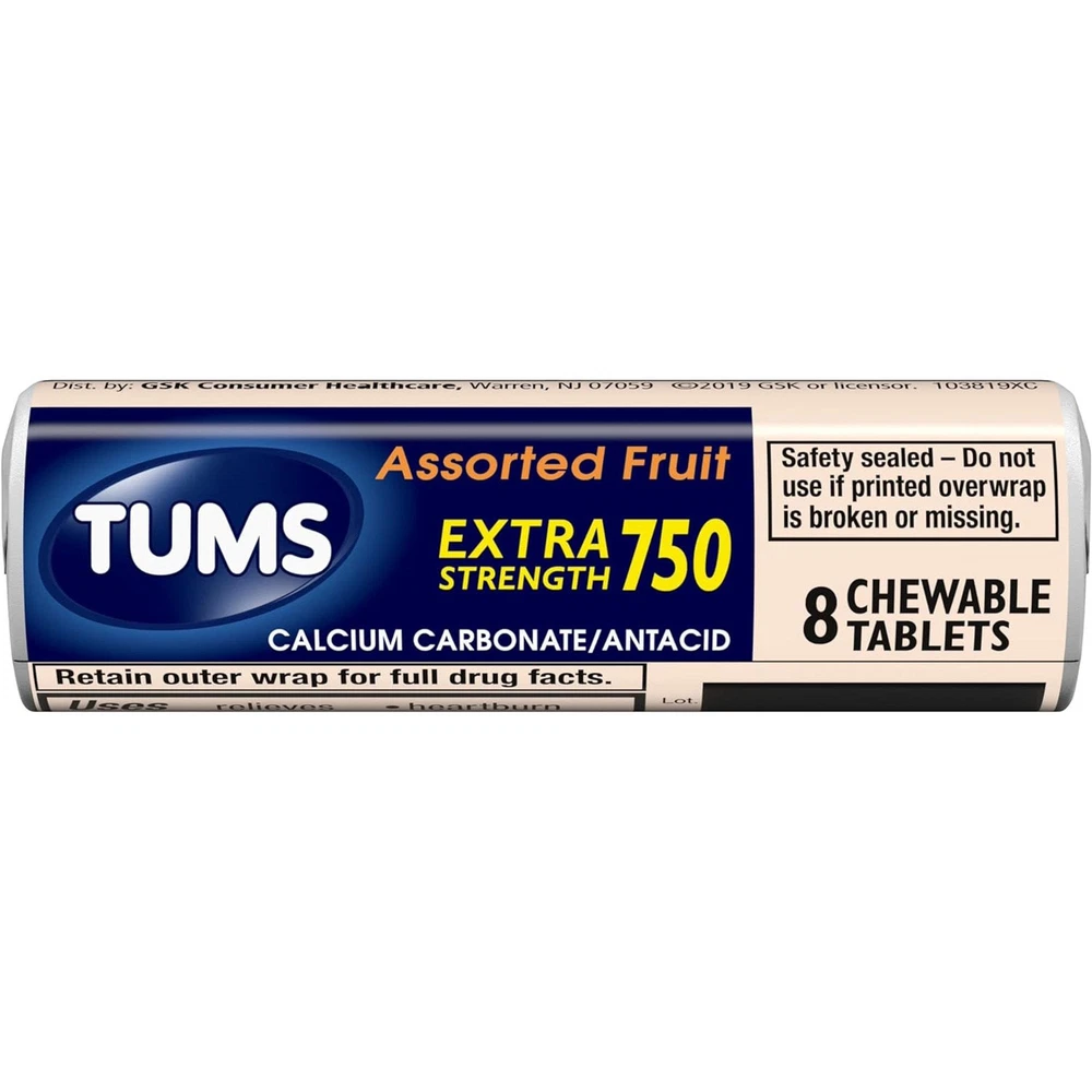 Product Description TUMS Extra Strength Assorted Berries Antacid Chewable Tablets for Heartburn Relief, 8 count (Pack Of 36) TUMS Chewable Antacid Tablets go to work in seconds, so you can forget your heartburn and get back to the moments that matter. TUMS extra strength antacid chewable tablets contain 50 percent more acid neutralizing power than regular strength TUMS, for fast acting relief. Each TUMS chewable antacid contains 750 mg calcium carbonate to quickly and effectively provide heartburn relief, sour stomach relief, acid indigestion relief and relief of upset stomach associated with these symptoms. TUMS heartburn medicine neutralizes acid on contact, giving you fast relief. Adults and children 12 years and older may chew two to four heartburn tablets, which come with pleasant assorted berry flavors, as symptoms occur or as directed by a doctor. Known as a trusted brand to fight heartburn fast for 90 years, TUMS is America’s #1 antacid and the #1 physician, pharmacist and OBGYN-recommended adult antacid brand. With TUMS assorted berries calcium carbonate tablets, you're ready when heartburn strikes. CONTENTS: 1 roll containing 8 TUMS Chewable Antacid Tablets for Extra Strength Heartburn Relief in easy to take, delicious assorted berry flavors MULTI-SYMPTOM RELIEF: Treats the four signs of heartburn: burning in the chest, acid indigestion, sour stomach and upset stomach FAST AND POWERFUL STRENGTH: Nothing works faster! These TUMS antacid tablets go to work instantly by starting to neutralize acid on contact GLUTEN FREE AND KOSHER: This heartburn and acid indigestion remedy has the active ingredient 750 mg calcium carbonate #1 DOCTOR RECOMMENDED: TUMS is the #1 recommended adult antacid brand by doctors, pharmacists and OBGYNs TRUSTED BRAND: America's #1 antacid, providing trusted heartburn relief for 90 years, supported by a satisfaction guarantee TUMS Extra Strength Assorted Berries chewable antacids offer fast acting, ultra strength heartburn relief so you can enjoy all of your favorite foods TUMS antacid tablets relieve heartburn, sour stomach, acid indigestion, and upset stomach associated with these symptoms Delivers double the acid neutralizing power per tablet of regular strength TUMS antacids Comes in a delicious assorted berries flavor and goes to work in seconds TUMS heartburn medicine is America’s number 1 antacid 8 Tablets Each Roll HSA AND FSA ELIGIBLE: HSA and FSA eligible product HSA and FSA eligible item Inactive Ingredients Adipic acid corn starch FD&C blue #1 lake FD&C red #40 lake flavors mineral oil sodium polyphosphate Ingredients Active Ingredients: Per tablet Calcium Carbonate USP 750mg - Antacid.; Inactive Ingredients: Adipic acid, corn starch, FD&C blue #1 lake, FD&C red #40 lake, flavors, mineral oil, sodium polyphosphate. Active Ingredients Calcium carbonate 750 mg Active Ingredient Name Calcium Carbonate